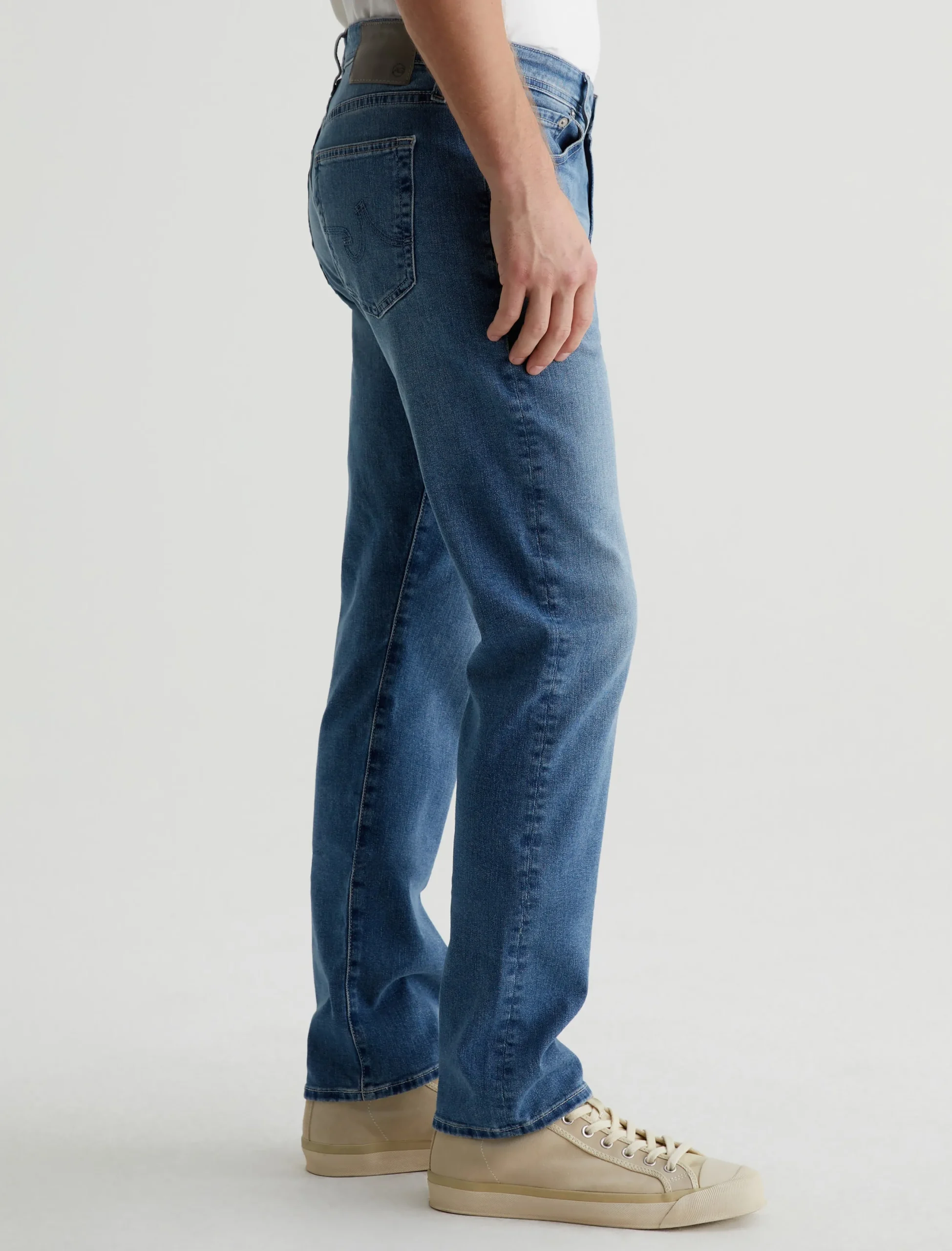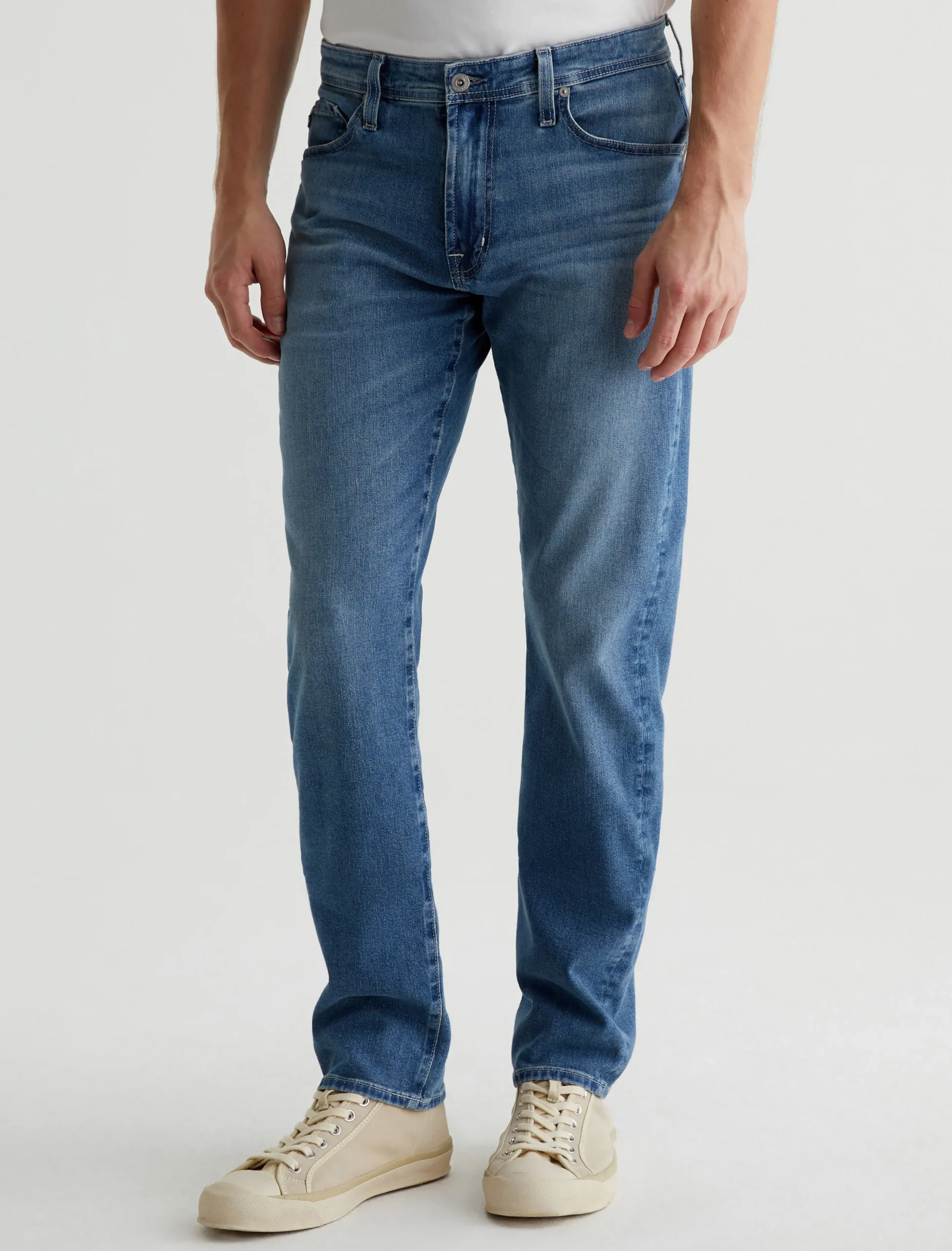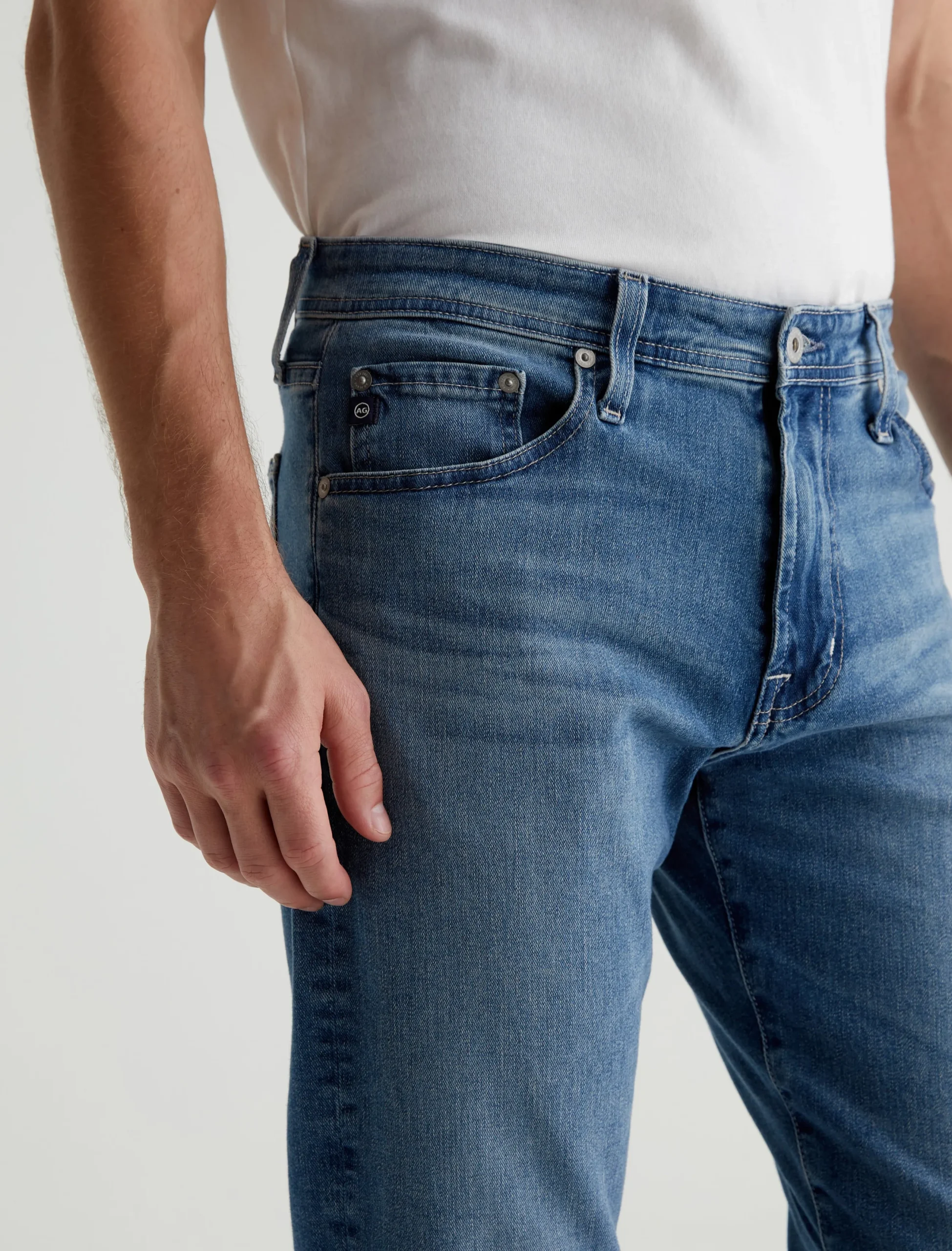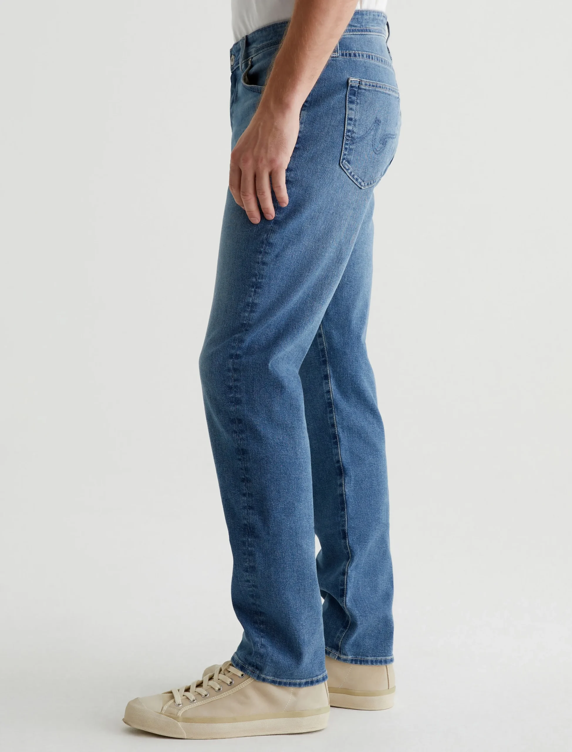 Everett is a five-pocket slim straight jean for men, done here in a faded medium blue wash. The style has a mid-rise waist and a straight fit that’s relaxed from hip to knee before slightly tapering at the leg opening. These slim straight men’s jeans feature 9.4 oz. Hyper Soft Indigo Denim, our exclusive AG Cloud Soft Denim™ fabric with a velvety texture. The special left-hand twill construction allows the yarns to gently relax and untwist for a supple feel that gets even softer with wear. It’s got dual-elastic performance fibers built in for added stretch and recovery.