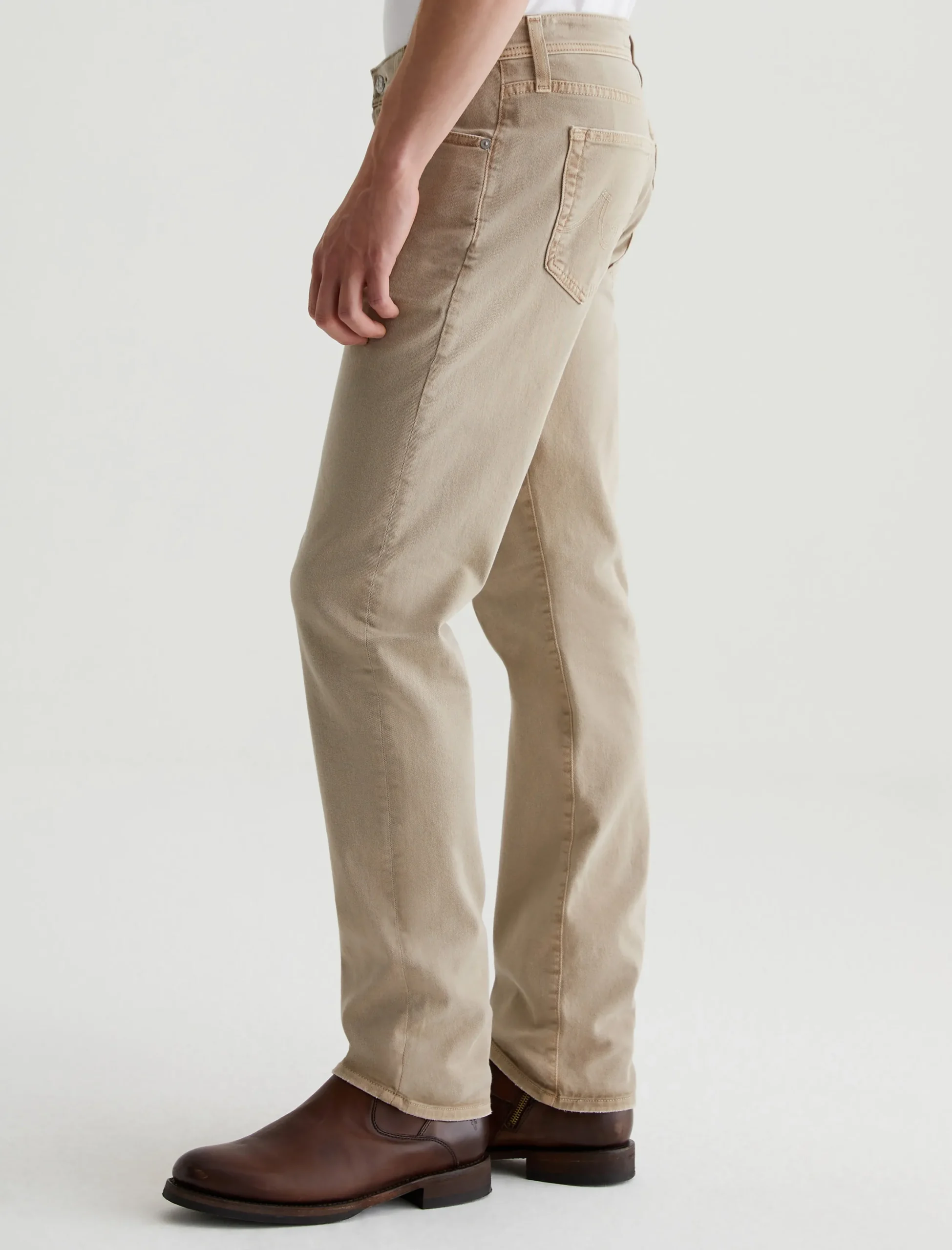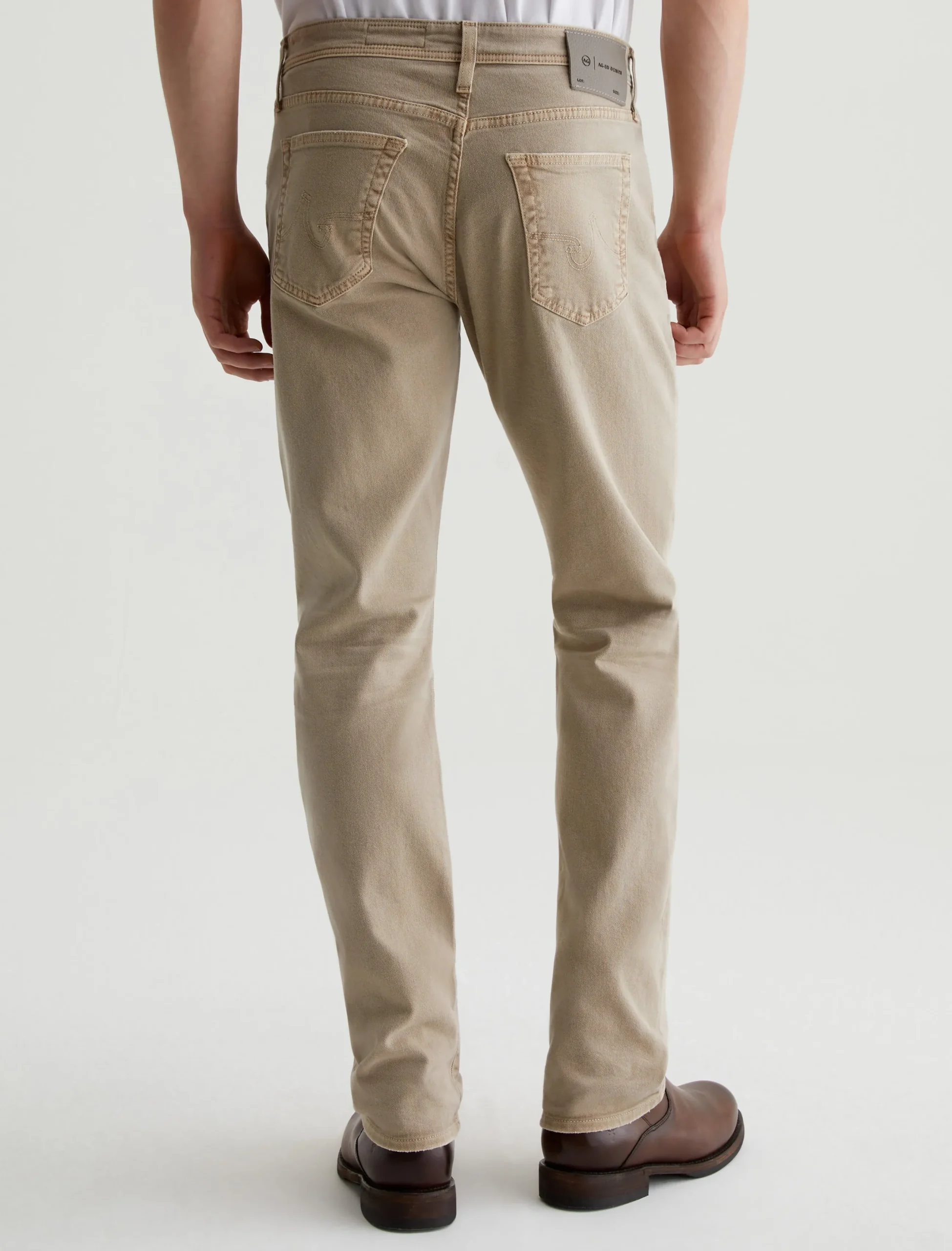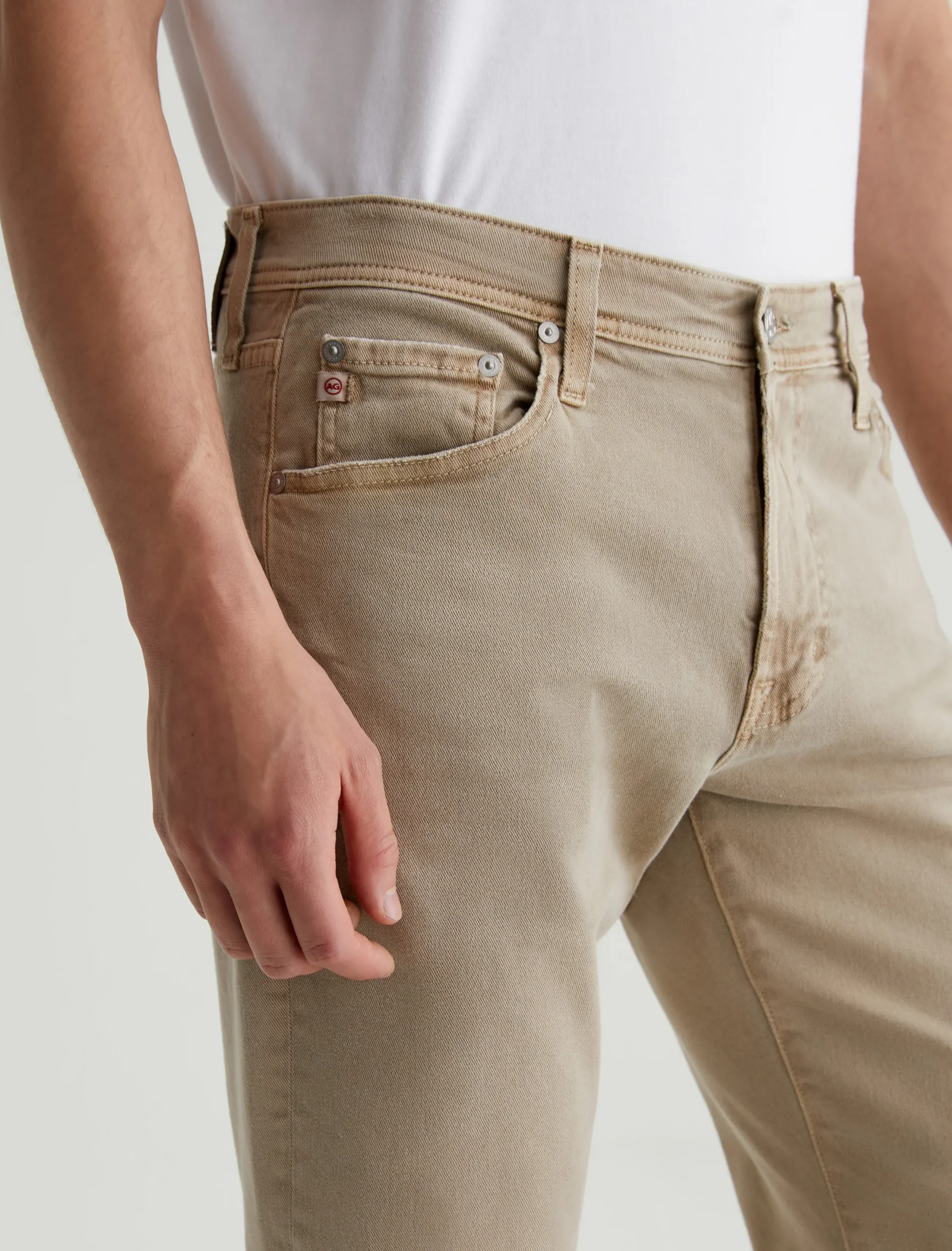 The Everett is a slim-straight men’s jean in a sulfur-dyed khaki shade. AG-ed™ fading and worn pocket edges lend an authentic lived-in look. The style has a mid-rise waist and a straight fit that’s relaxed from hip to knee before slightly tapering at the leg opening. These slim-straight men’s jeans feature 8.7 oz. Hyper Soft White Bull Denim, our exclusive AG Cloud Soft Denim™ fabric with a velvety texture. The special left-hand twill construction allows the yarns to gently relax and untwist for a supple feel that gets even softer with wear. It’s got dual-elastic performance fibers built in for added stretch and recovery.