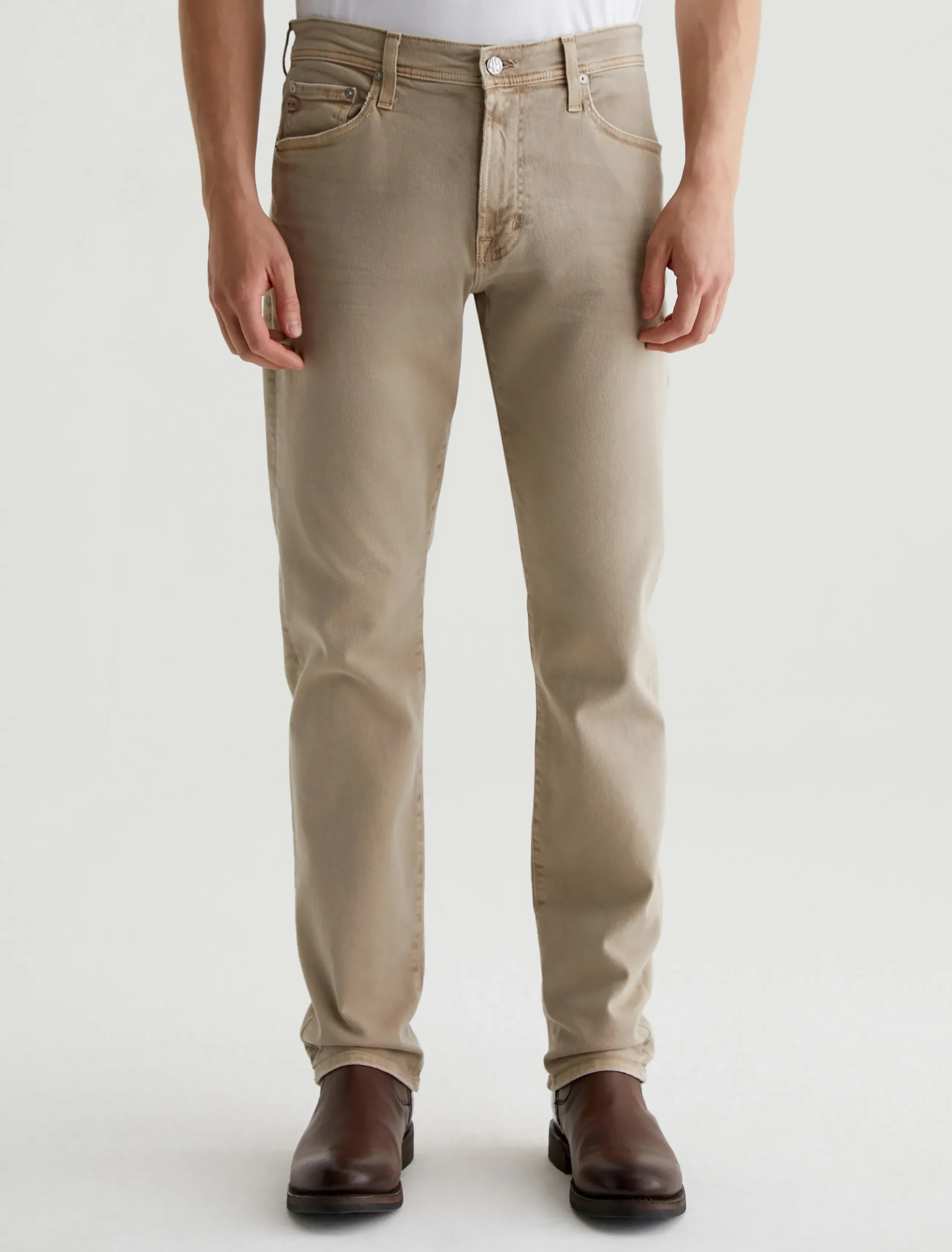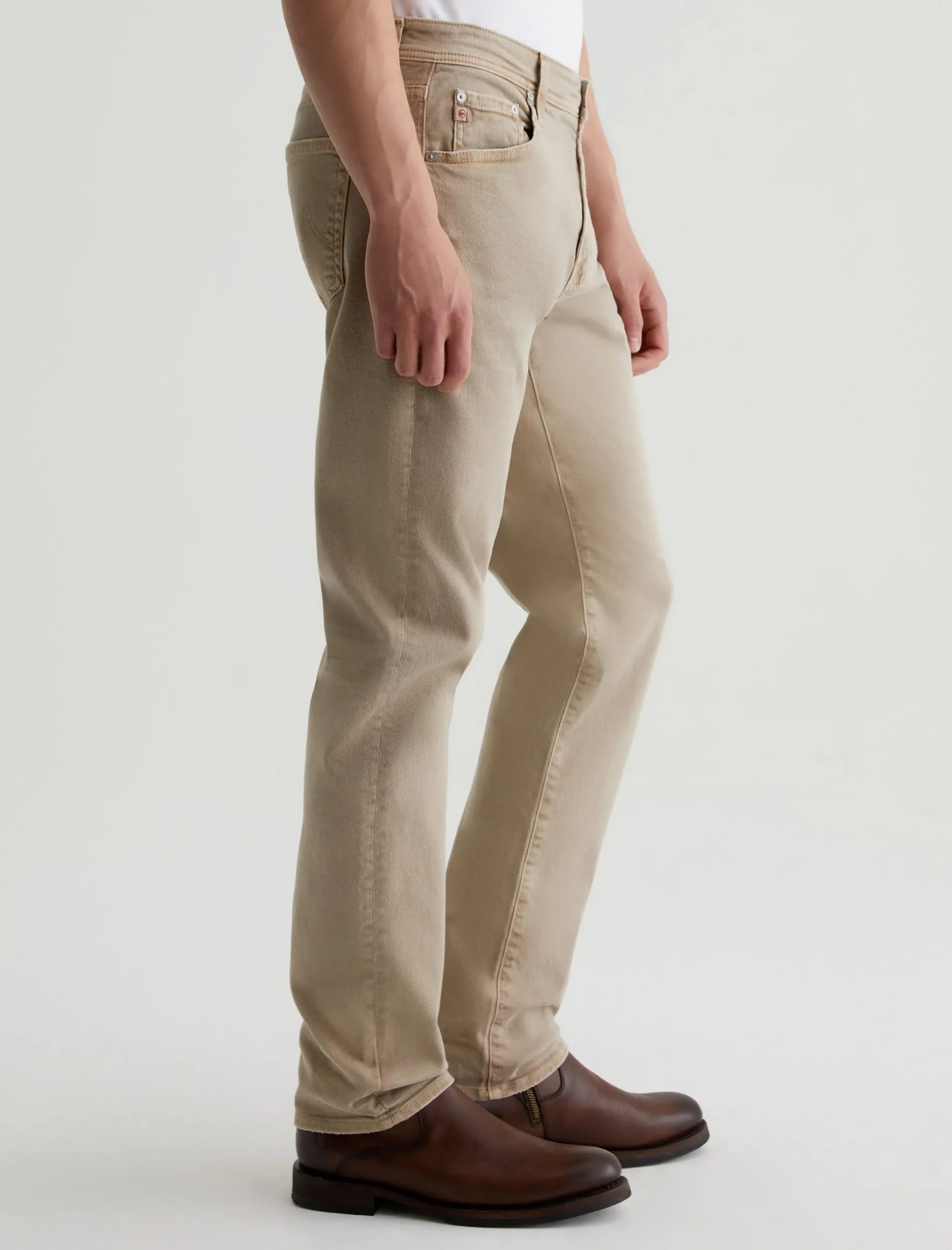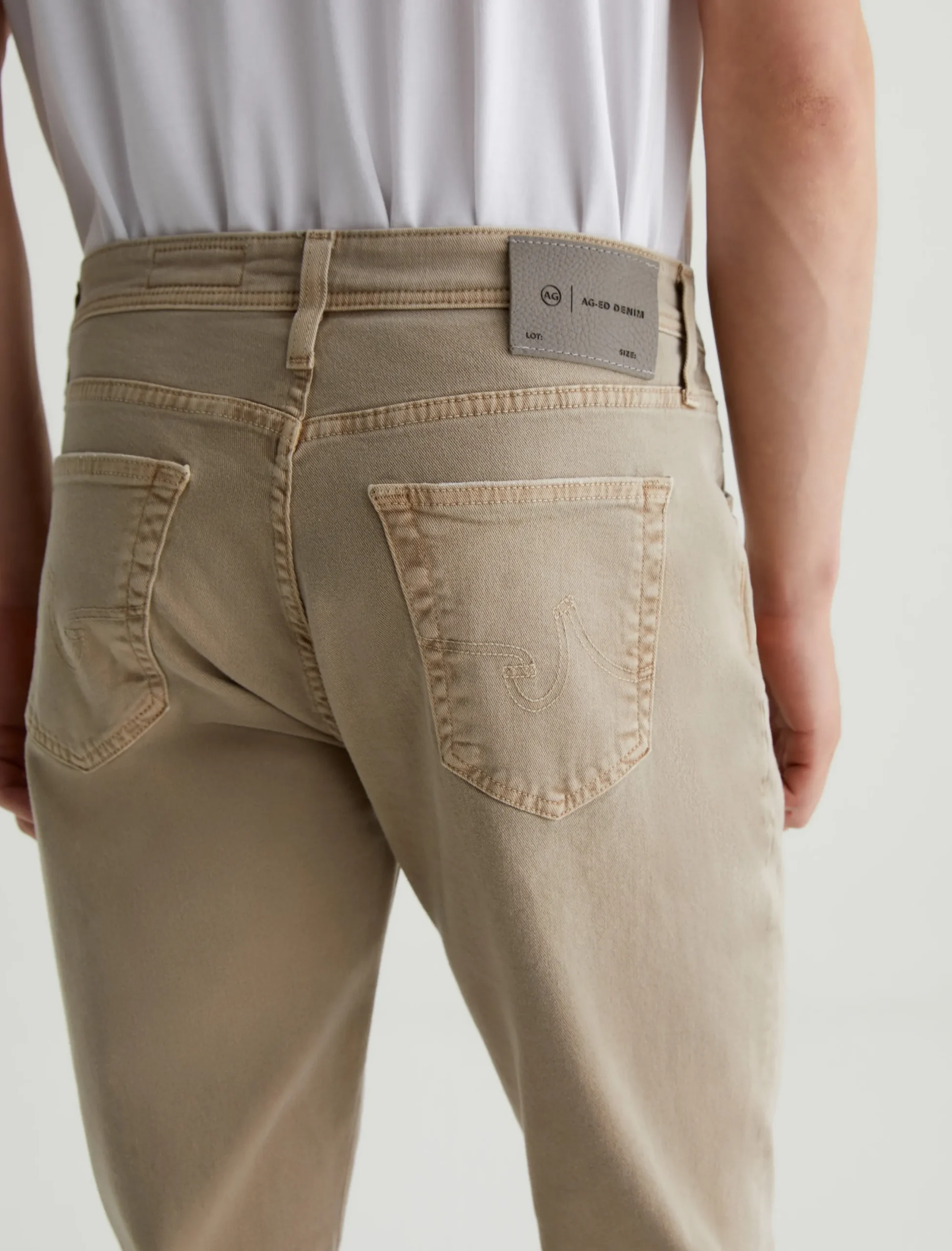 The Everett is a slim-straight men’s jean in a sulfur-dyed khaki shade. AG-ed™ fading and worn pocket edges lend an authentic lived-in look. The style has a mid-rise waist and a straight fit that’s relaxed from hip to knee before slightly tapering at the leg opening. These slim-straight men’s jeans feature 8.7 oz. Hyper Soft White Bull Denim, our exclusive AG Cloud Soft Denim™ fabric with a velvety texture. The special left-hand twill construction allows the yarns to gently relax and untwist for a supple feel that gets even softer with wear. It’s got dual-elastic performance fibers built in for added stretch and recovery.