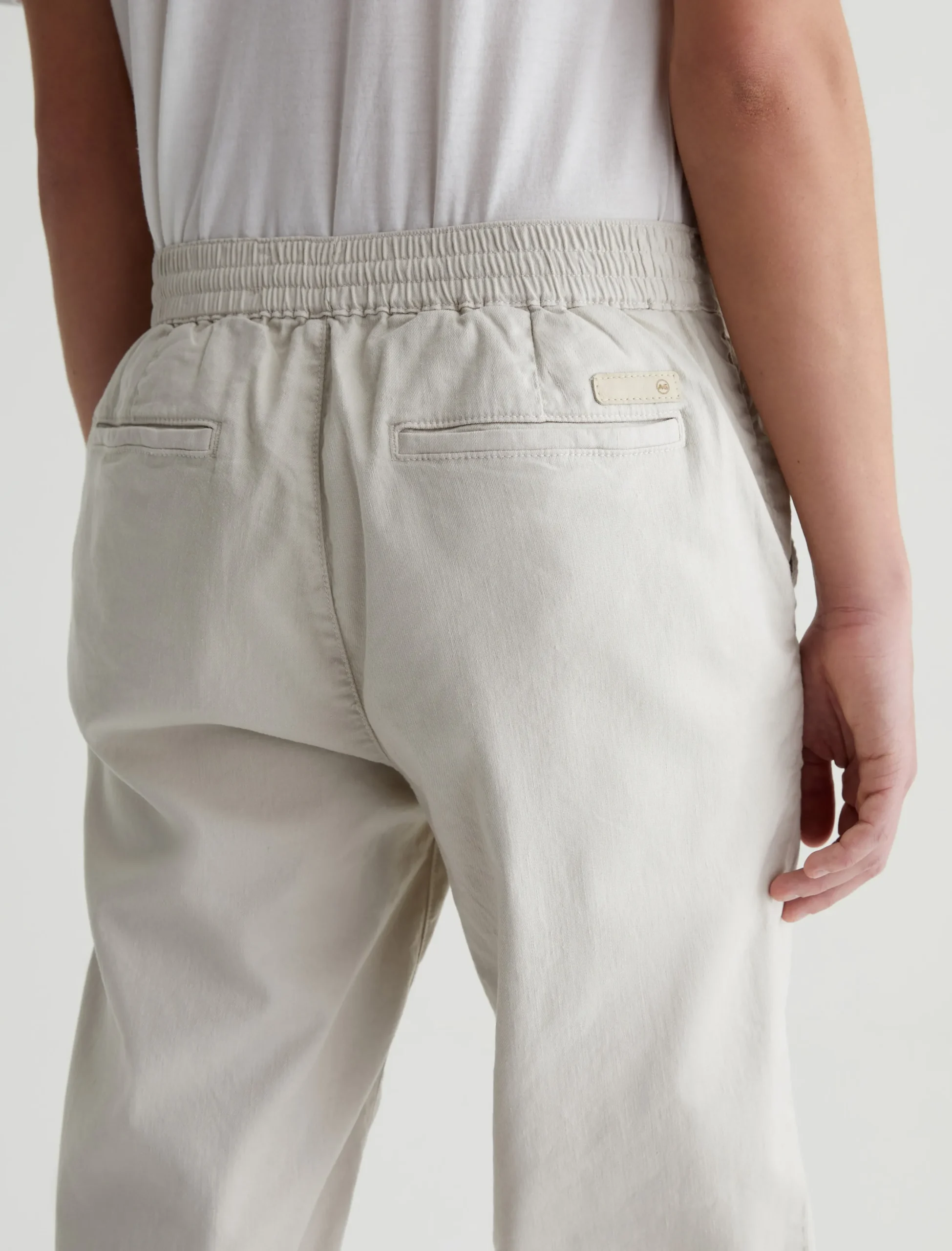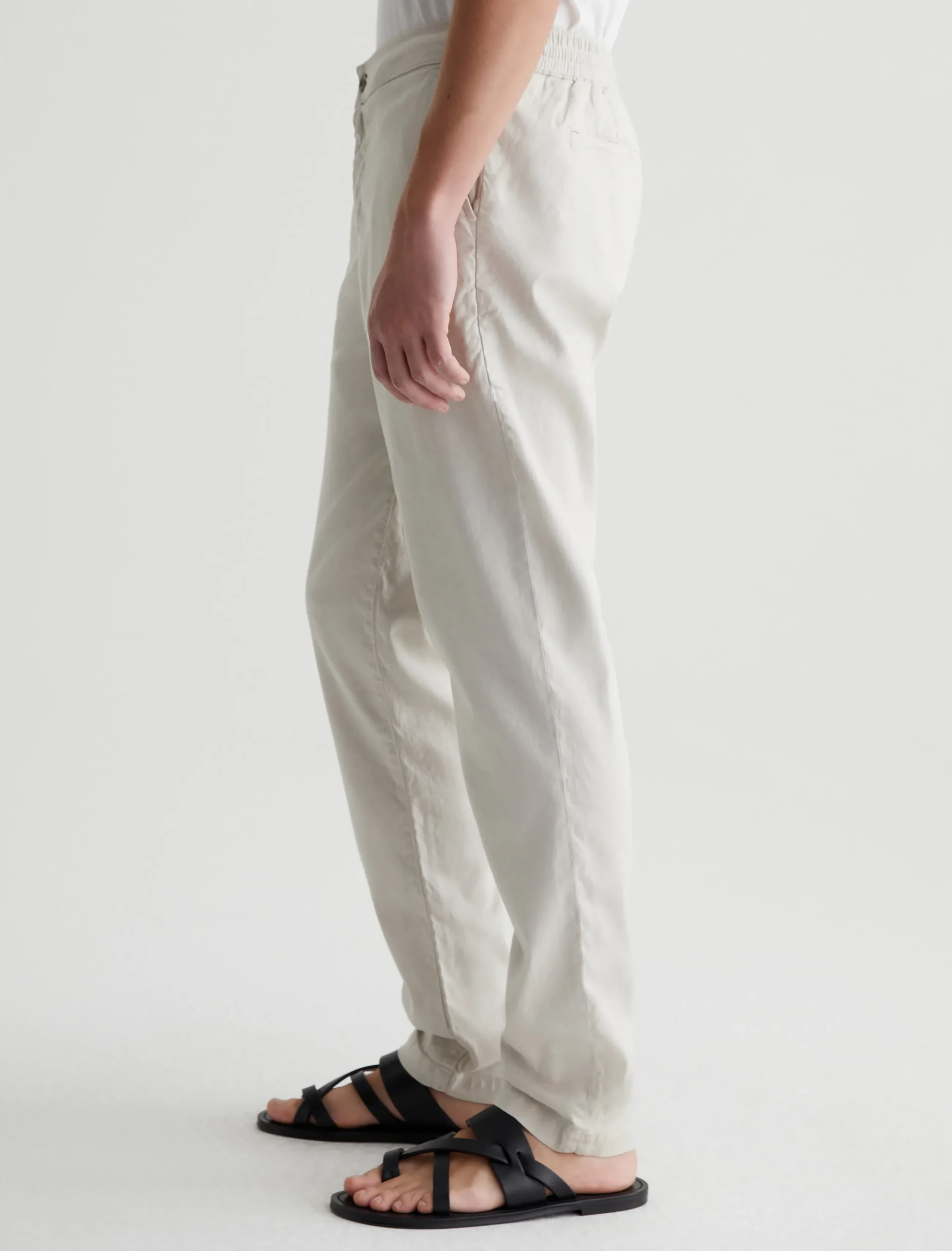 Our Garreth slim-cut jogger pants have a relaxed, airy feel in stretch-blend linen twill. The pale grey pair has trouser-style pockets and a partially elasticized waistband with a zip fly, button closure, and adjustable drawstring.