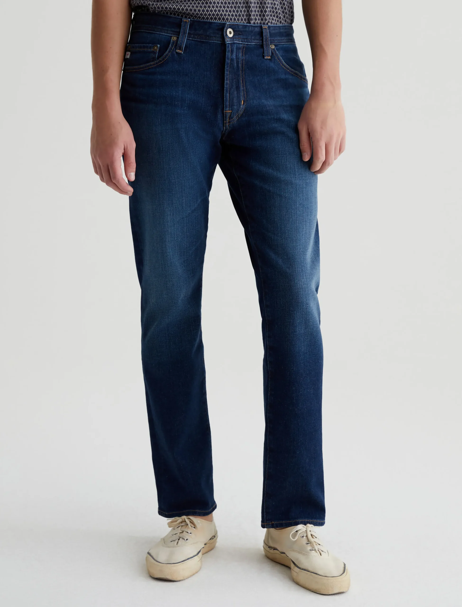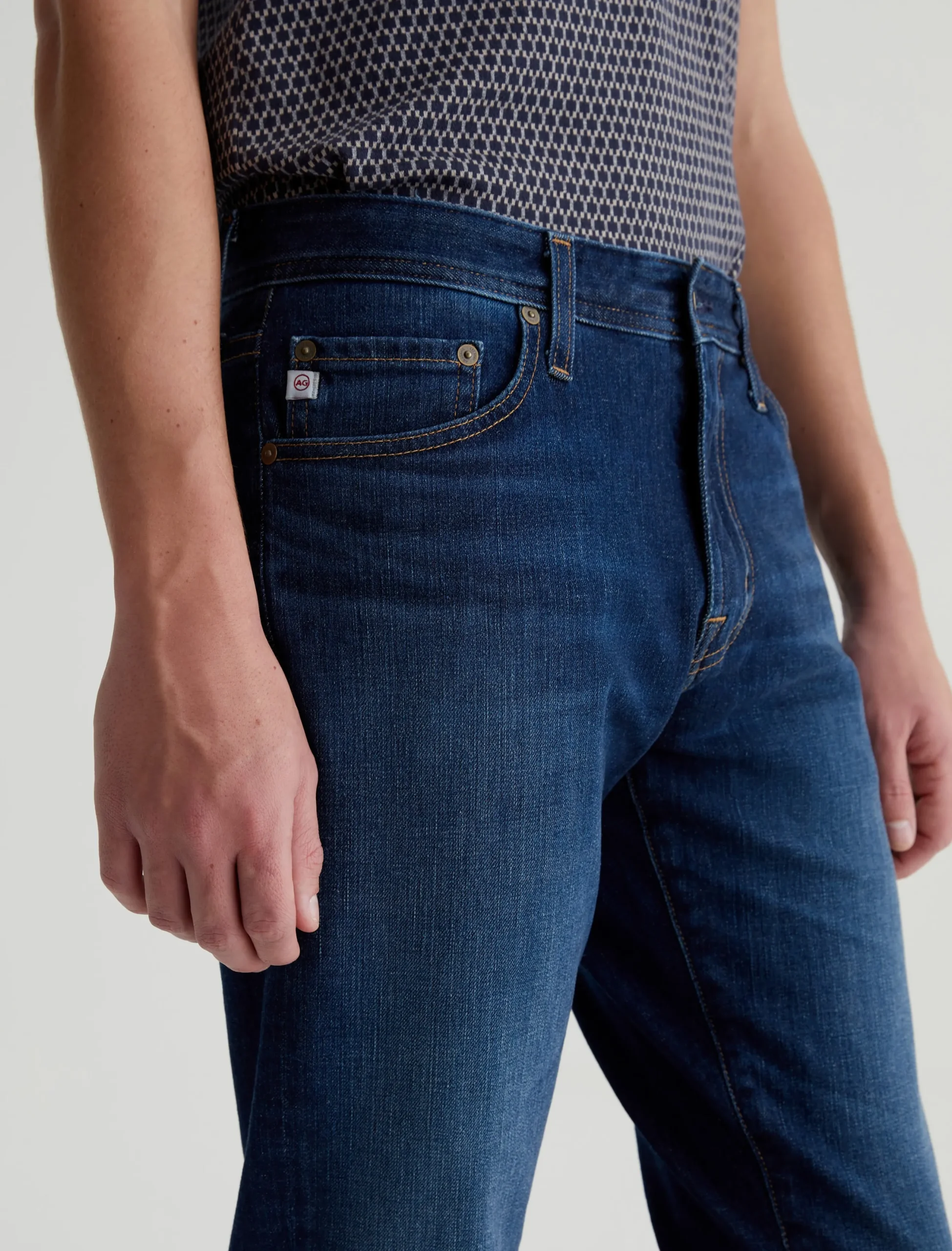 The Graduate is a tailored leg jean for men, done here in a dark blue wash with fading and whisking. Made from ultra-comfortable 11.5 oz. 360° Denim, these 5-pocket jeans have a slim mid-rise waist and a relaxed fit from the hip to knee before tapering at the leg opening. Finished with classic marigold stitching.