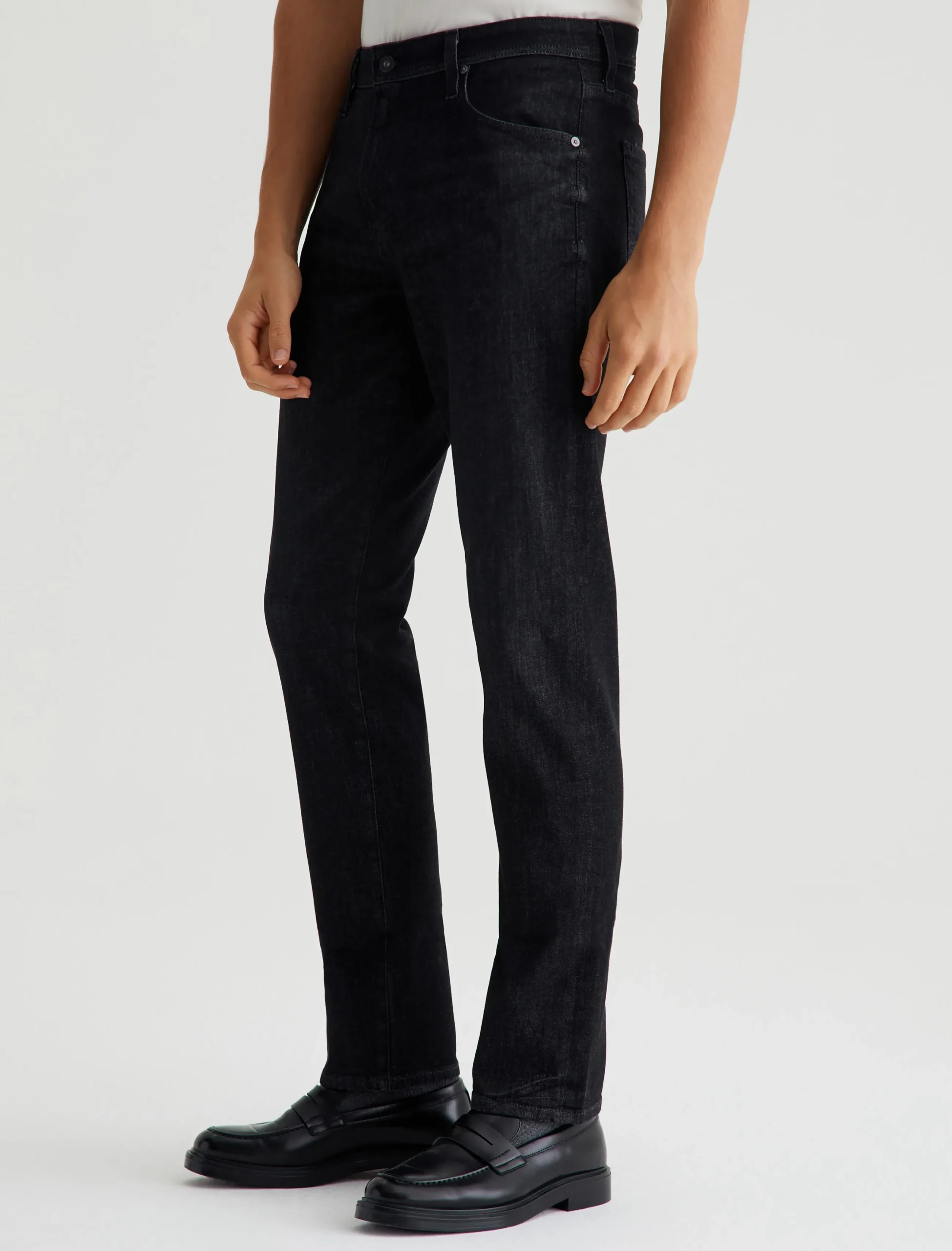 Graduate is a tailored leg jean for men, designed in 10.5 oz. Infinite Bi-Stretch Black denim with subtle whiskering. Cut with a slim mid-rise waist, the five-pocket style has a relaxed fit from the hip to the knee before tapering down at the leg opening.