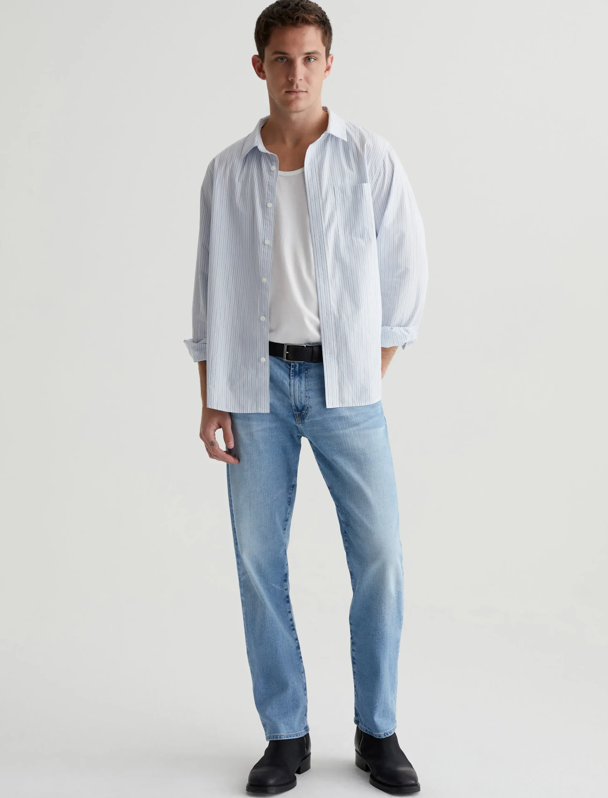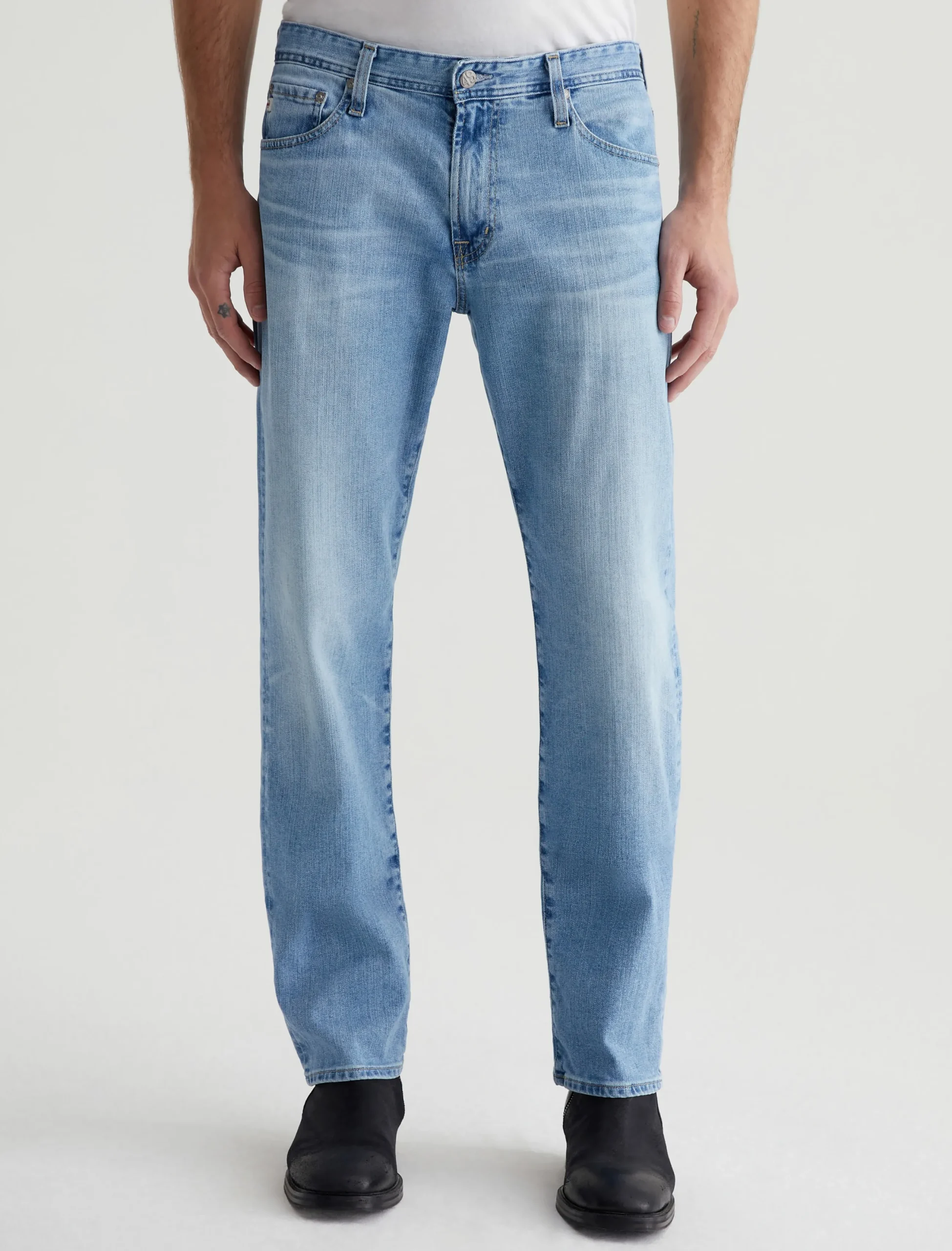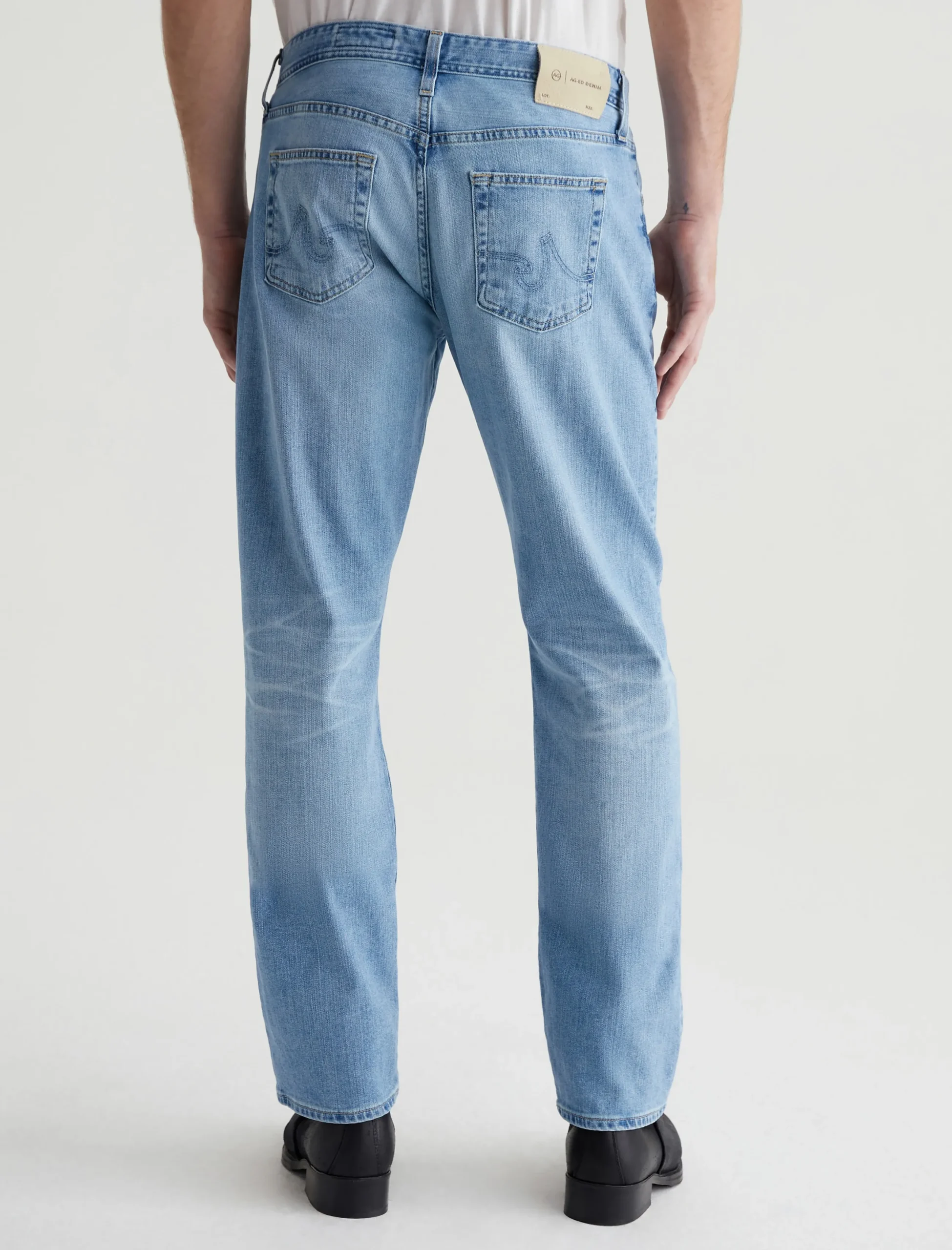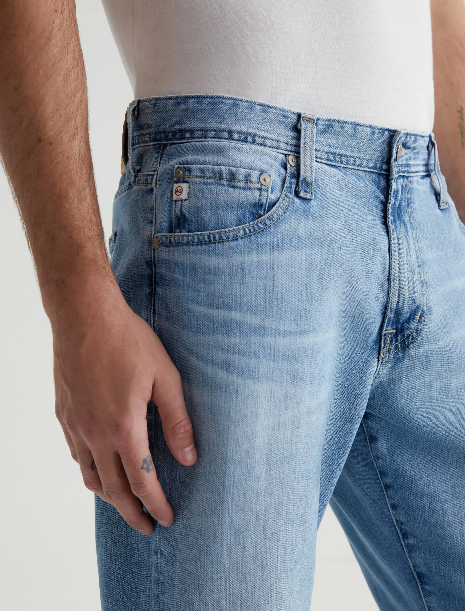 The Graduate is a tailored leg jean for men. It’s done here in 11 oz. Lead Denim with comfort stretch and an AG-ed™ light indigo wash that mimics 21 years of vintage wear. These men’s jeans are cut with a slim mid-rise waist and a relaxed fit from the hip to knee before tapering at the leg opening.