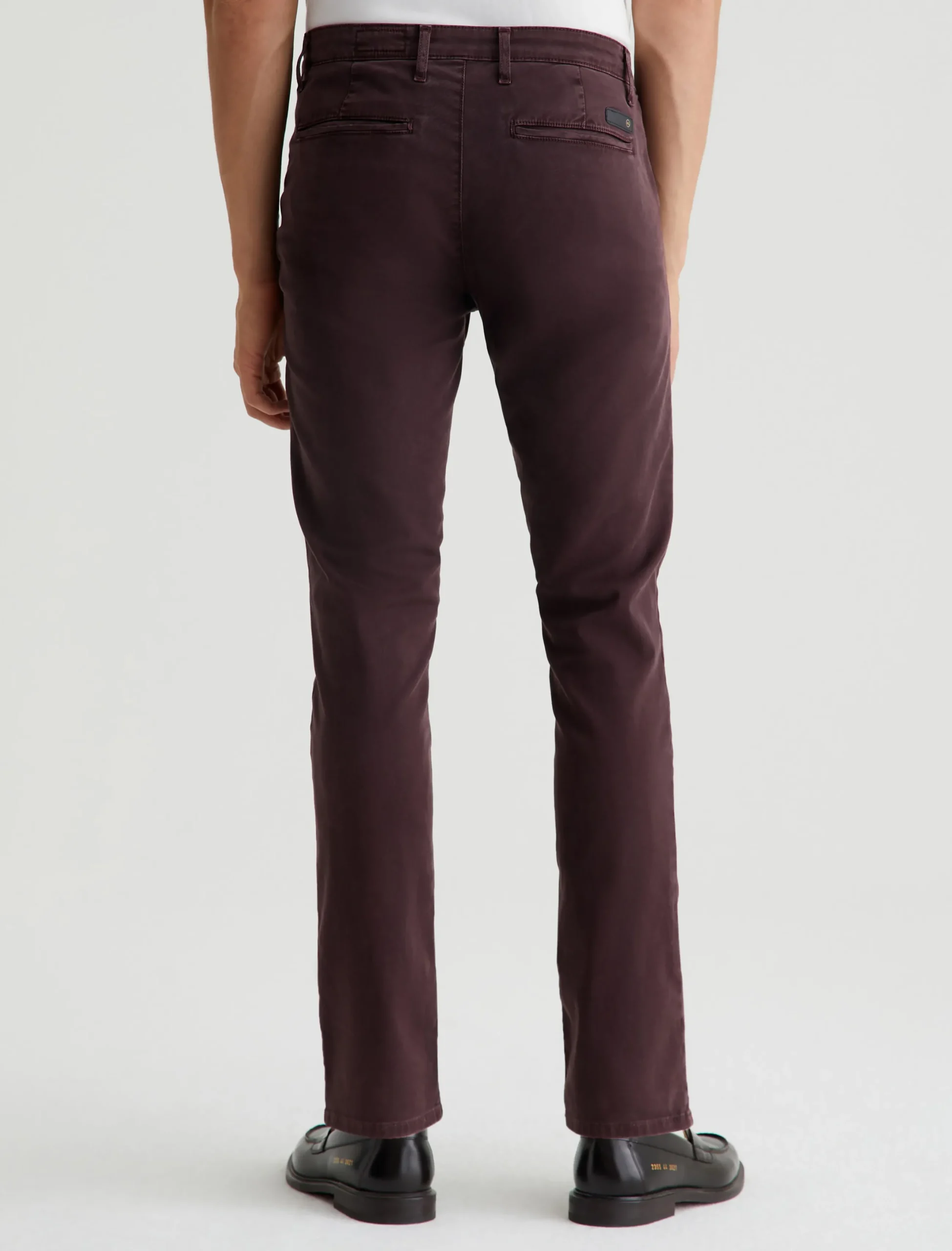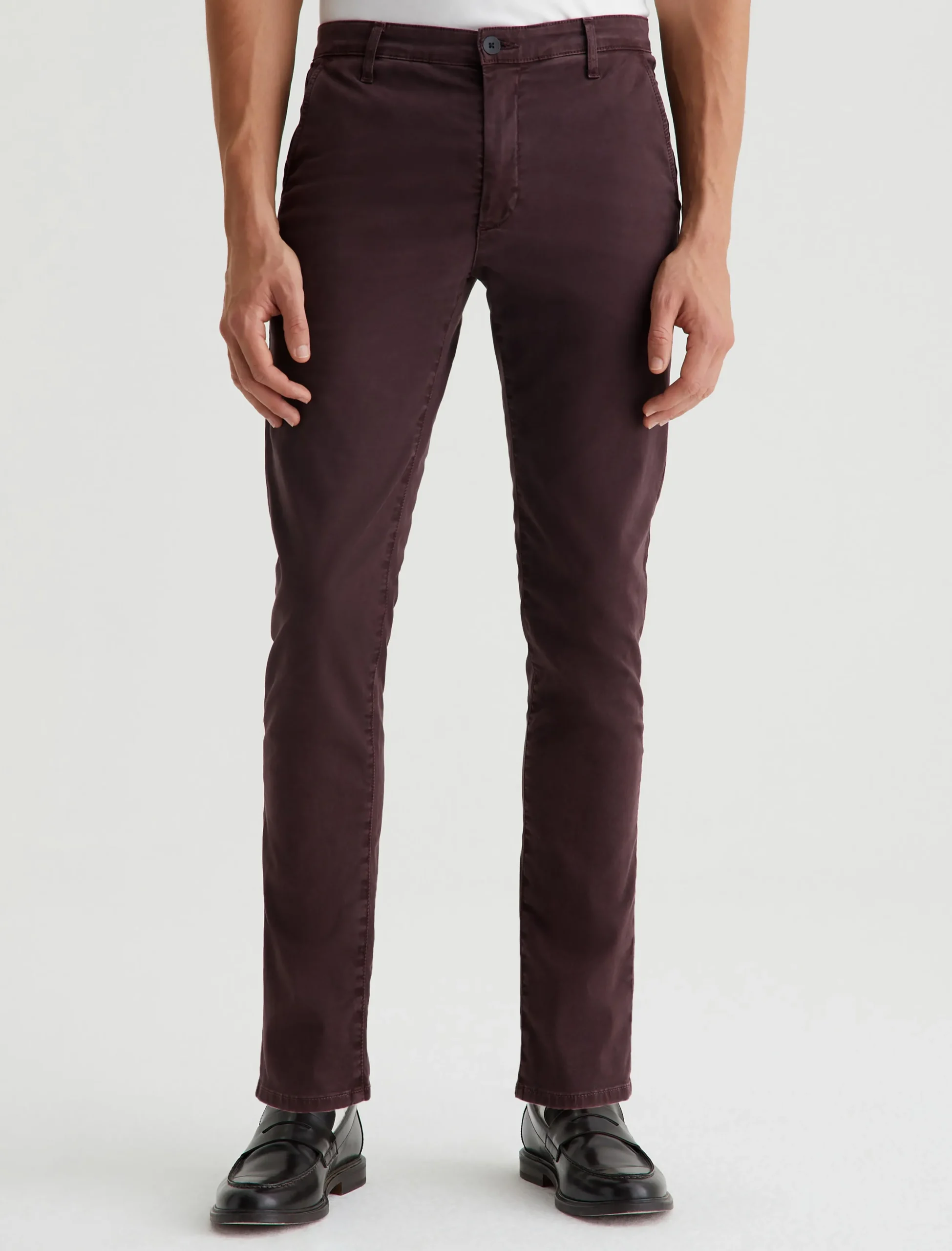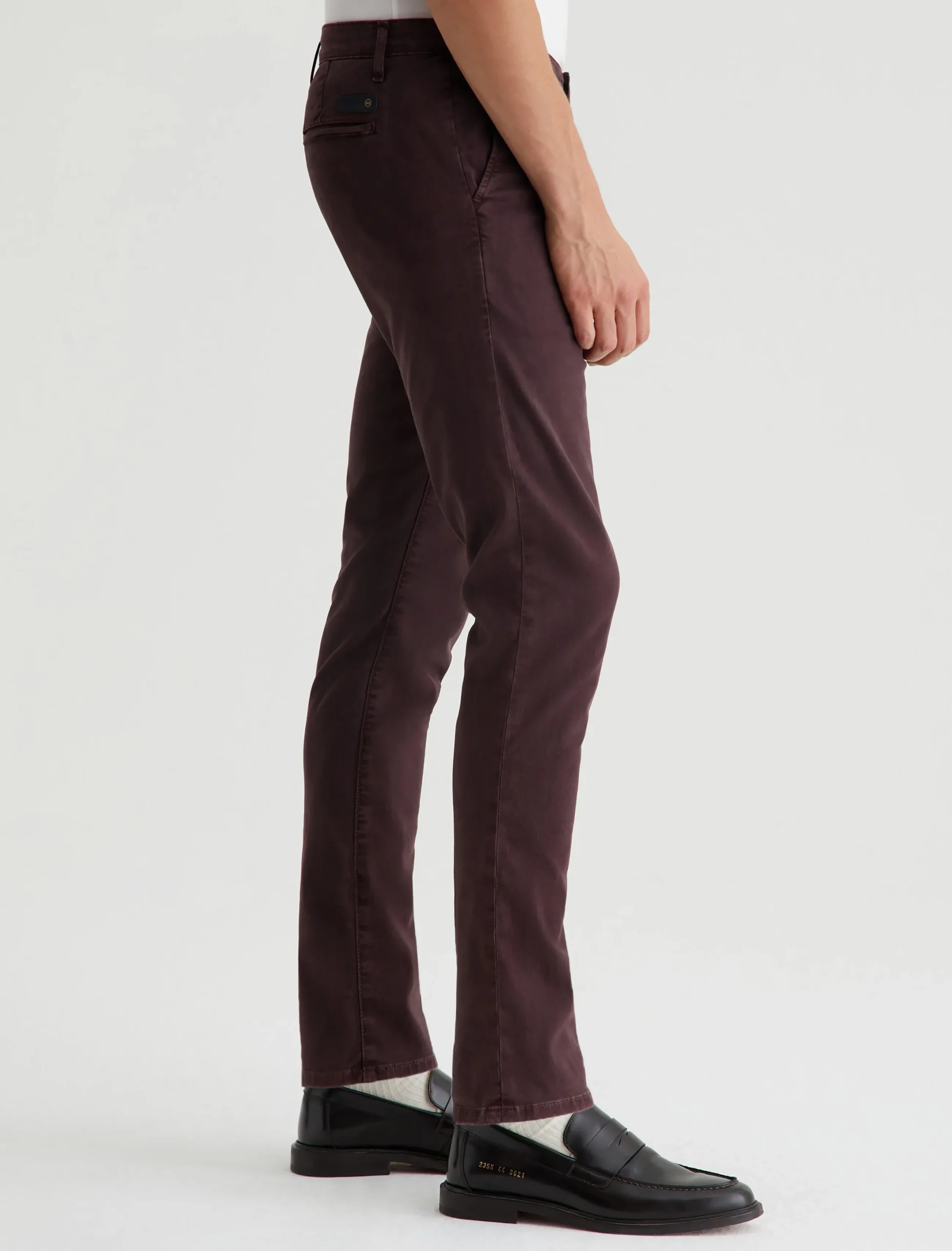 Jamison is a skinny trouser cut from 7.9 oz. Sorrento Stretch Twill in a sulfur-dyed burgundy shade. The tailored style has a slim upper block and tapered leg openings. Slant front pockets and welt pockets at the back complete the tailored look..