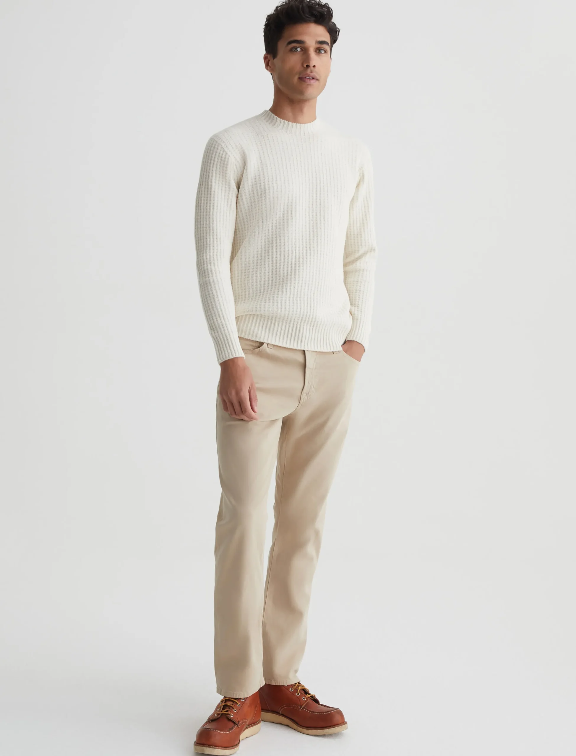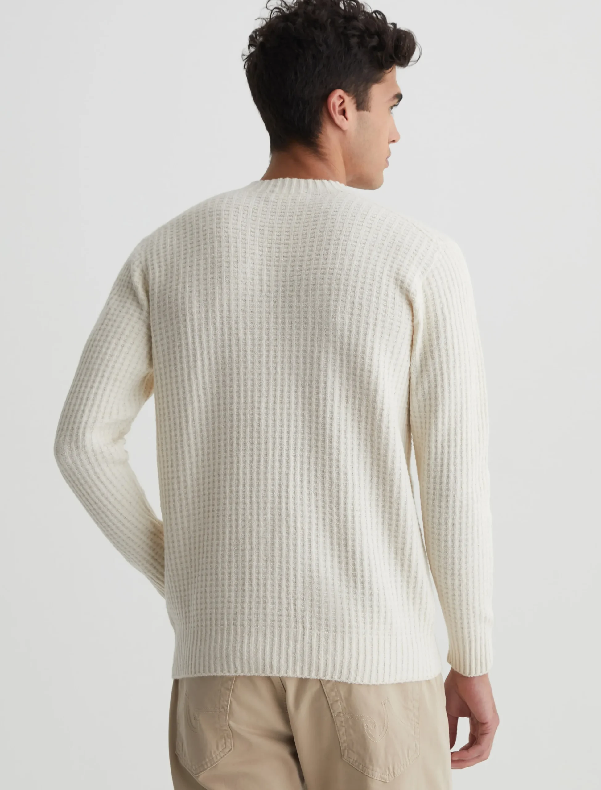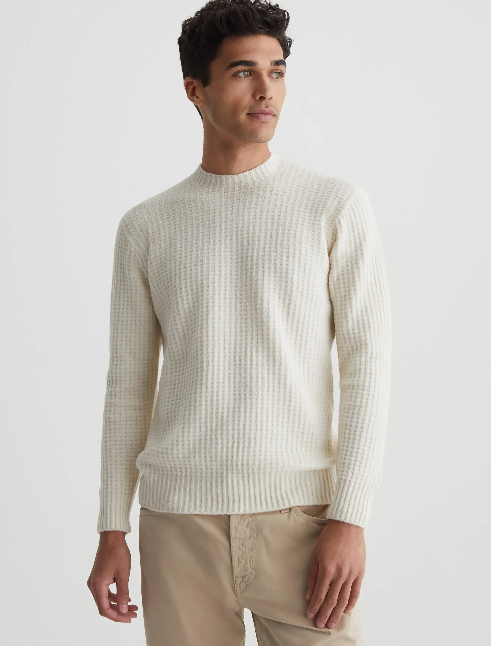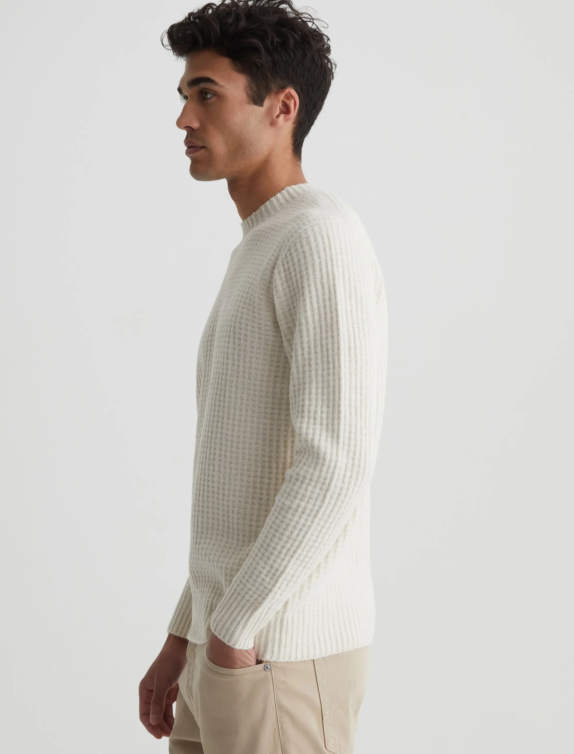 The Jayson Crew is a slim-fit crewneck sweater with long sleeves, waffle detailing, and a versatile ivory shade. Spun from a soft blend wool, it’s a luxe staple to wear on its own or layered under a jacket.