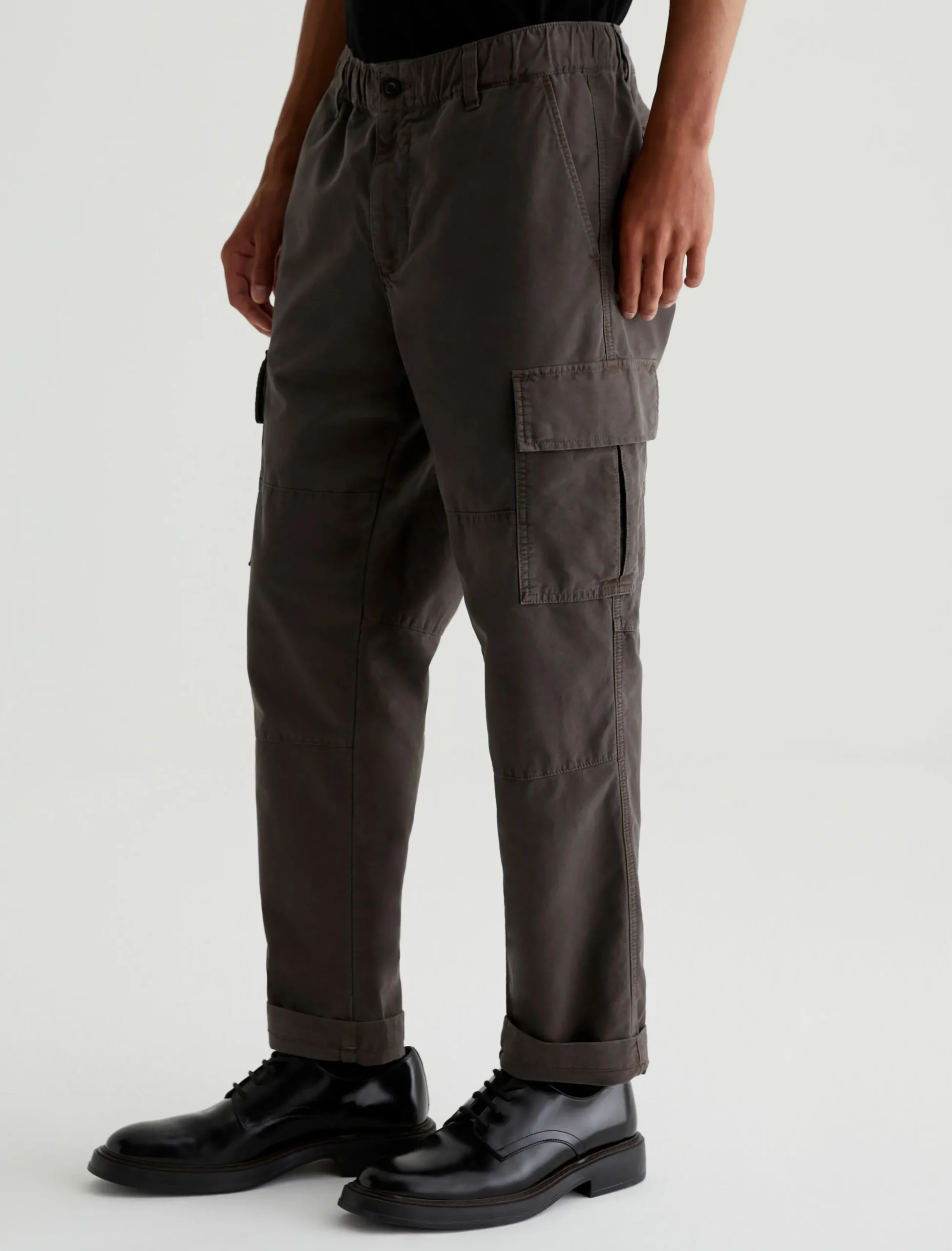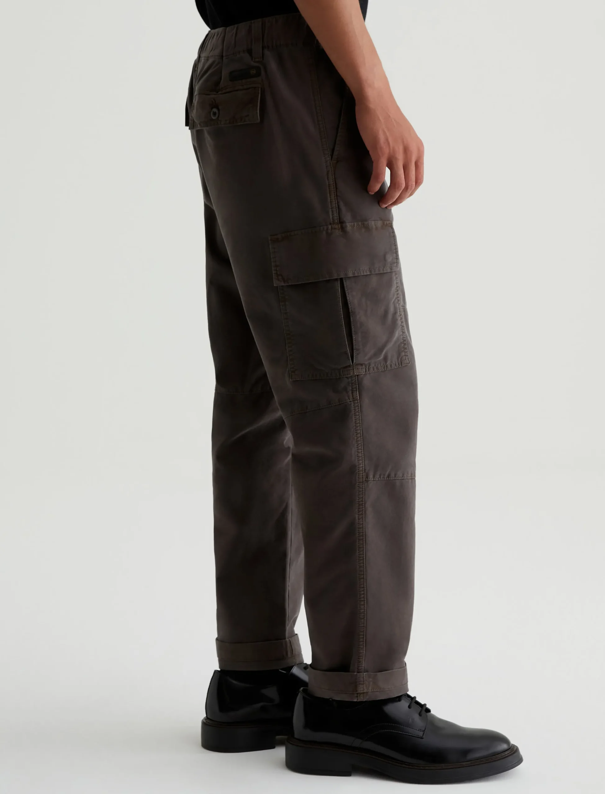 The Kace 28 Cargo pants combine a modern straight-leg fit with utility-inspired details—paneled knees, cargo pockets at the sides, and flap pockets at the back. Cut from our 6.9 oz. Flex Cotton Blend in dark grey, the mid-rise pair has a relaxed fit from hip to knee before tapering to a cuff-ready leg opening. It’s got a comfortable elasticized waistband with a zip fly and button closure, plus an interior drawstring so you can adjust the fit.