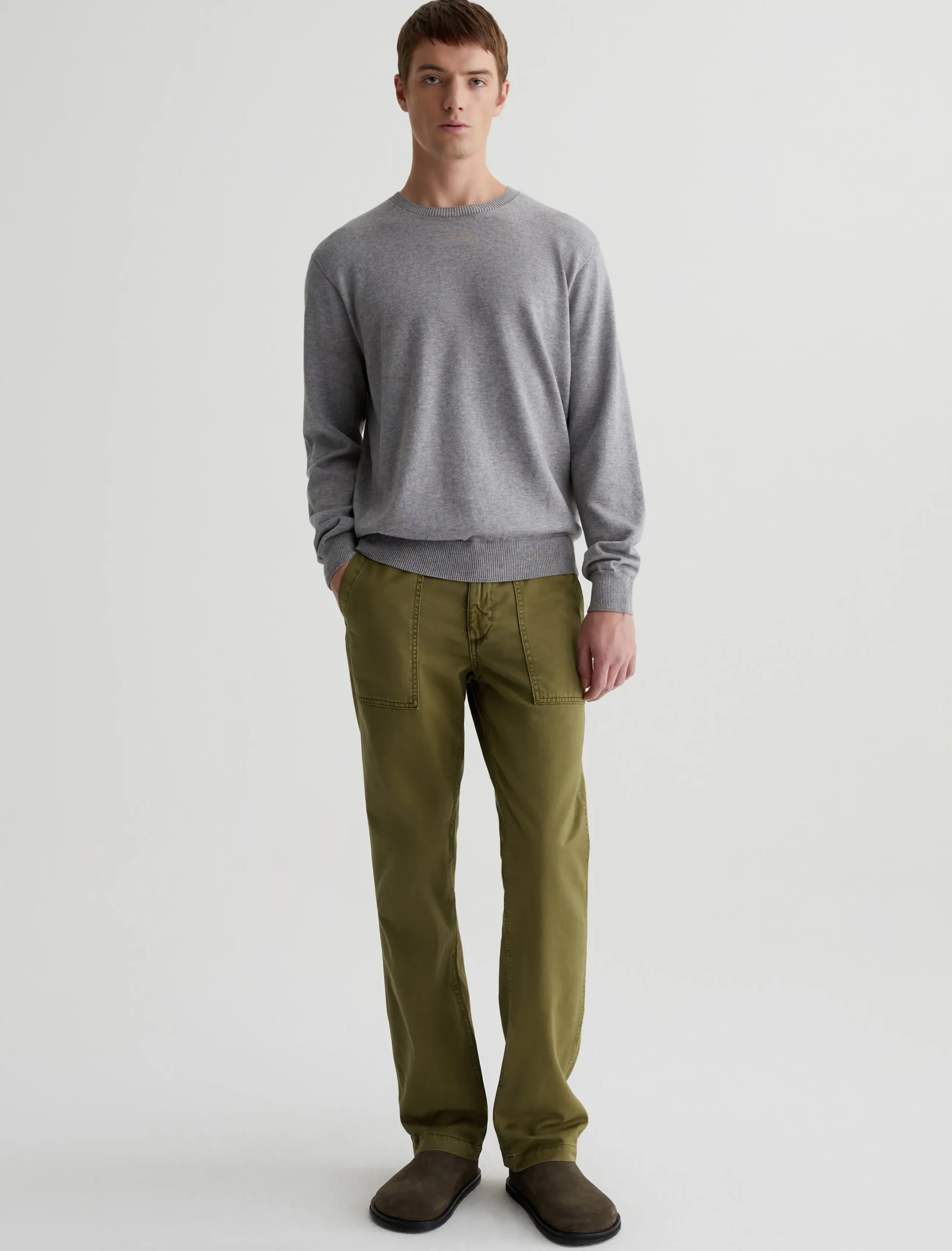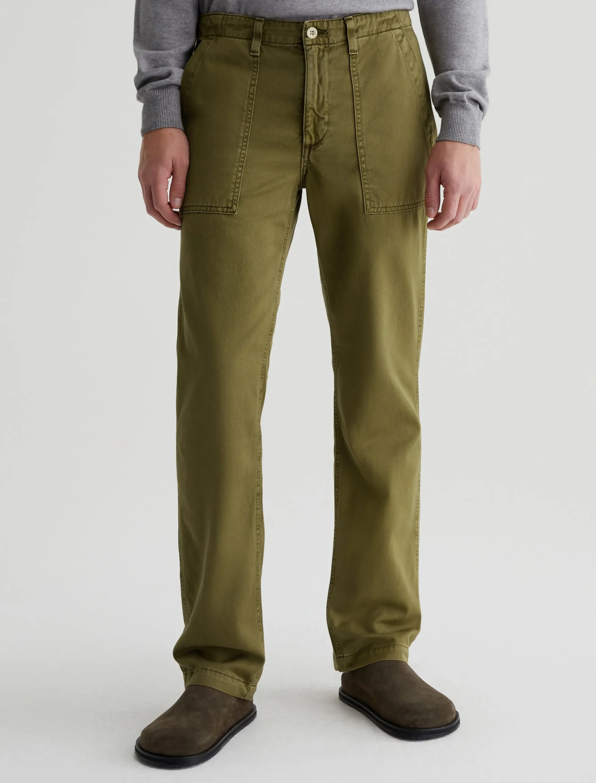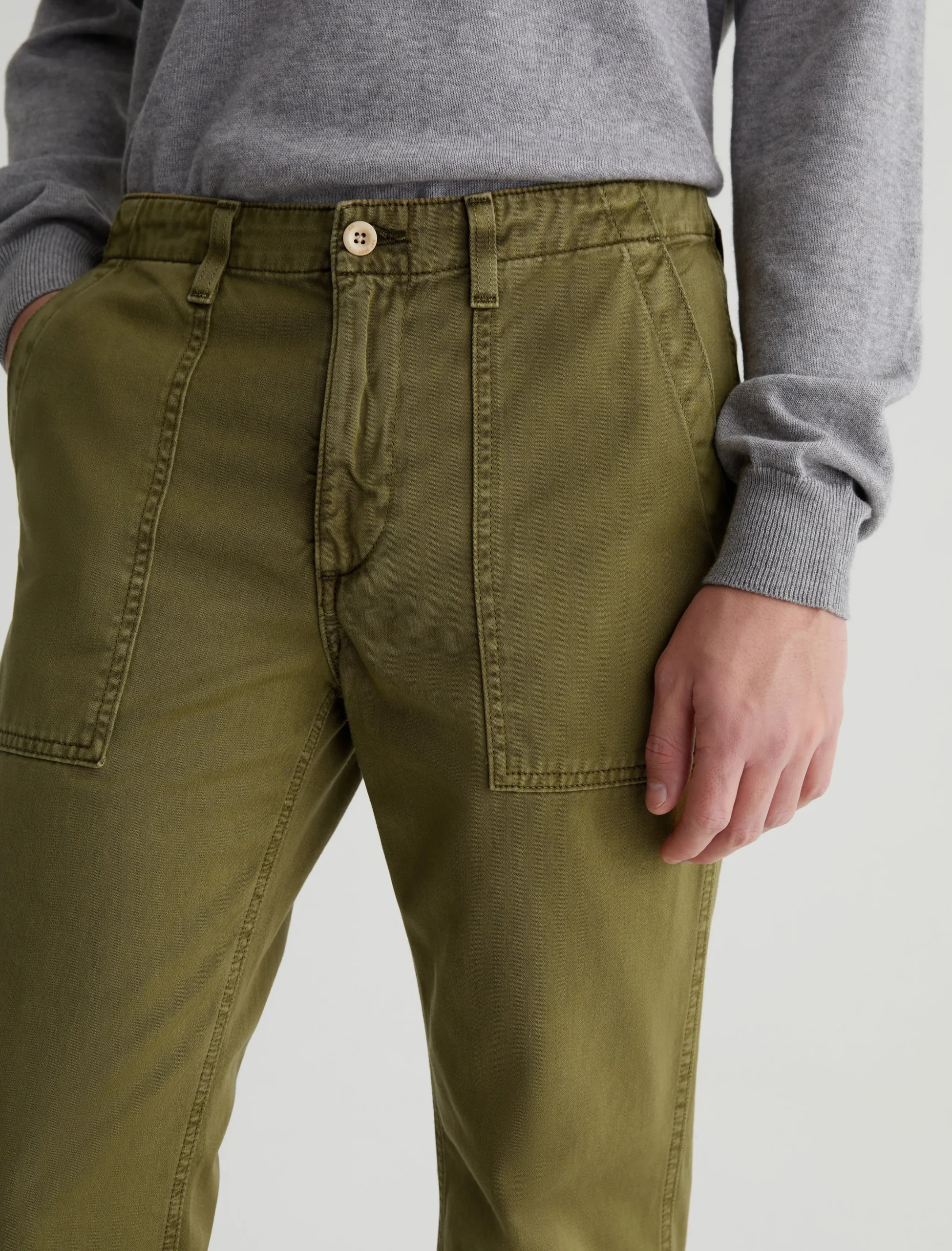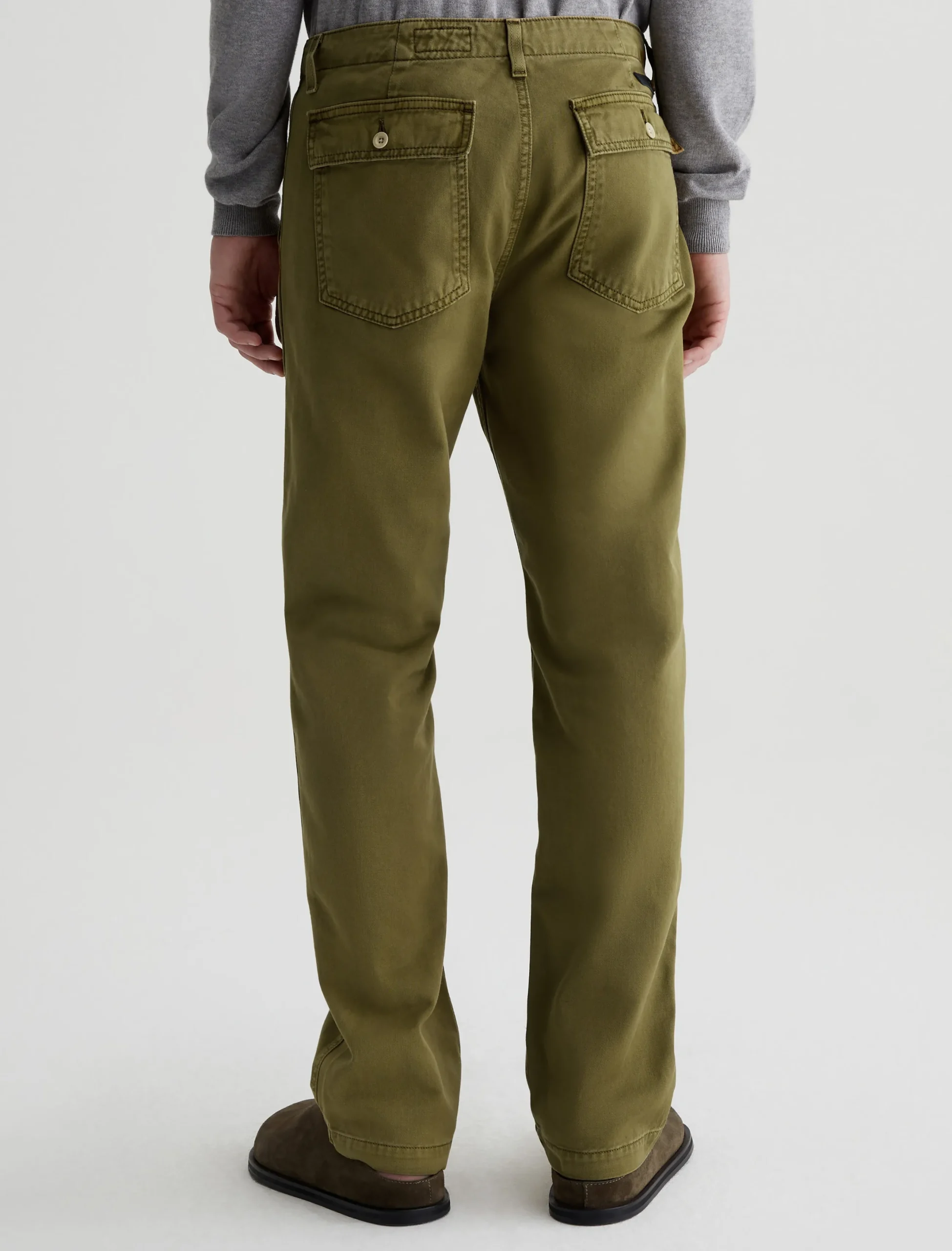 Our Kace Fatigue pants feature a classic straight-leg silhouette with utility-inspired pockets. Crafted from 7 oz. Sternway Sheen Sateen, this pair features 100% cotton in a sulfur-dyed army green shade. The style has a mid-rise waist and a relaxed fit from hip to the knee before tapering at the leg opening.