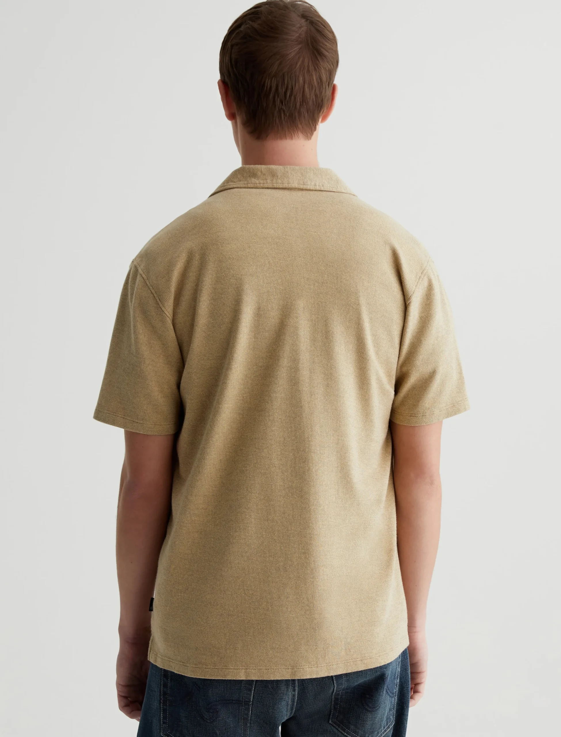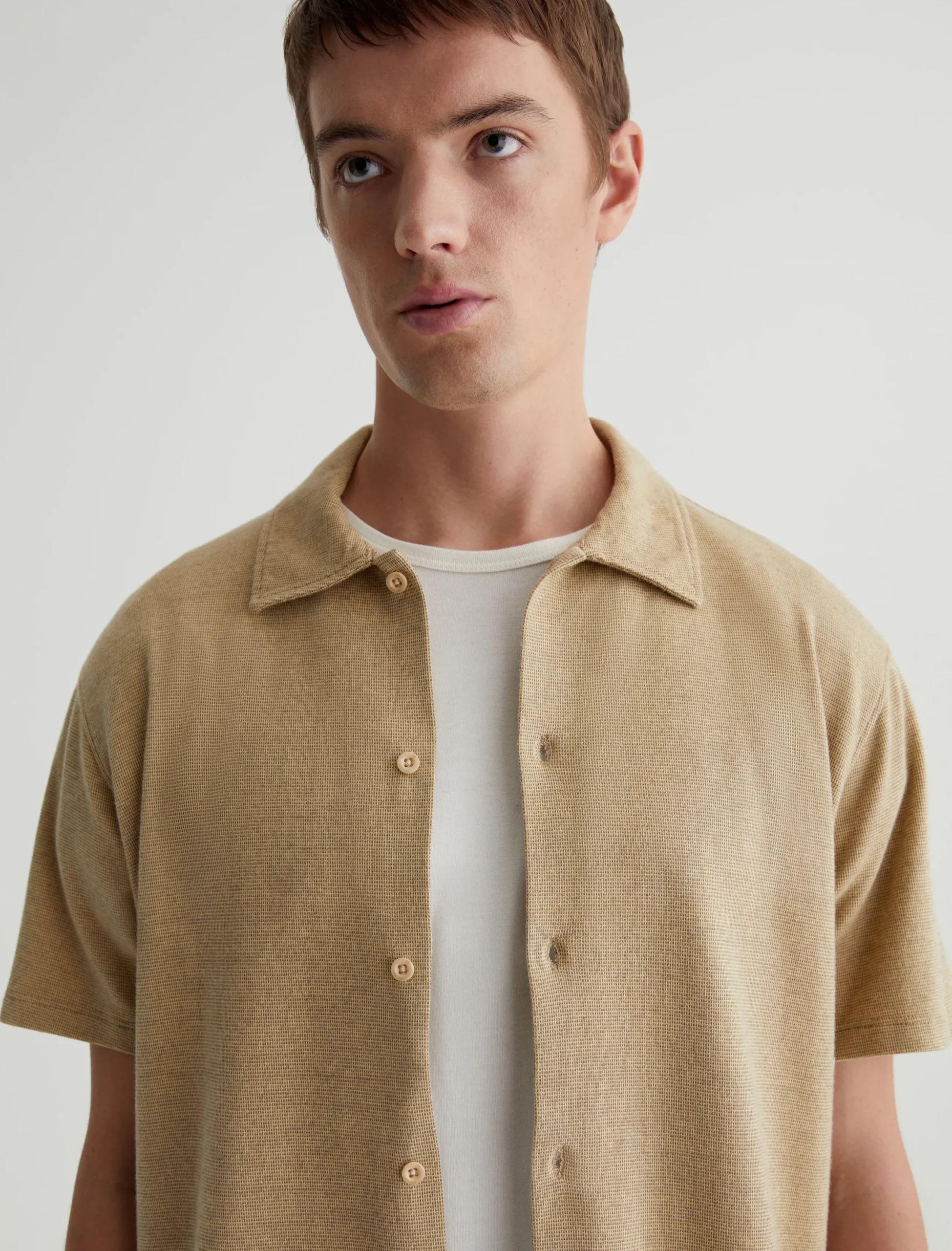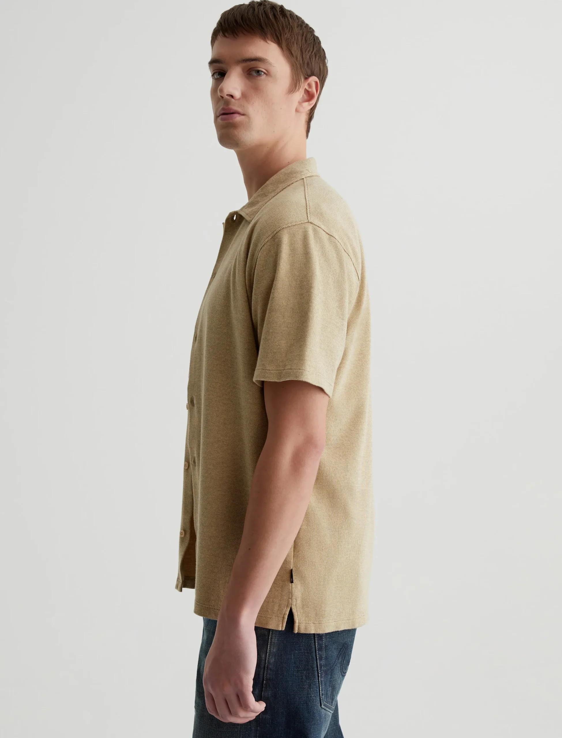 Our Nathaniel knit button-up shirt has casual polish that works well with denim, chinos, or tailored shorts. Made from Luxe Jacquard in breathable cotton, it’s got a relaxed fit with short sleeves and a two-tone stitch pattern.