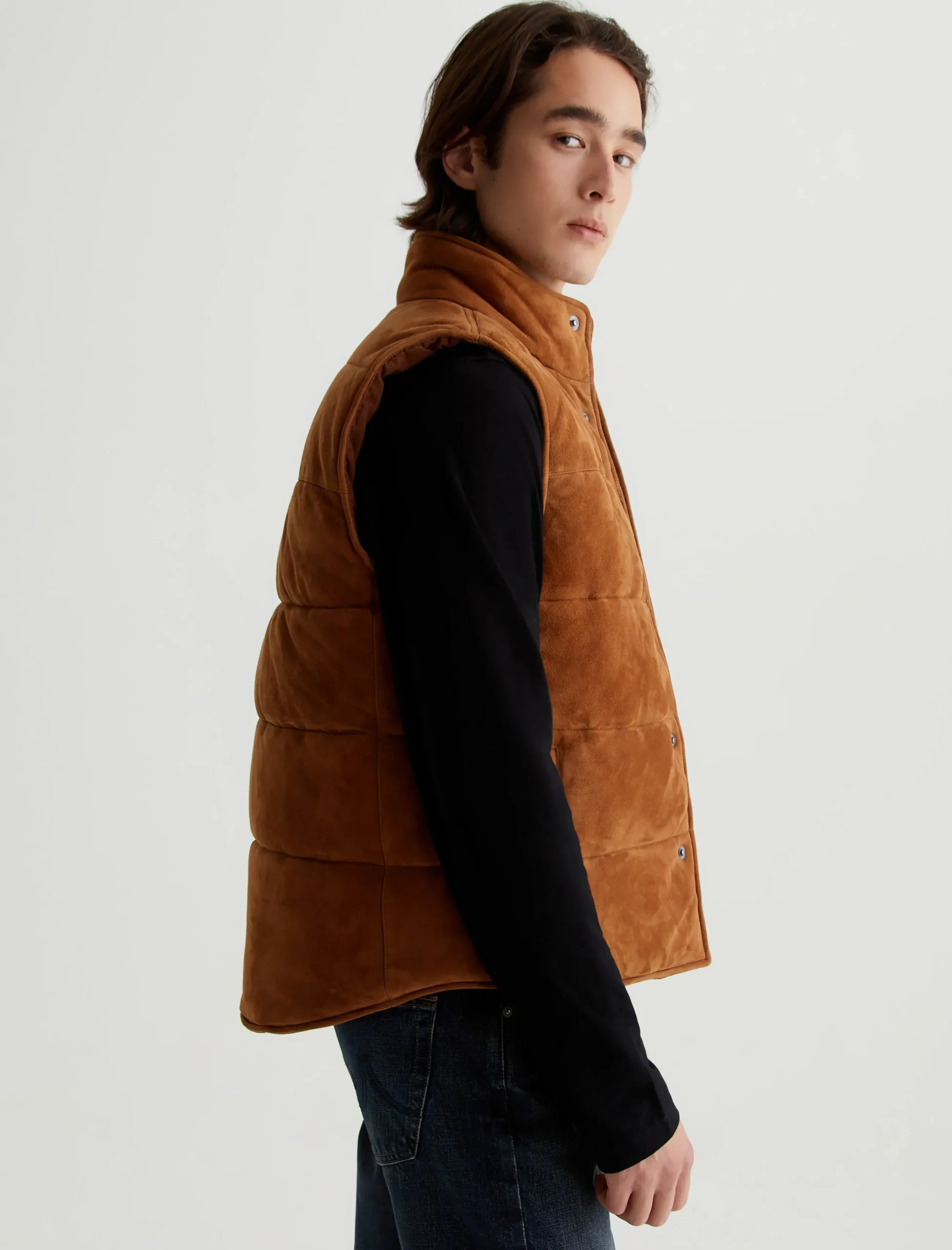 A sophisticated layer to slip on for extra warmth. The Neo Vest is crafted from supple suede in a rich cognac color. It’s got quilted construction with metal snap closures and concealed hip pockets for handy stashing.