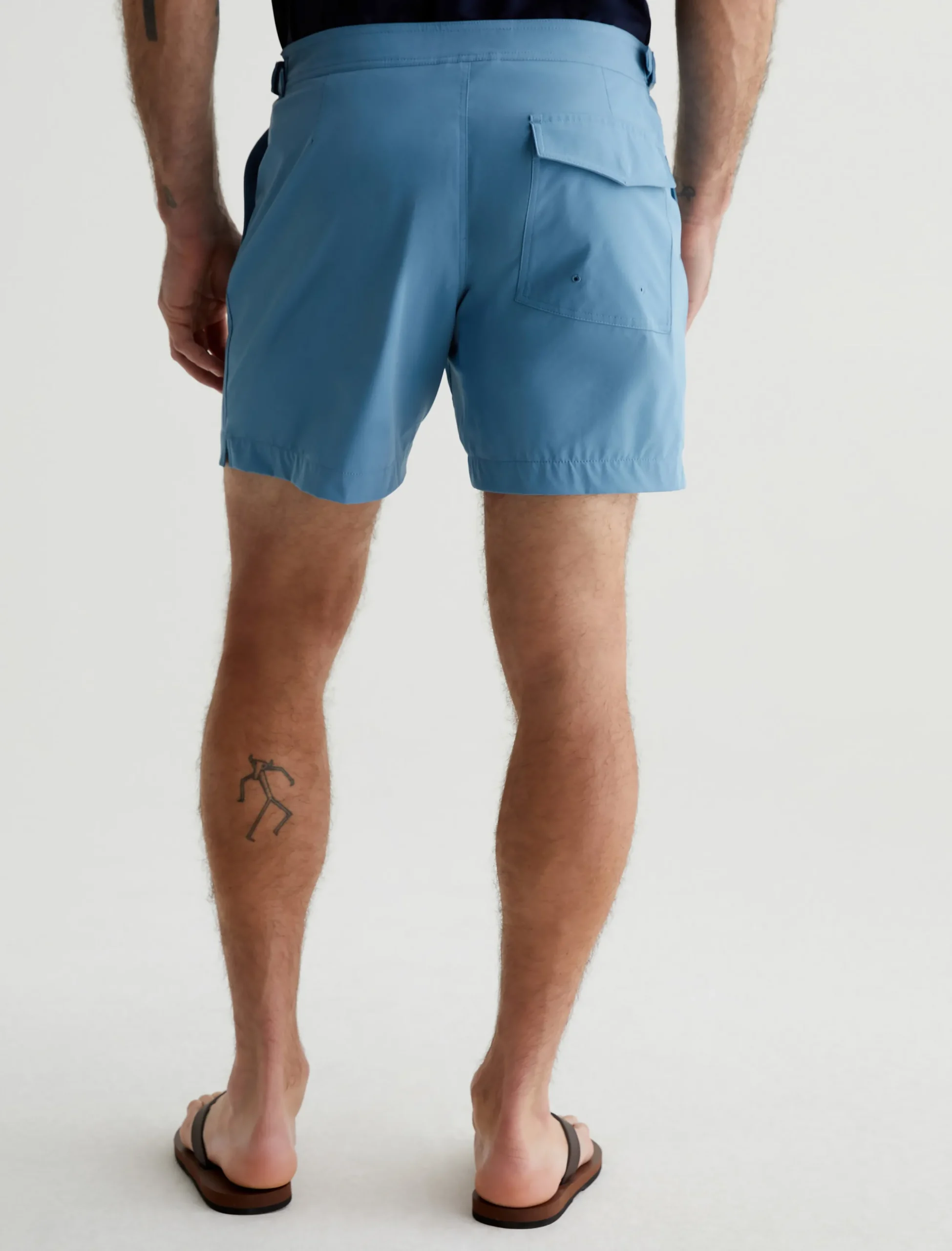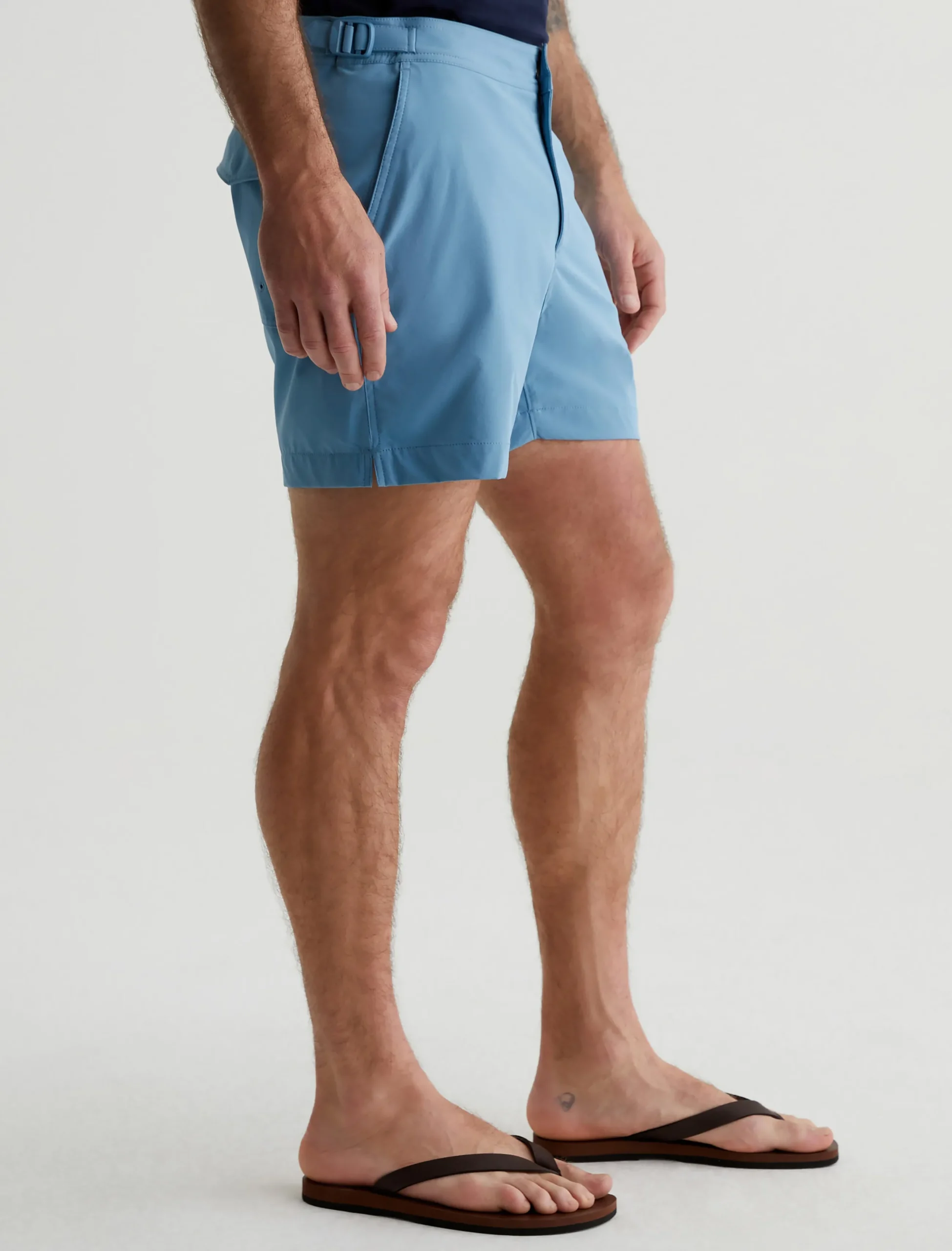 The Pace Active Performance Trunks have a slim fit in 360° Performance Woven fabric with two-way stretch construction that’s quick drying and wrinkle resistant. These sky-blue swim trunks feature a clean waistband with a concealed zip fly and hidden snap fastening, plus bar sliders at the sides so you can adjust the fit. Complete with side slits, slant front pockets, and a flap pocket at the back. Inner mesh lining.