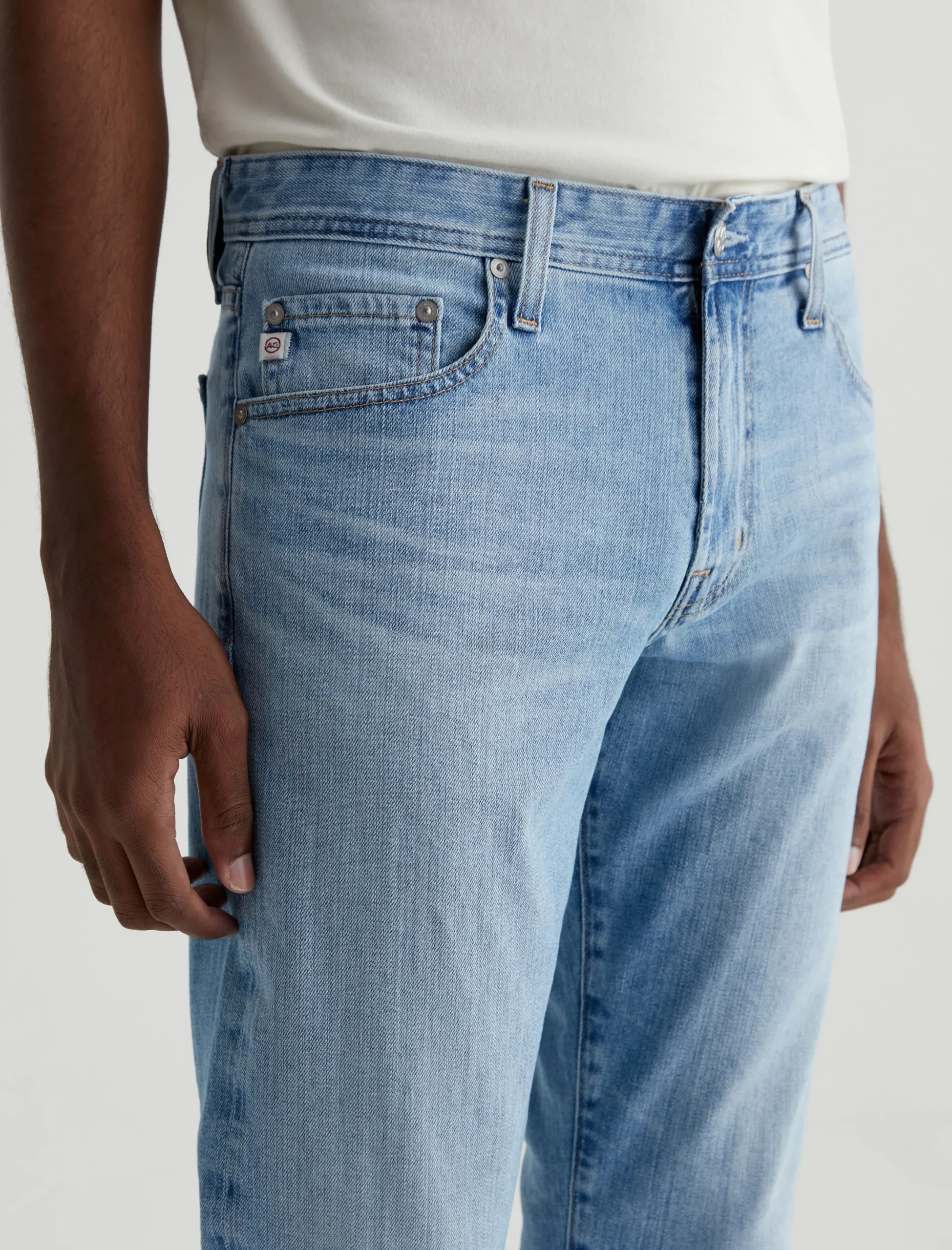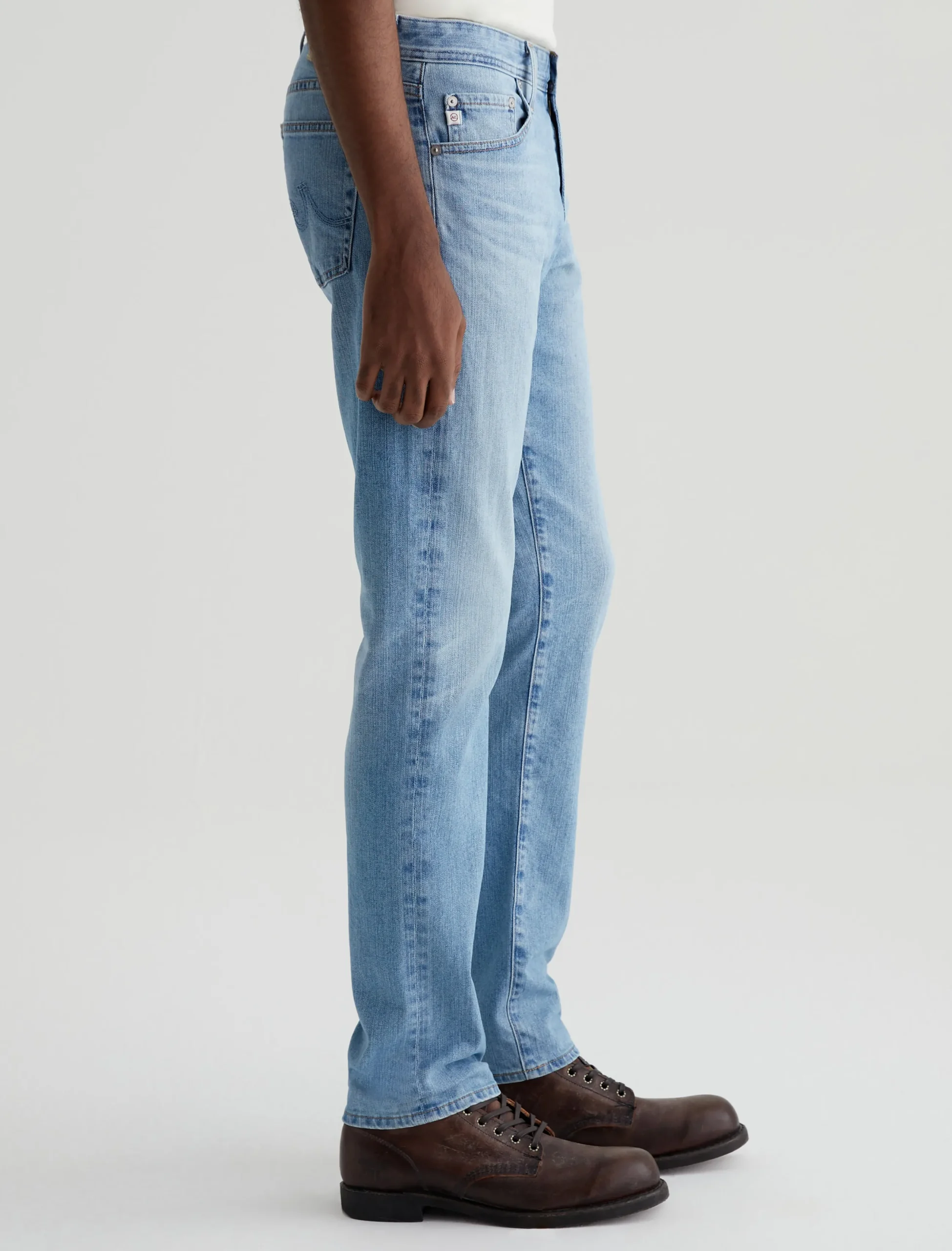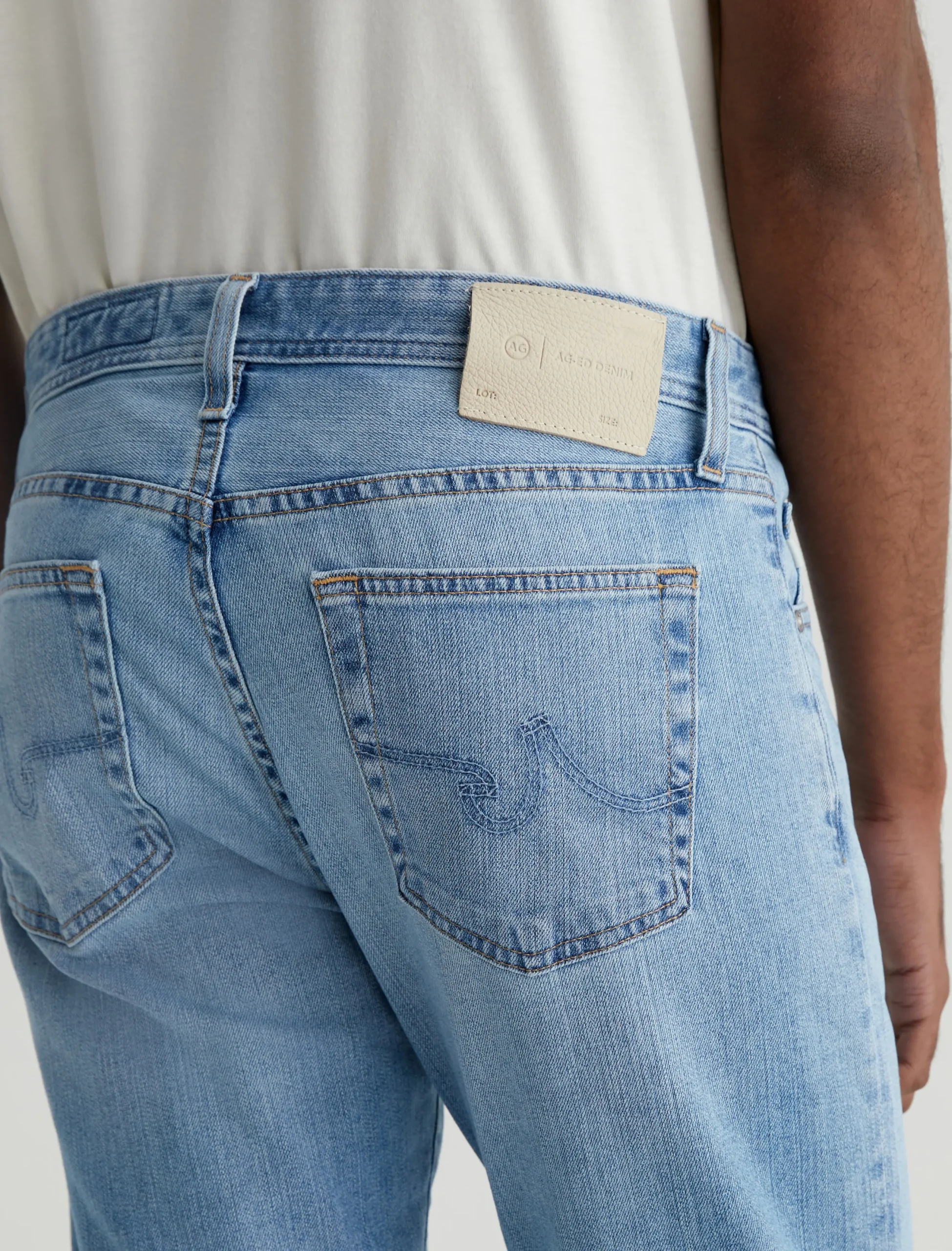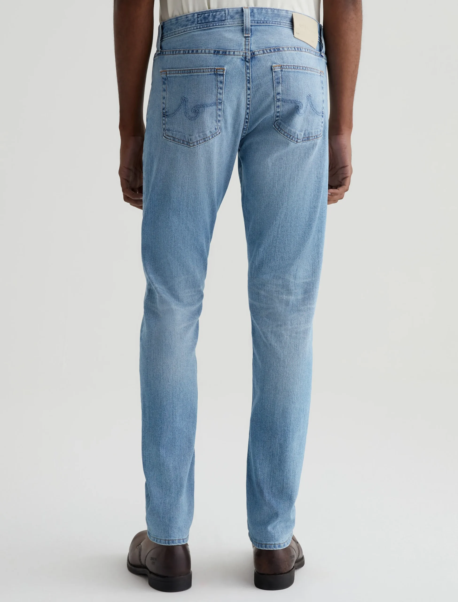 Our Tellis modern slim jean for men features an AG-ed™ light indigo wash with fading and whiskering to emulate 21 years of vintage wear. Featuring a fitted upper block and tapered leg opening, these five-pocket men’s jeans are designed in 11 oz. comfort-stretch Lead Denim.