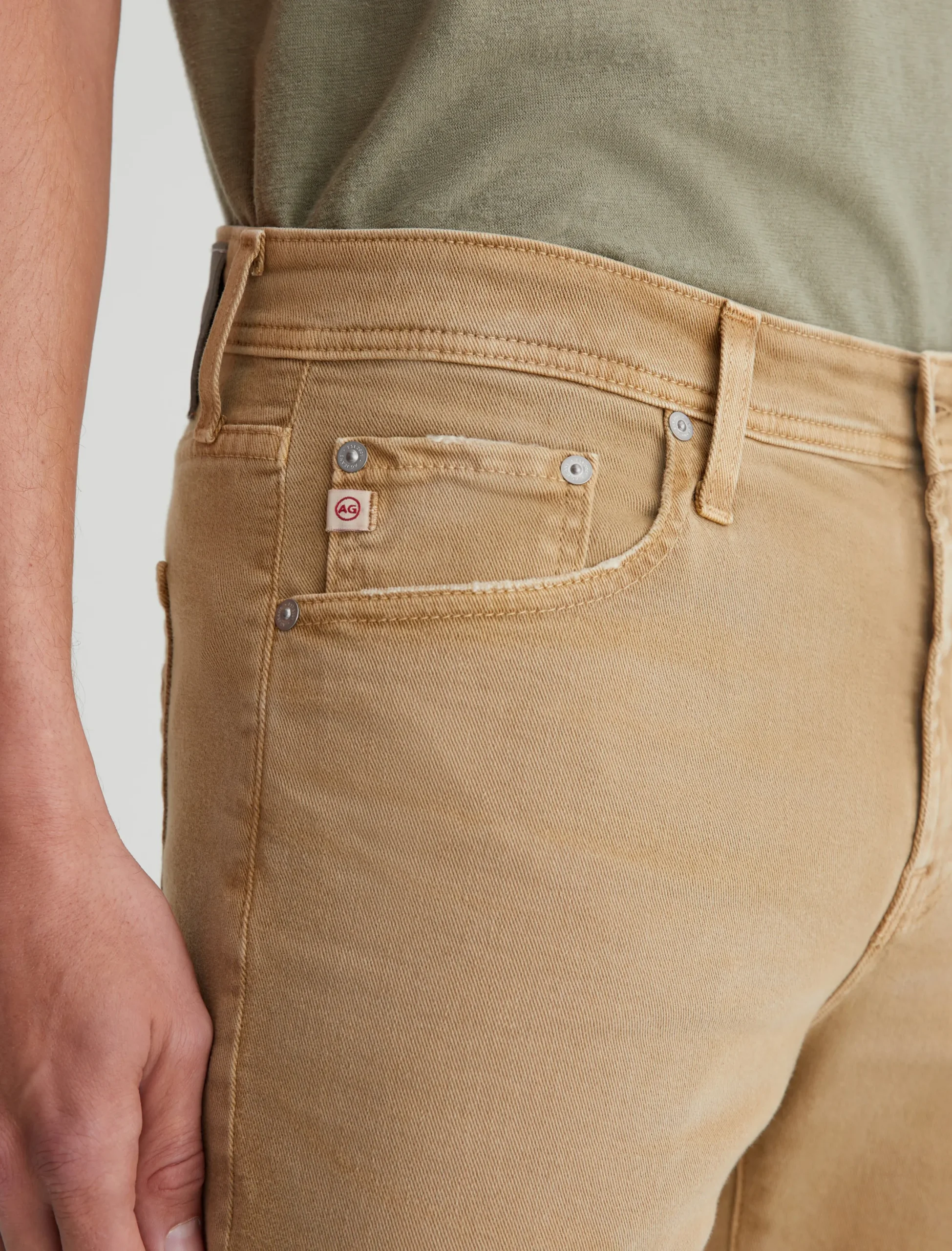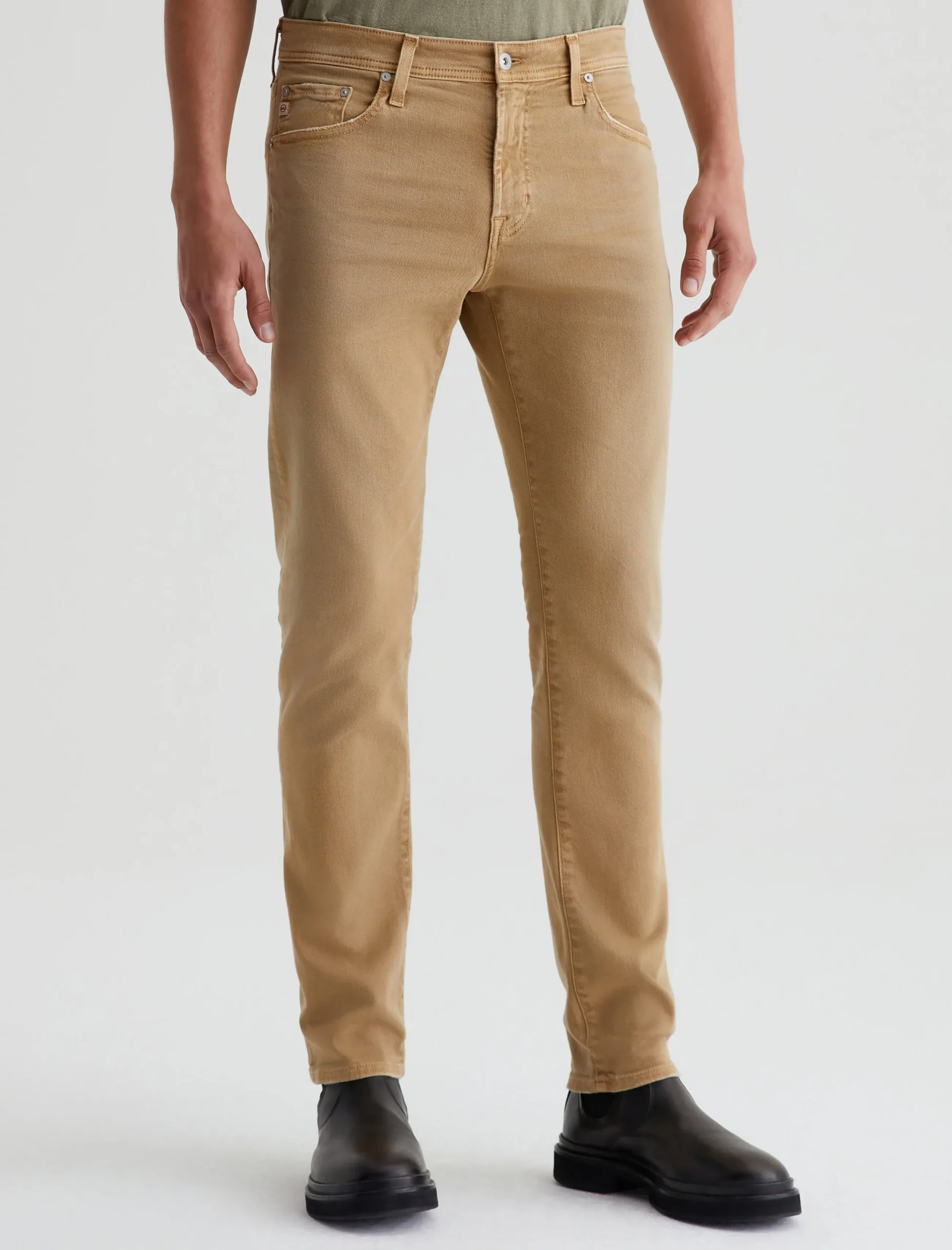Tellis is a modern slim fit for men, updated in a warm khaki shade that’s been AG-ed™ with fading and softly distressed pocket edges to emulate 7 years of wear. These five-pocket jeans have a fitted upper block and a tapered leg opening in 8.7 oz. Hyper Soft Bull Denim, our velvety left-hand twill fabric from the AG Cloud Soft Denim™ collection. The fabric’s special construction allows the yarns to gently relax and untwist for a supple feel that gets softer with every wear. Dual-elastic performance fibers offer elevated stretch and recovery.