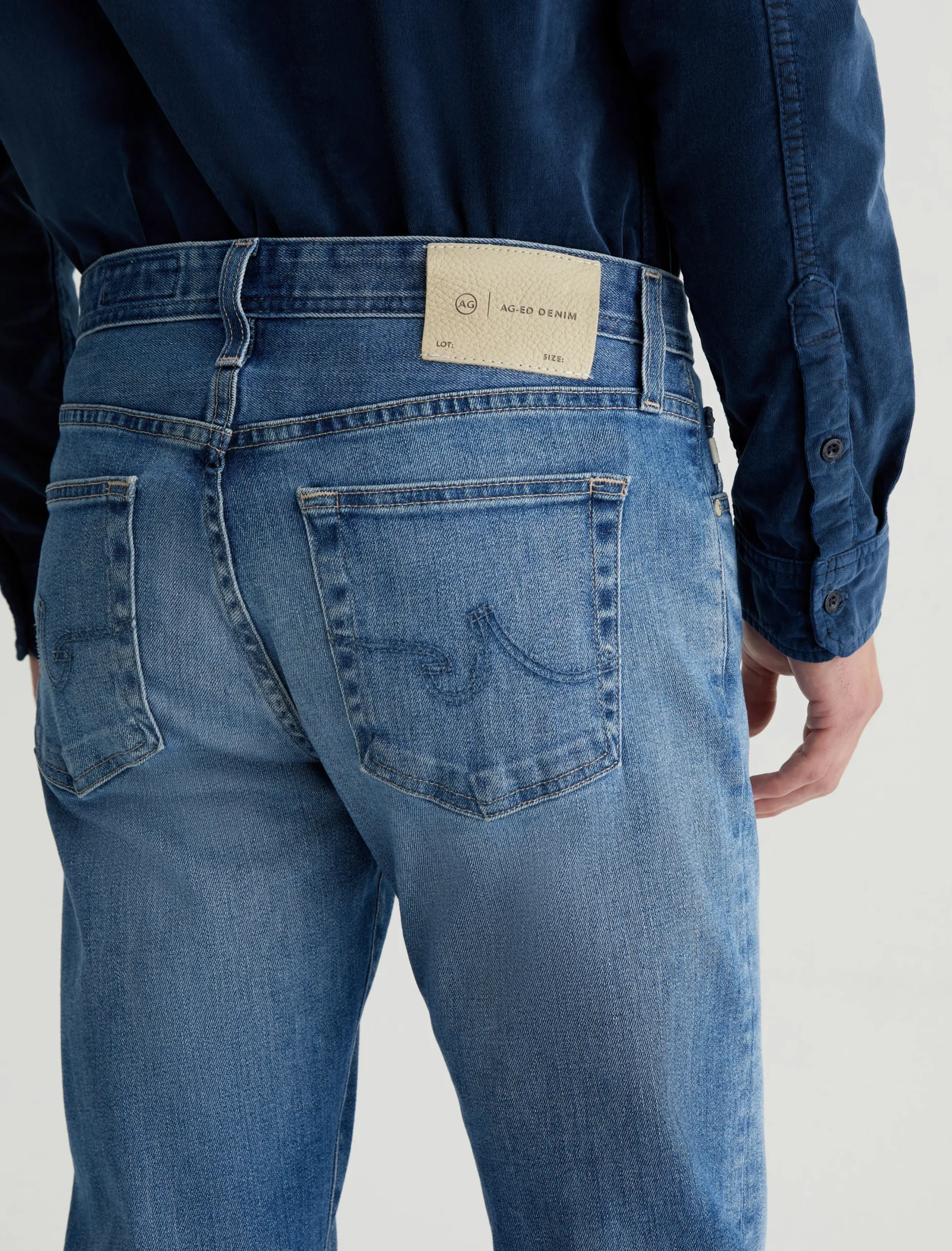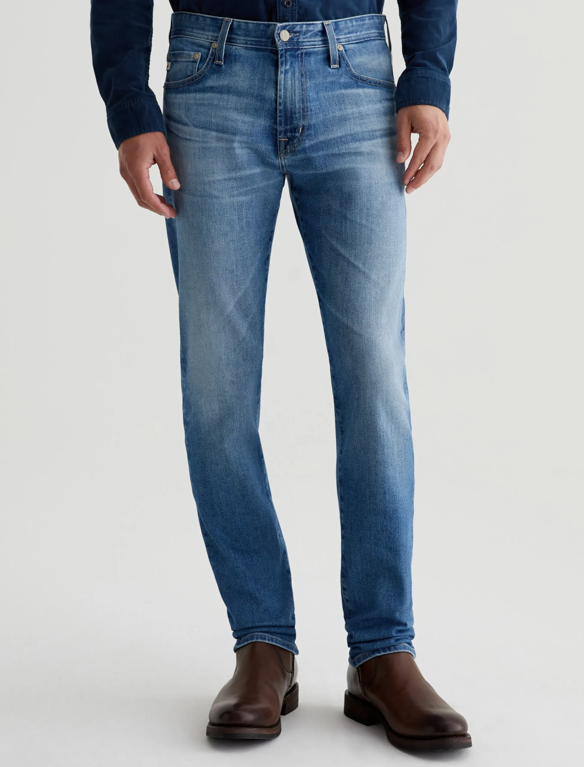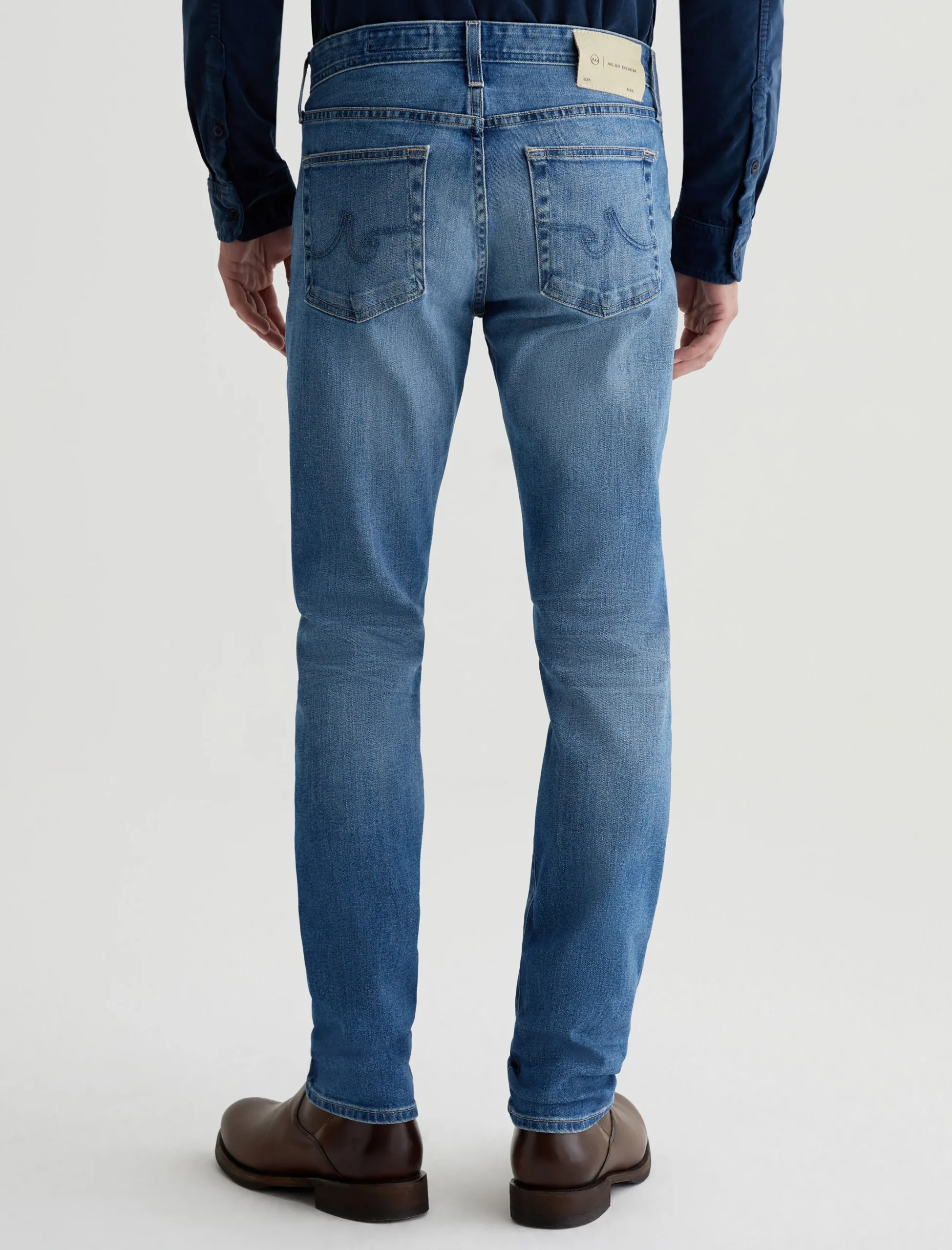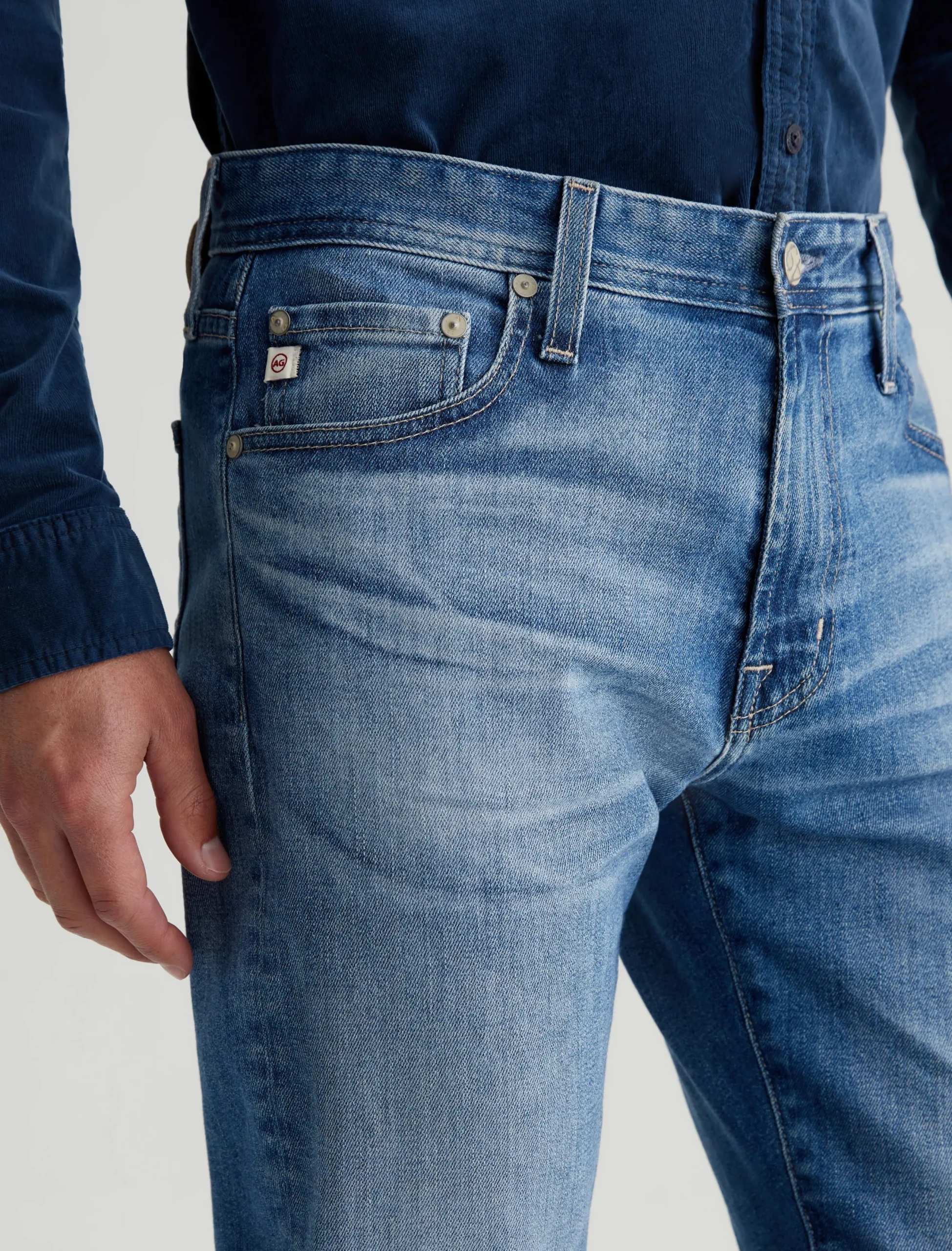 Our Tellis modern slim-fit jeans are cut with a fitted upper block and slender legs that taper at the ankle. This pair has a bit of stretch in 11.2 oz. New Union Dark Denim from Italy. Washed to a medium indigo shade, the style features a 19-year AG-ed™ Denim finish with fading, whiskering, and a subtle honeycomb wear pattern at the back of the knees.