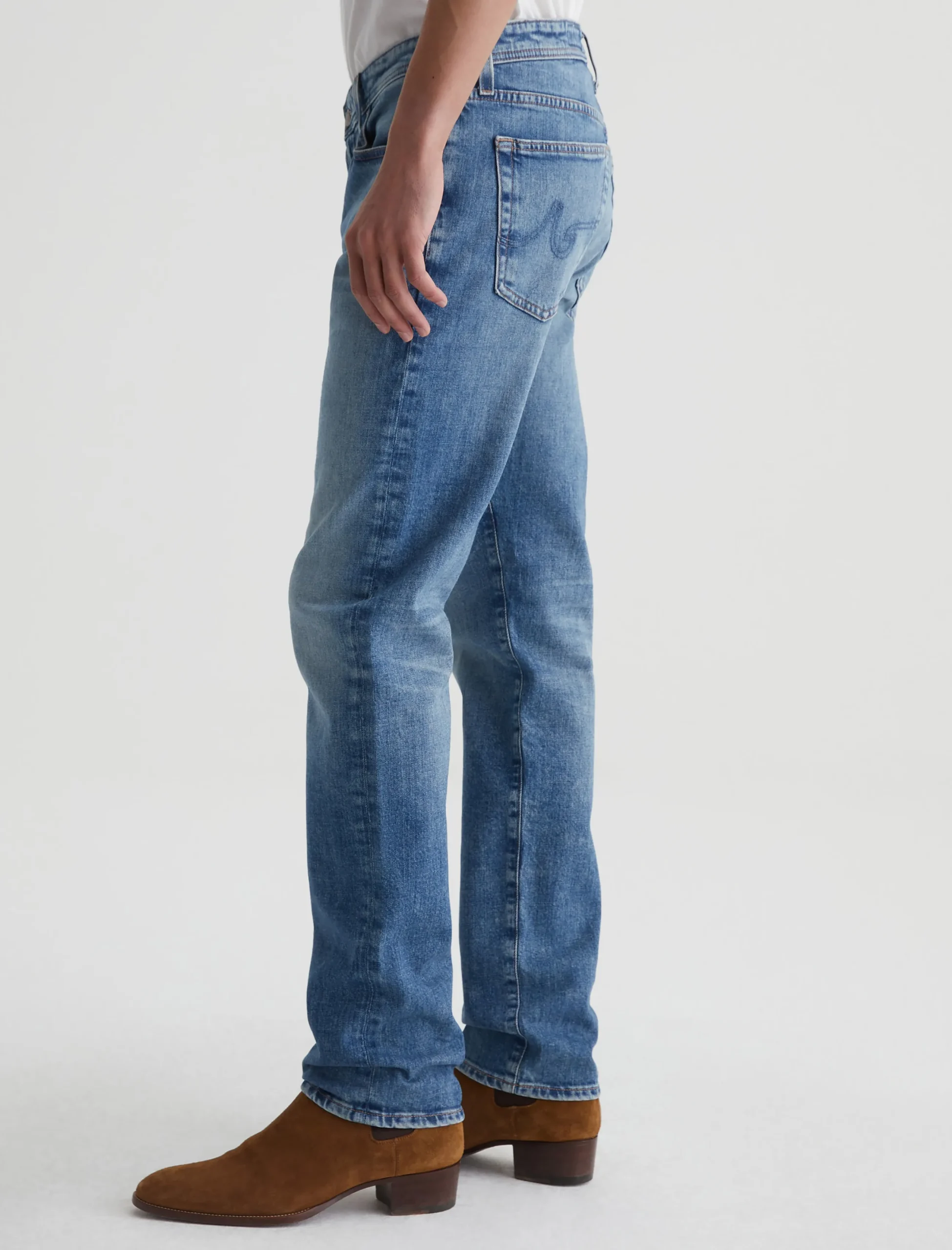 Tellis is our signature modern slim fit for men, updated here in a light blue wash with an AG-ed™ 19-year fade. The style has a mid-rise waist and a relaxed fit from hip to the knee before tapering at the leg opening. These 5-pocket men’s jeans are cut from 11 oz. Journey Denim that’s blended with stretch for elevated comfort.