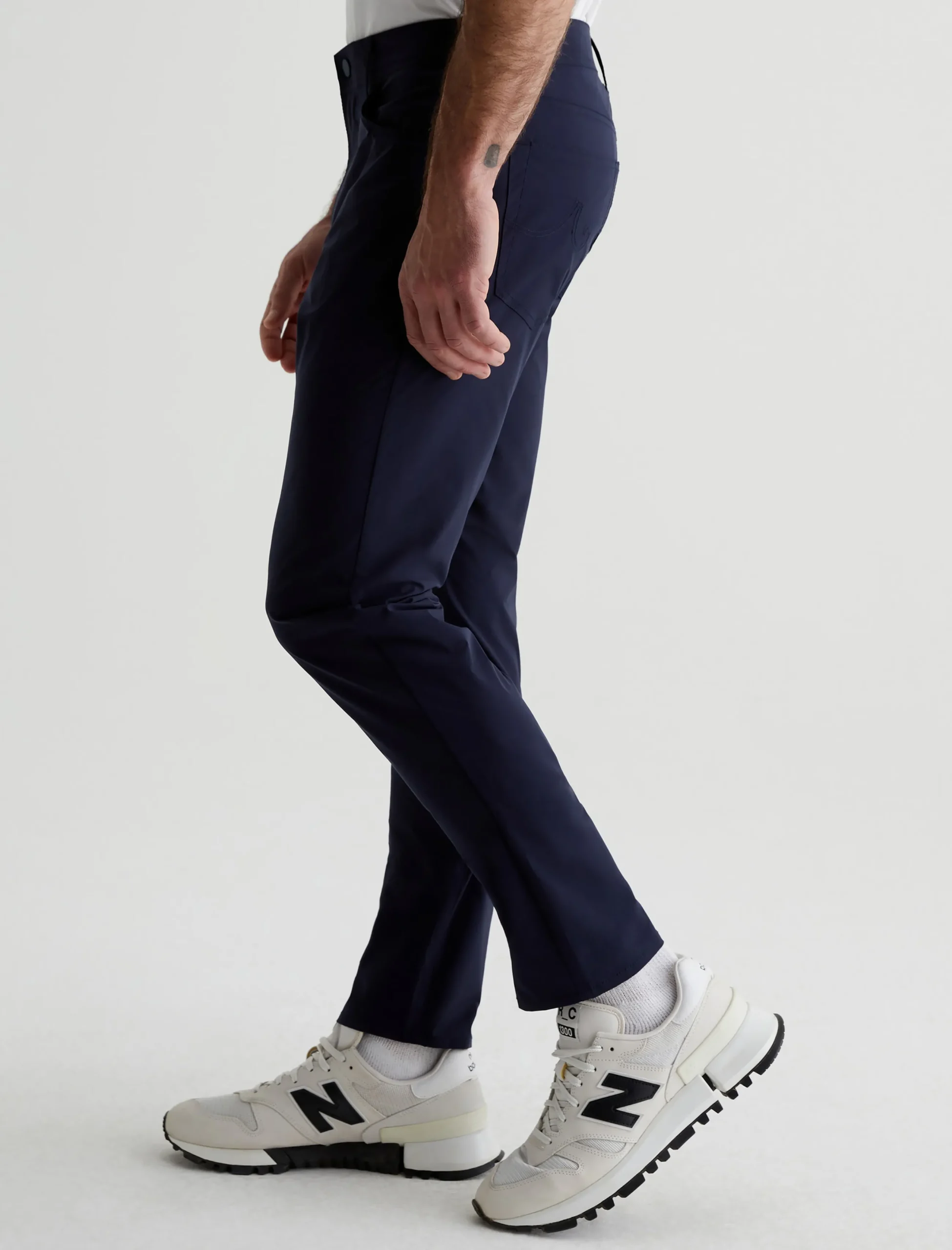 Our signature modern slim, updated for maximum mobility. The Tellis Active Performance pants feature a fitted upper block and slim legs with a tapered finish, plus an elastic interior waistband and snap closure. Made from 360° Lightweight Endurance Woven fabric in deep navy, it’s got bi-stretch construction that’s quick drying, water resistant, and avoids wrinkling. A silicone heat transfer logo brands the back waistband.