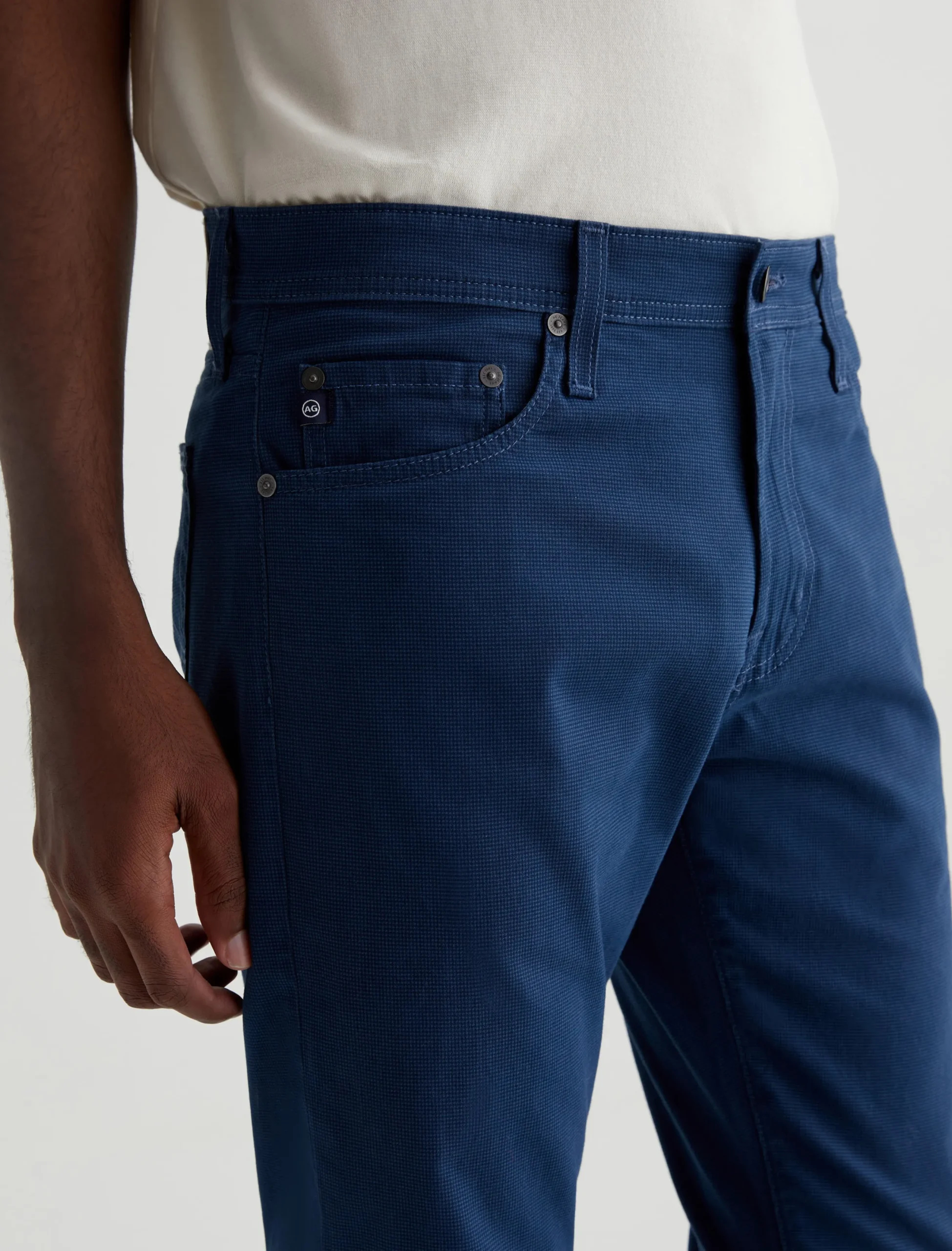 Tellis is our modern slim fit for men. Designed with five-pocket construction, these slim-cut men’s pants have a fitted upper block and tapered leg openings. The pair here features 8.4 oz. Sueded Stretch Sateen in a rich blue shade that’s printed with a tonal mini-houndstooth motif. One of AG’s best-selling fabrics, our Italian-crafted sateen is refined, soft to the touch, and exceptionally comfortable.
