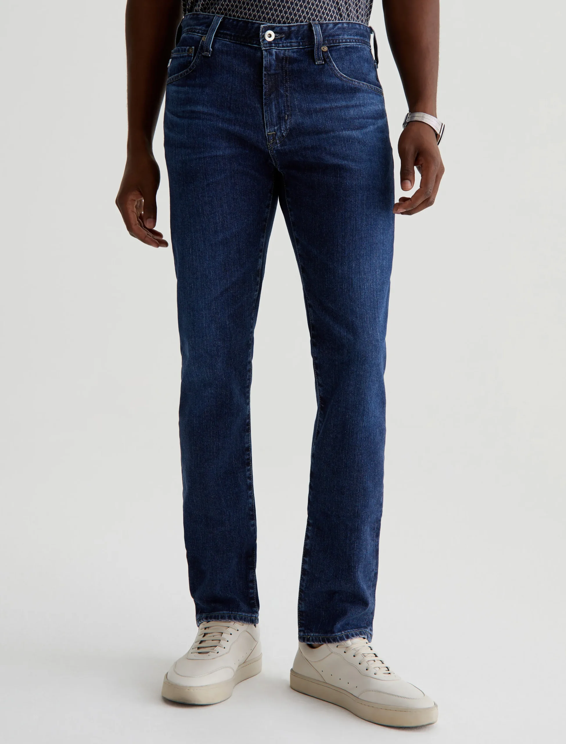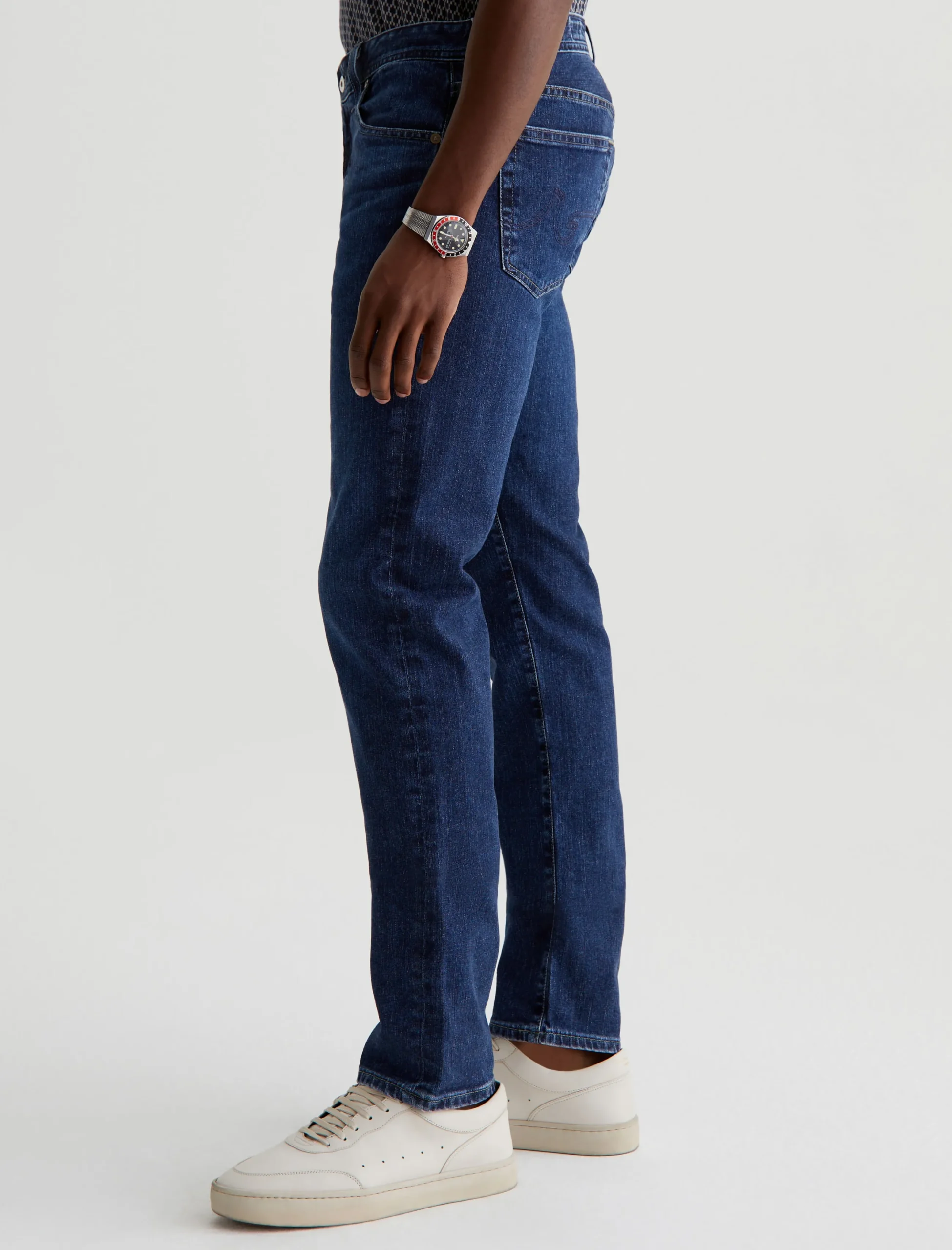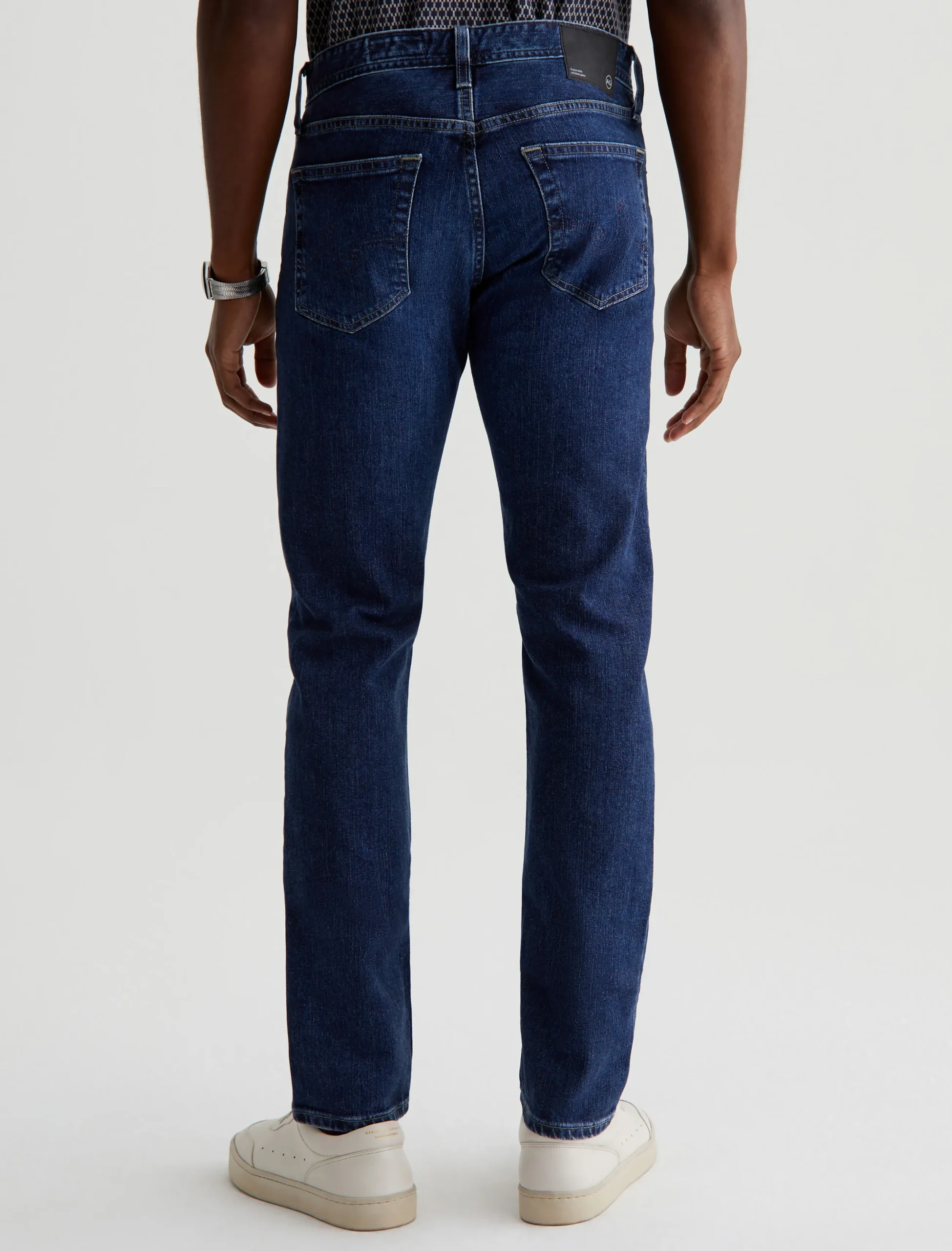 Tellis is our modern slim fit, featured in a medium indigo wash that’s been achieved using our eco-friendly AG Vapor Wash™ technology. Cut with a fitted upper block and tapered leg opening, this five-pocket men’s jean is designed in 11 oz. Lead Denim with comfort stretch. Our AG Vapor Wash™ process significantly reduces the use of water, chemicals, and energy to lessen environmental impact. Finished with a vegan and 100% biodegradable cellulose patch at the back waistband.