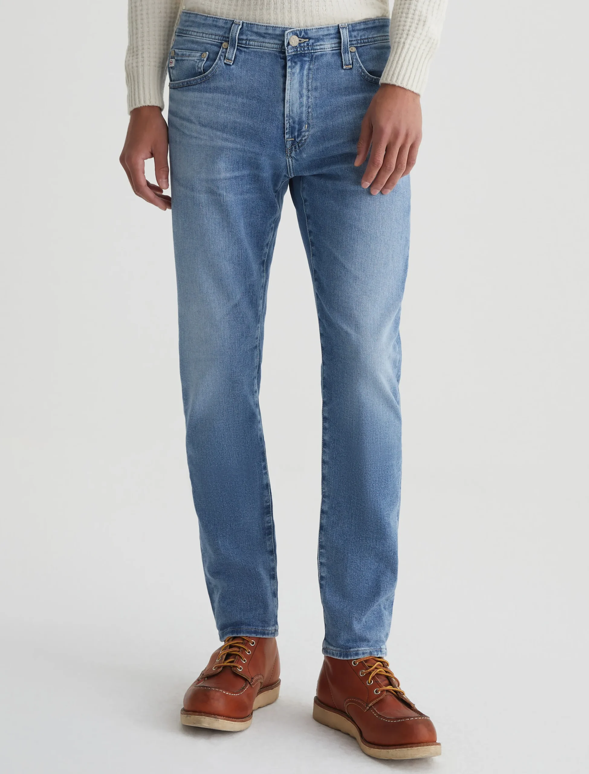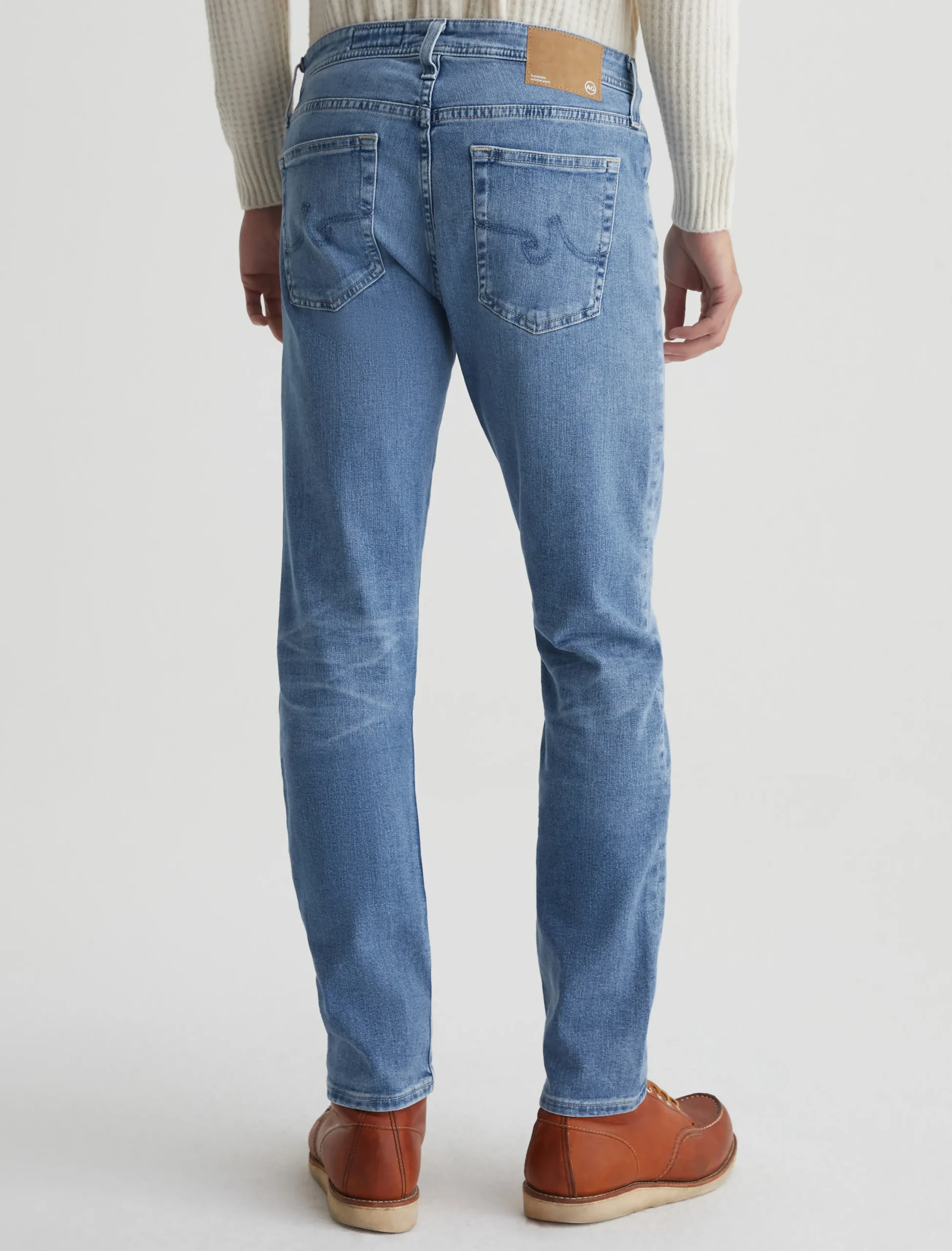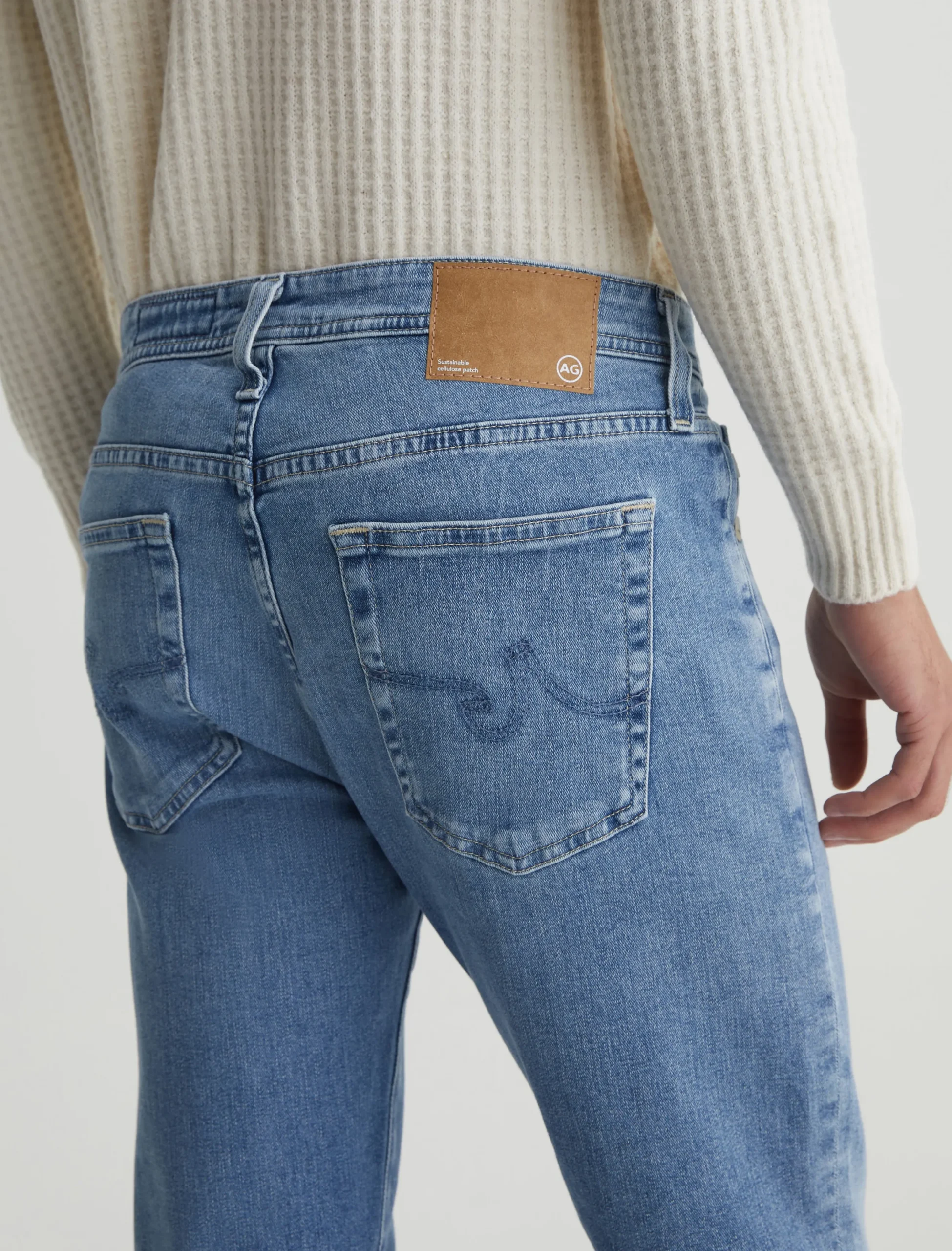 Tellis is a modern slim jean for men, updated here in a 16-year AG-ed™ light blue shade achieved through eco-friendly AG Vapor Wash™ technology. Tellis is designed with a fitted upper block and a tapered leg opening. These men’s slim-fit jeans come in 9.4 oz. Hyper Soft Indigo Denim from our exclusive AG Cloud Soft Denim™ assortment. This fabric’s left-hand twill construction allows the yarns to gently relax and untwist for a supple, velvety feel that gets softer with every wear. It’s blended with dual-elastic performance fibers, offering premium stretch and recovery.