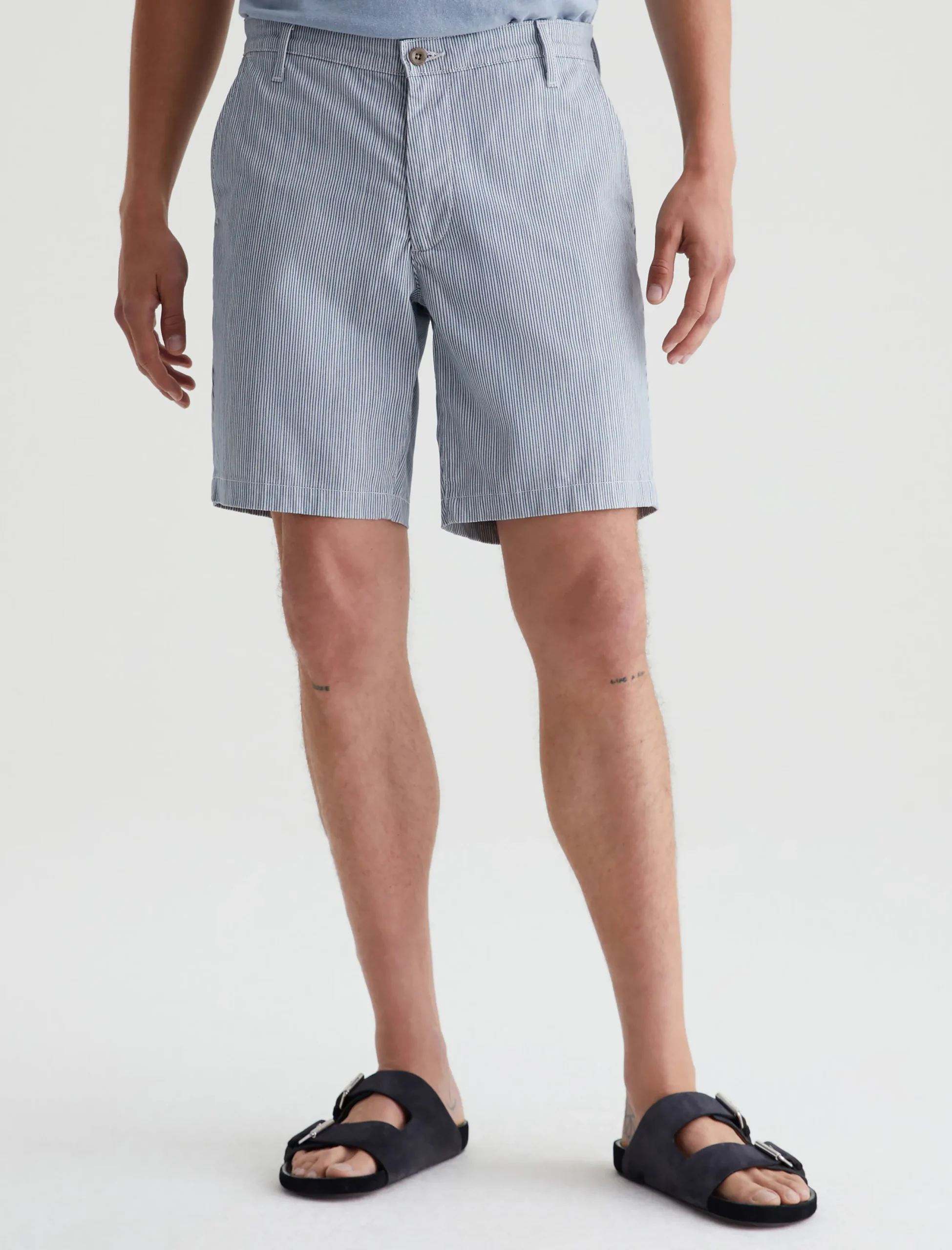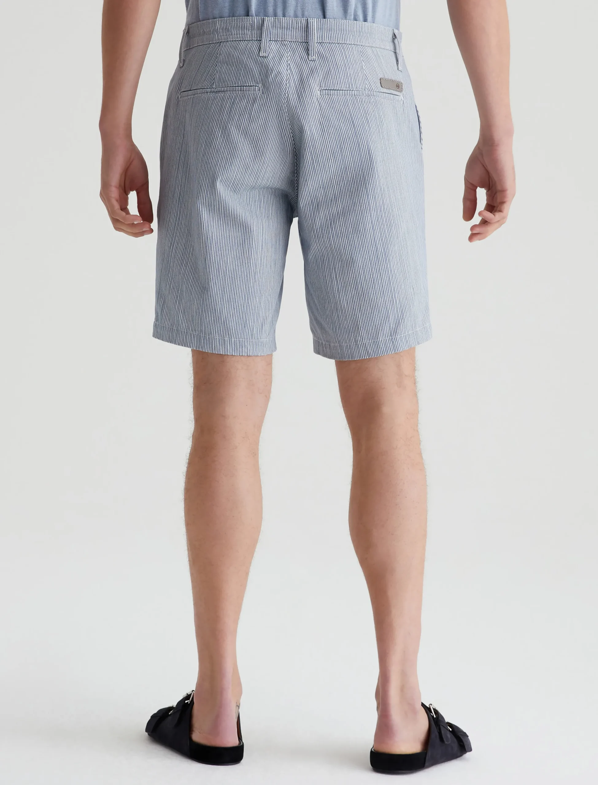 Our Wanderer Short for men has a clean trouser look in a slim fit with slightly tapered legs. Patterned with slim grey and white stripes, these men’s shorts are crafted from ultra-lightweight and sumptuous 7.4 oz. Brighton Sueded Sateen with premium stretch.