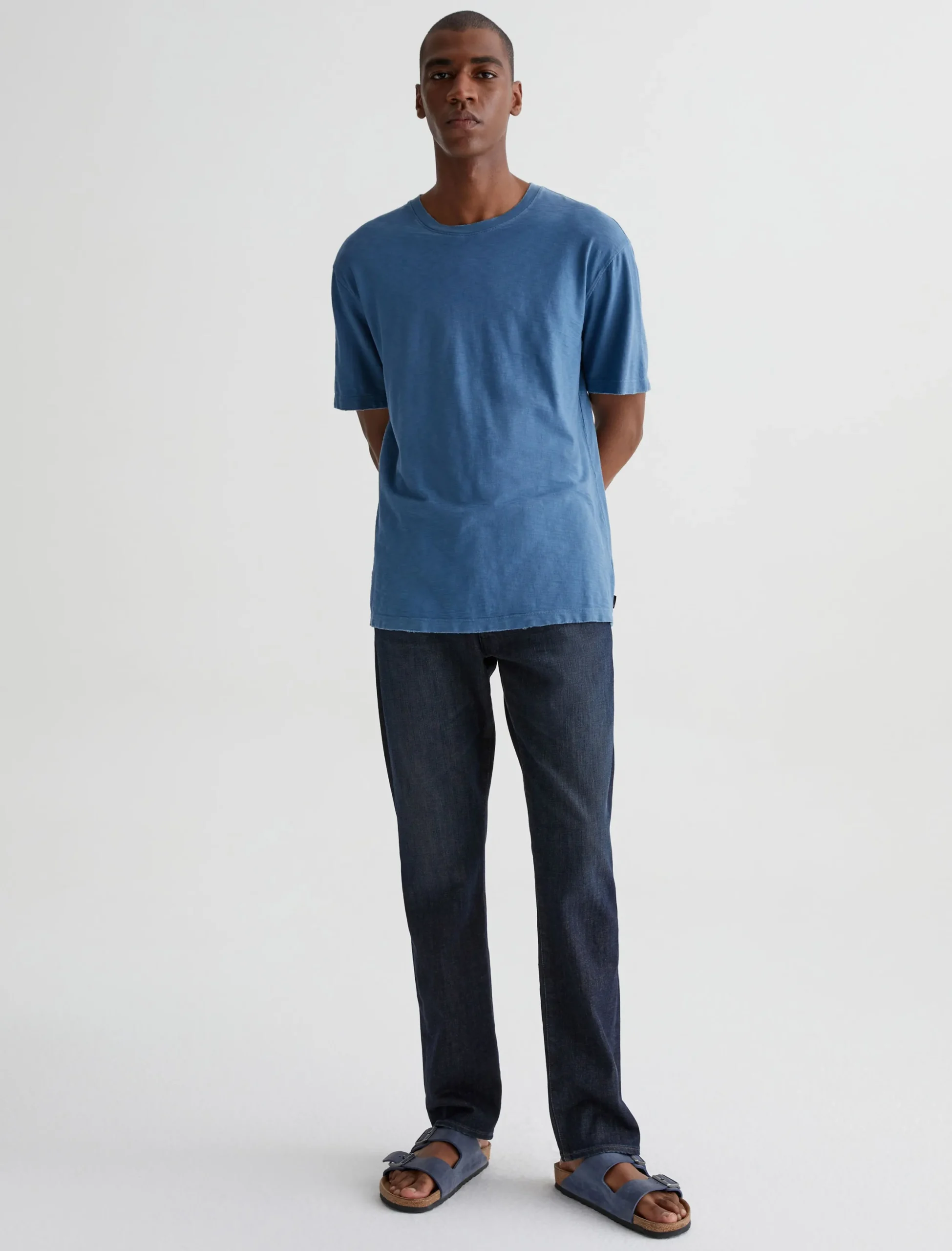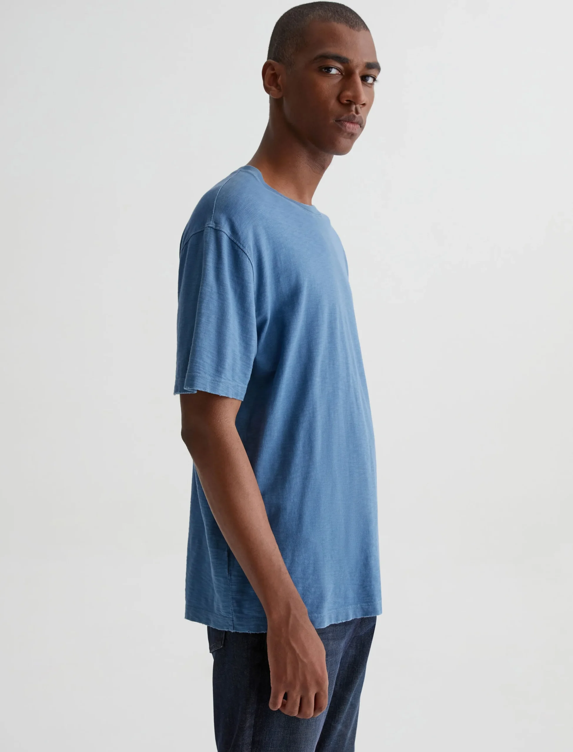 Our Wesley Crew is a relaxed crewneck tee in blue with gently distressed edges. The AG-ed finish creates the characteristics of 5 years of wear. Soft and lightweight in 100% cotton Luxe Slub Jersey, this short-sleeve T-shirt features drop-shoulder detailing and a wider hem for a more fashion-forward fit. The fabric combines S&Z twist yarns to prevent unnecessary twisting and torquing for long-wearing durability.