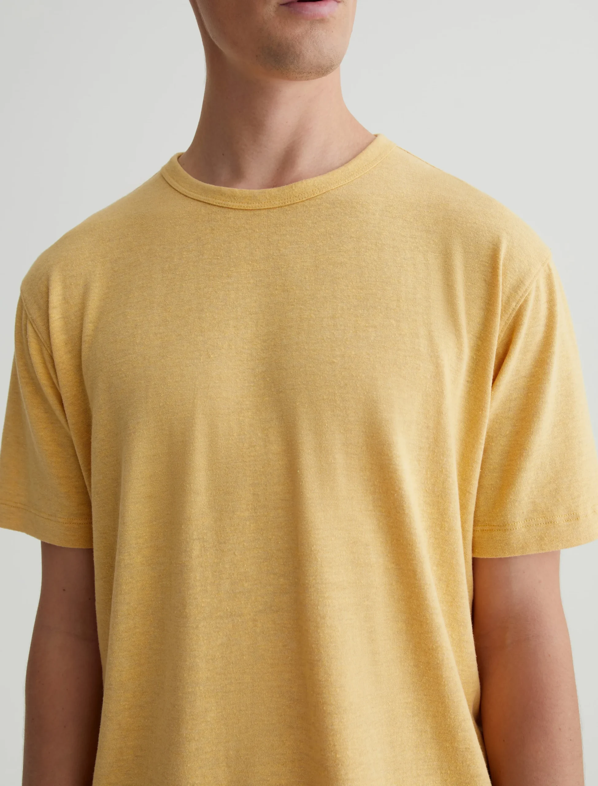 Our Wesley Crew is a relaxed short-sleeve men’s tee with drop-shoulder detailing and a wider hem for a more fashion forward fit. This crewneck T-shirt features cotton-blend Mélange Snow Jersey featuring a golden yellow shade and a soft nep texture at the surface.