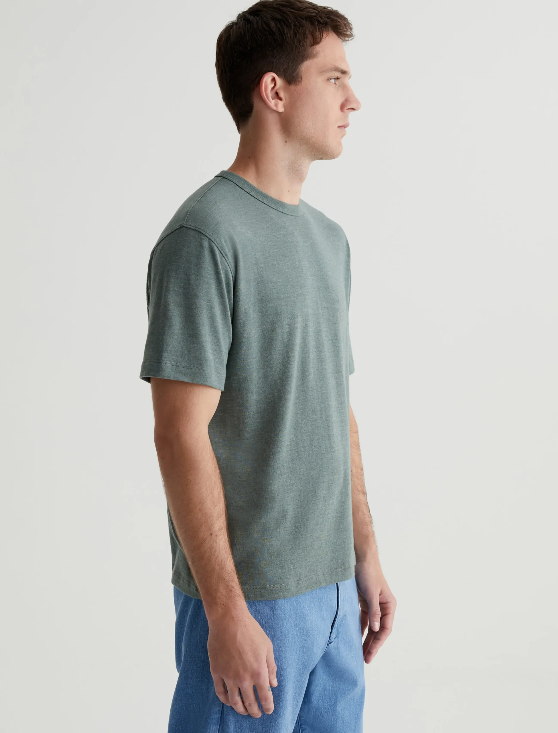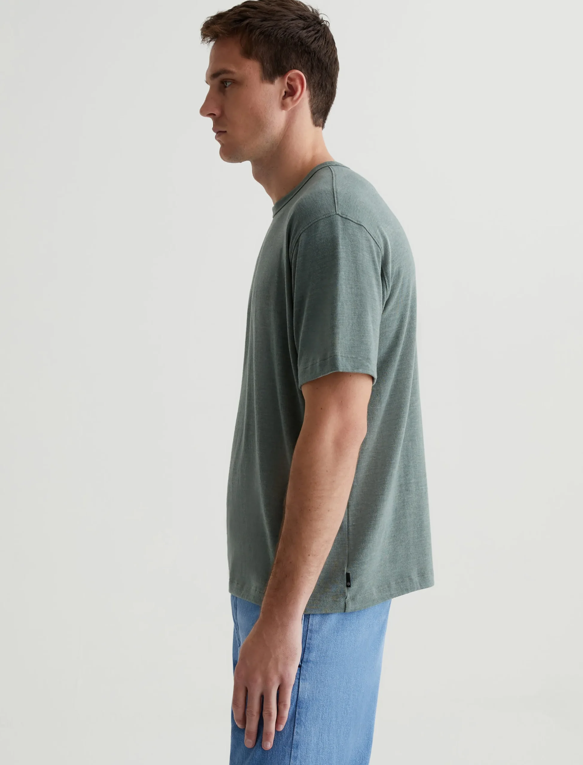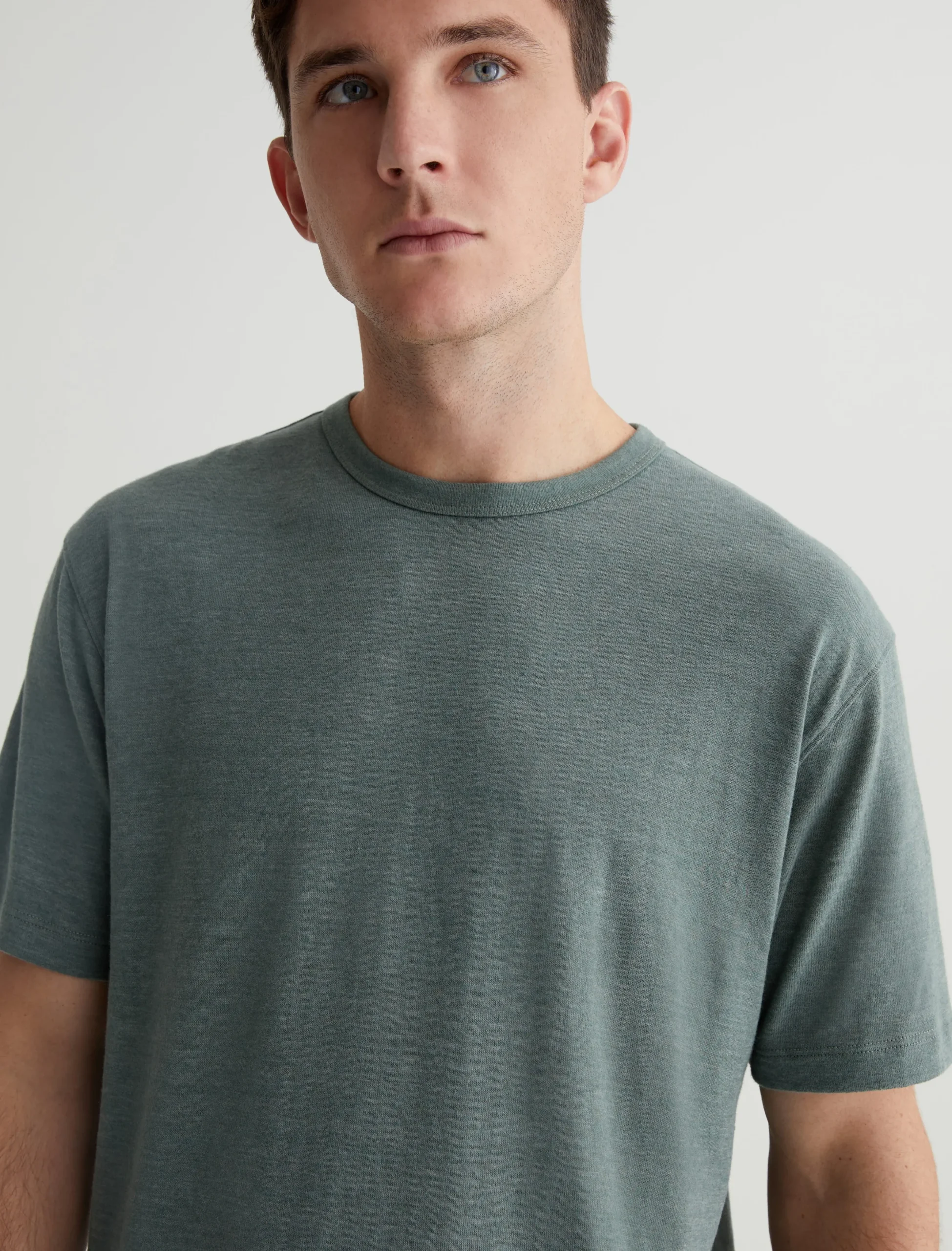 Our Wesley Crew is a relaxed short-sleeve men’s tee with drop-shoulder detailing and a wider hem for a more fashion forward fit. This crewneck T-shirt features cotton-blend Mélange Snow Jersey featuring a sage-green shade and a soft nep texture at the surface.