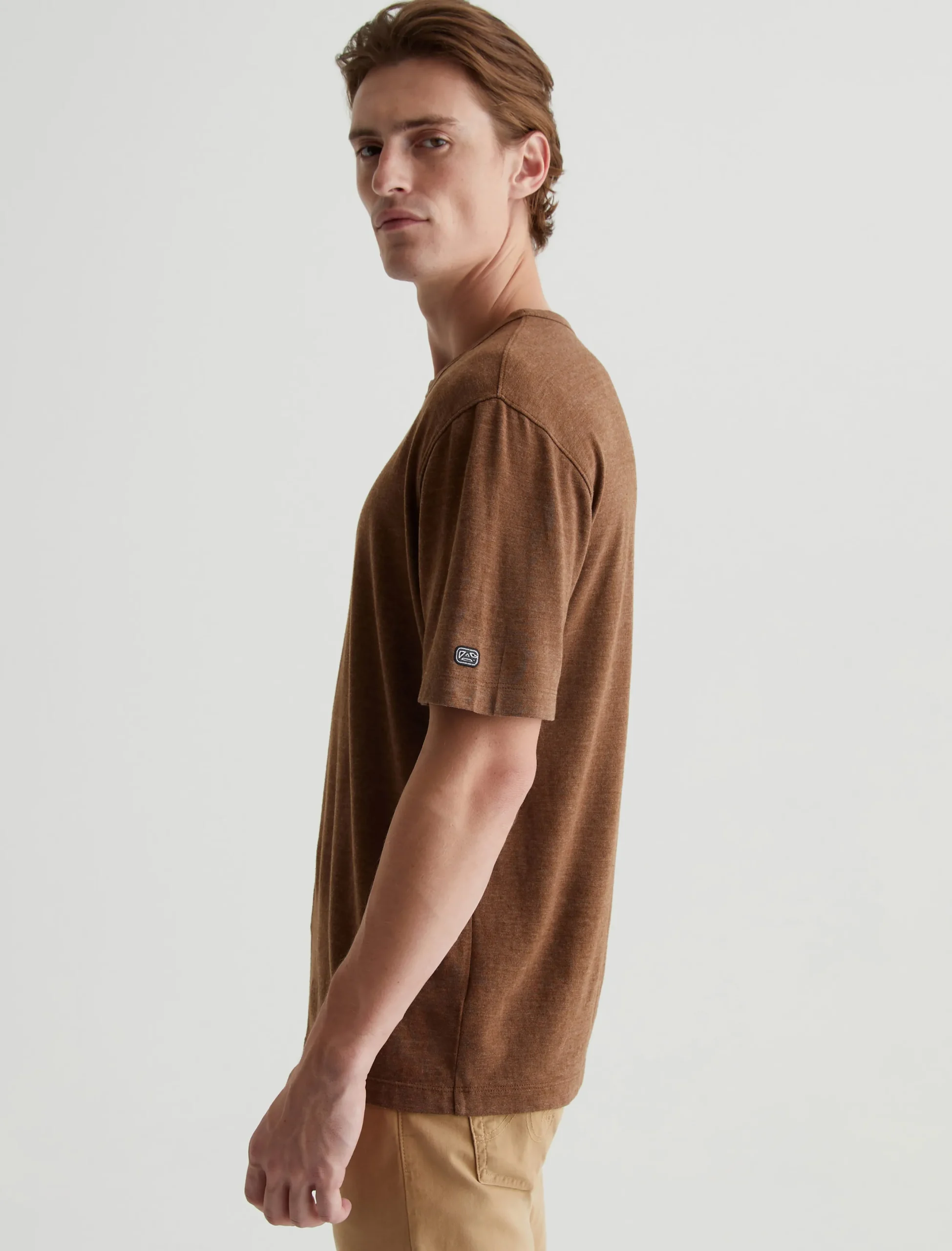 Our Wesley Crew is a relaxed short-sleeve men’s tee with drop-shoulder detailing and a wider hem for a more fashion forward fit. This T-shirt features cotton-blend Mélange Snow Jersey in a rich brown color with a heathered appearance.
