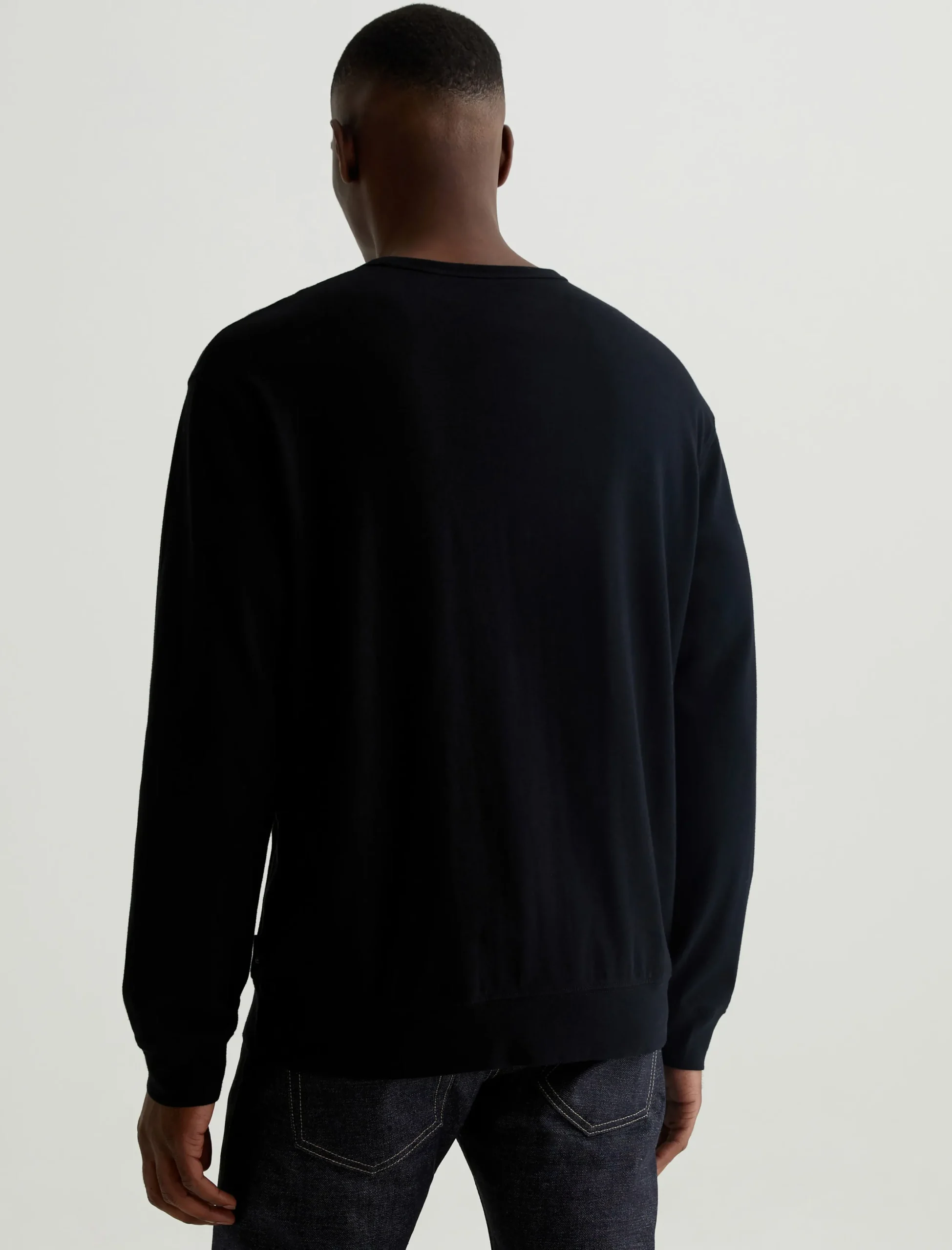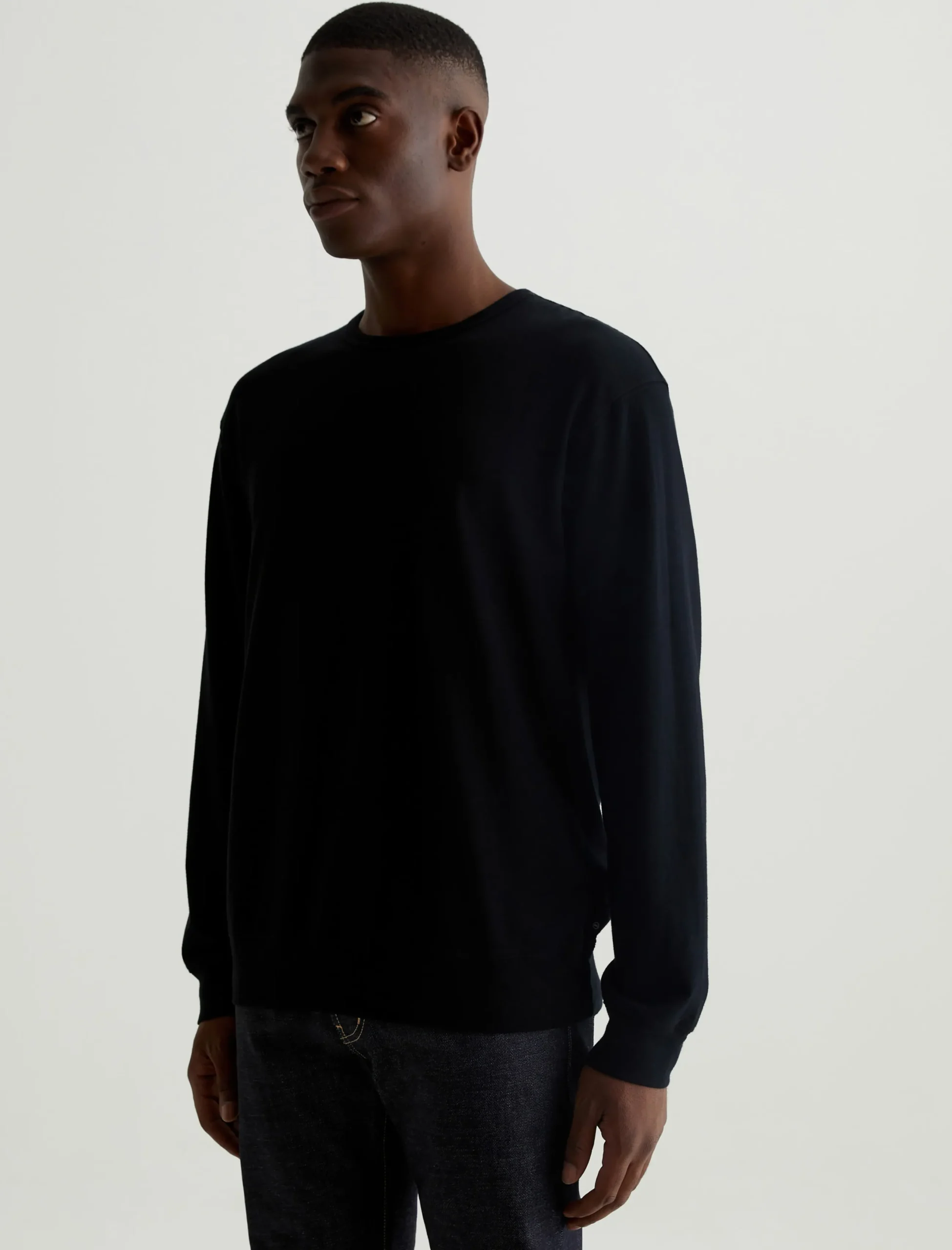 The Wesley Pullover in black is a new silhouette added to our Basic Essentials collection.Borrowing details from a traditional sweatshirt such as rib binding, cuffs, and bottom hem allowed us to create a lightweight pullover that feels classic, modern, and uniform. Our Jersey Knit offers a luxurious comfort that is unrivaled—knitted with both S-twist and Z-twist yarn to sustain longevity and stability, preventing unnecessary twisting and torquing. During the production process, the S-twist yarn is spun counter-clockwise creating a right-handed twill. The Z-twist yarn works in opposition, spinning clockwise for a left-handed twill. This opposition—when working together—yields a softer, more durable fabrication and gives strength to the yarn making it more difficult to pull apart. Designed in 100% Cotton.