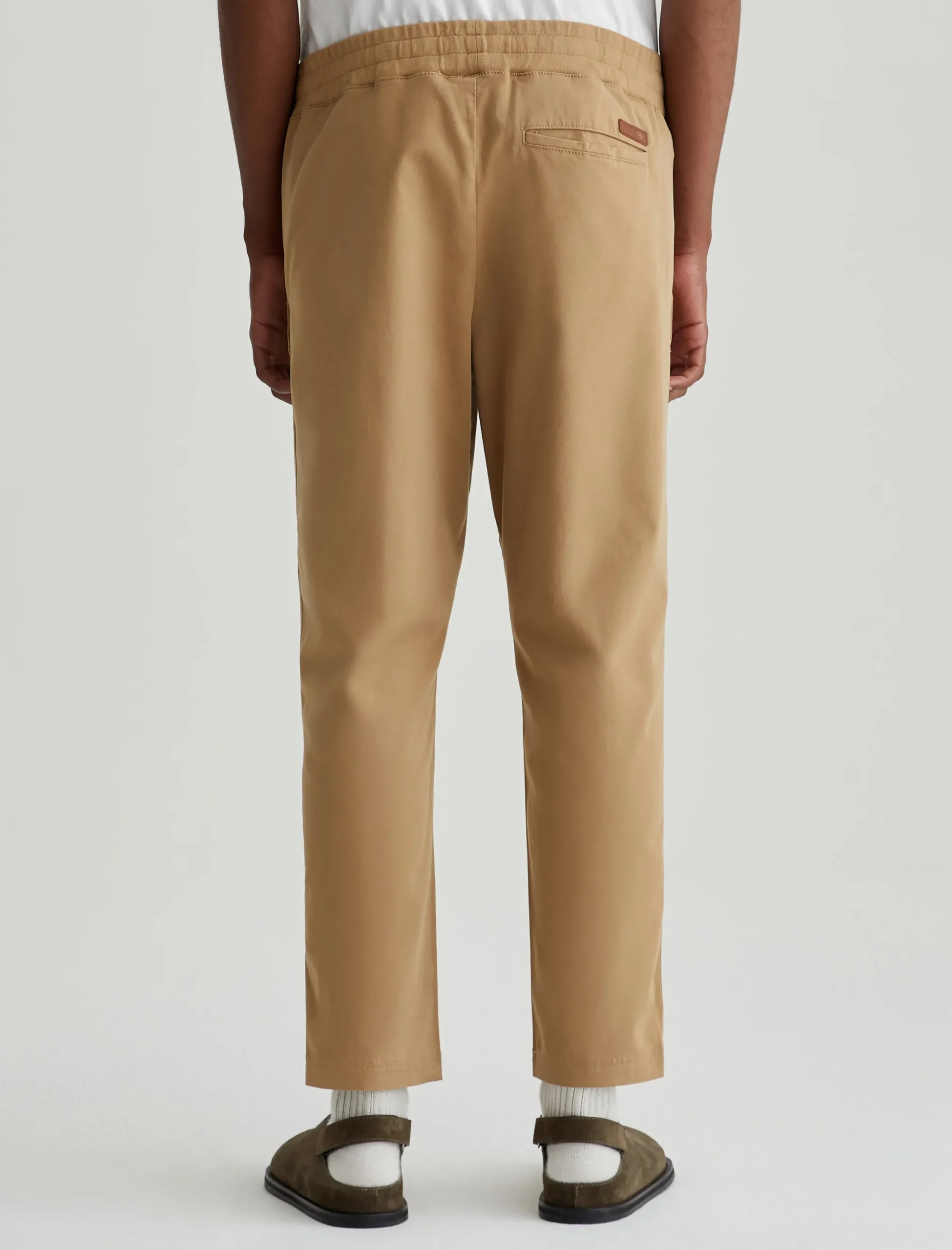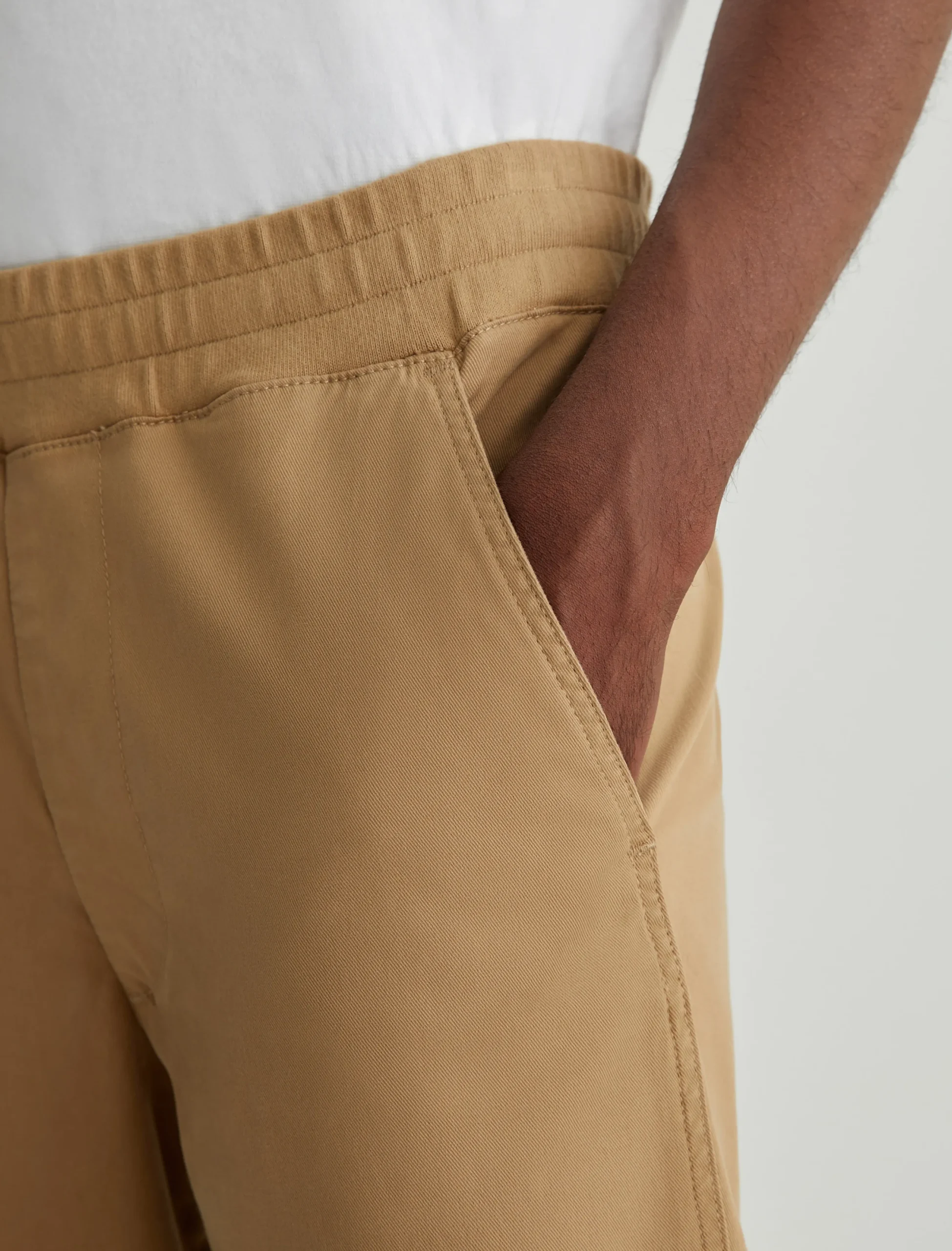 The Wyatt Sweatpant is a comfortable men’s jogger updated in a Sorrento Stretch Twill from Italy. Soft and lightweight, these tan pants are relaxed yet slim with an elasticized waist, interior drawstring, and tapered legs.