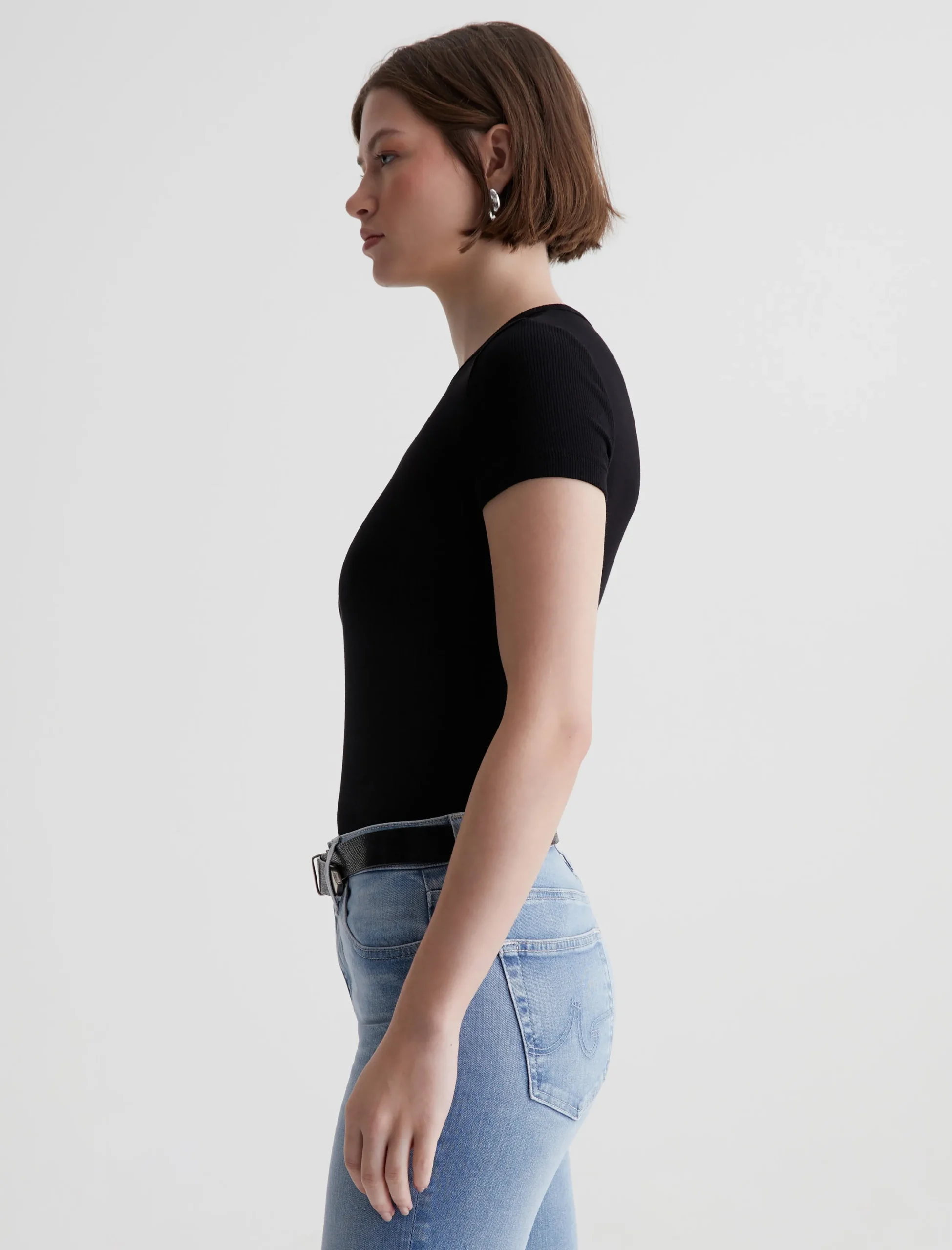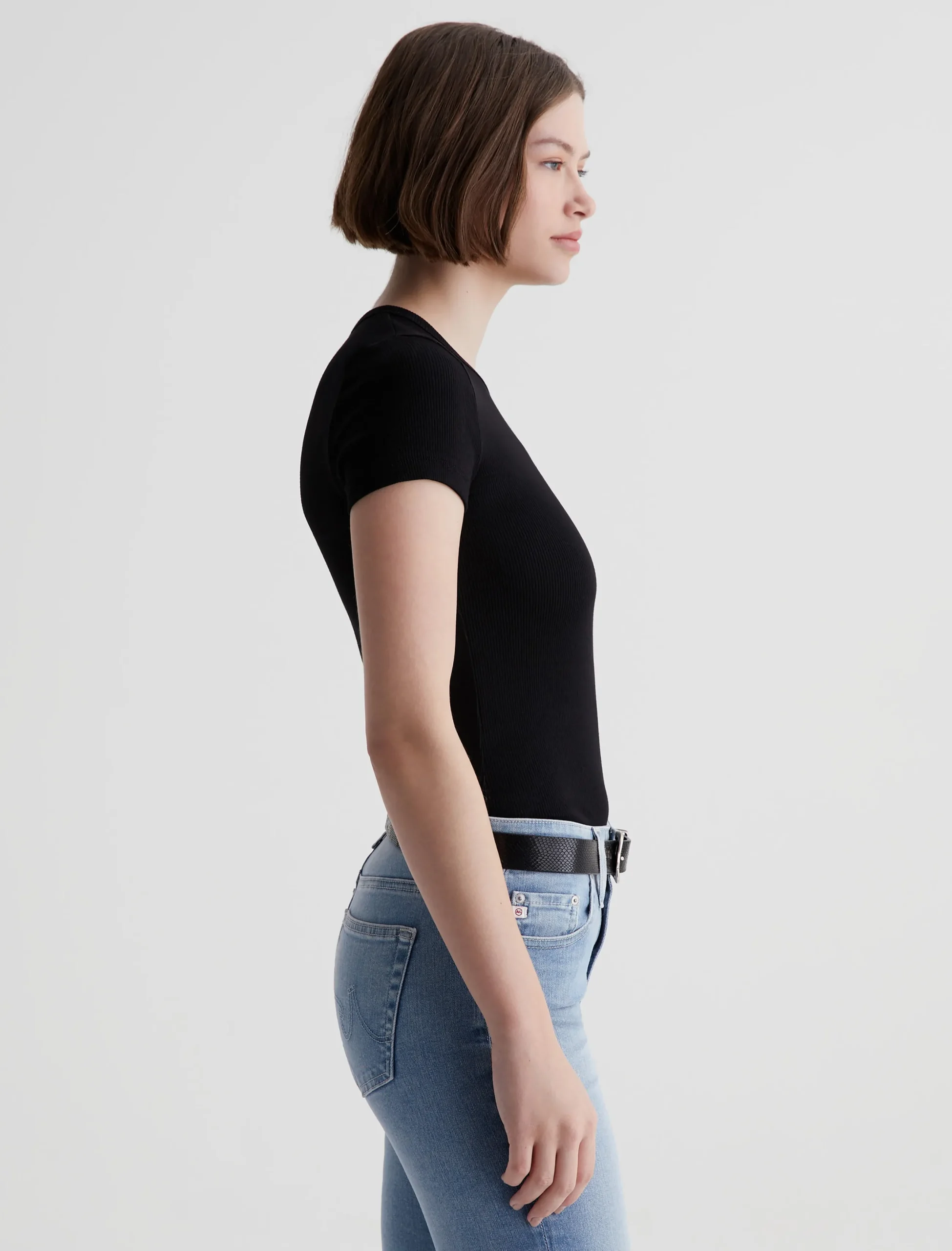The Agnes Crew is a slim-fit tee made from a soft, breathable rib knit in black. The short-sleeve style sits close to the body and has a self-bound crew neckline for a clean finish.
