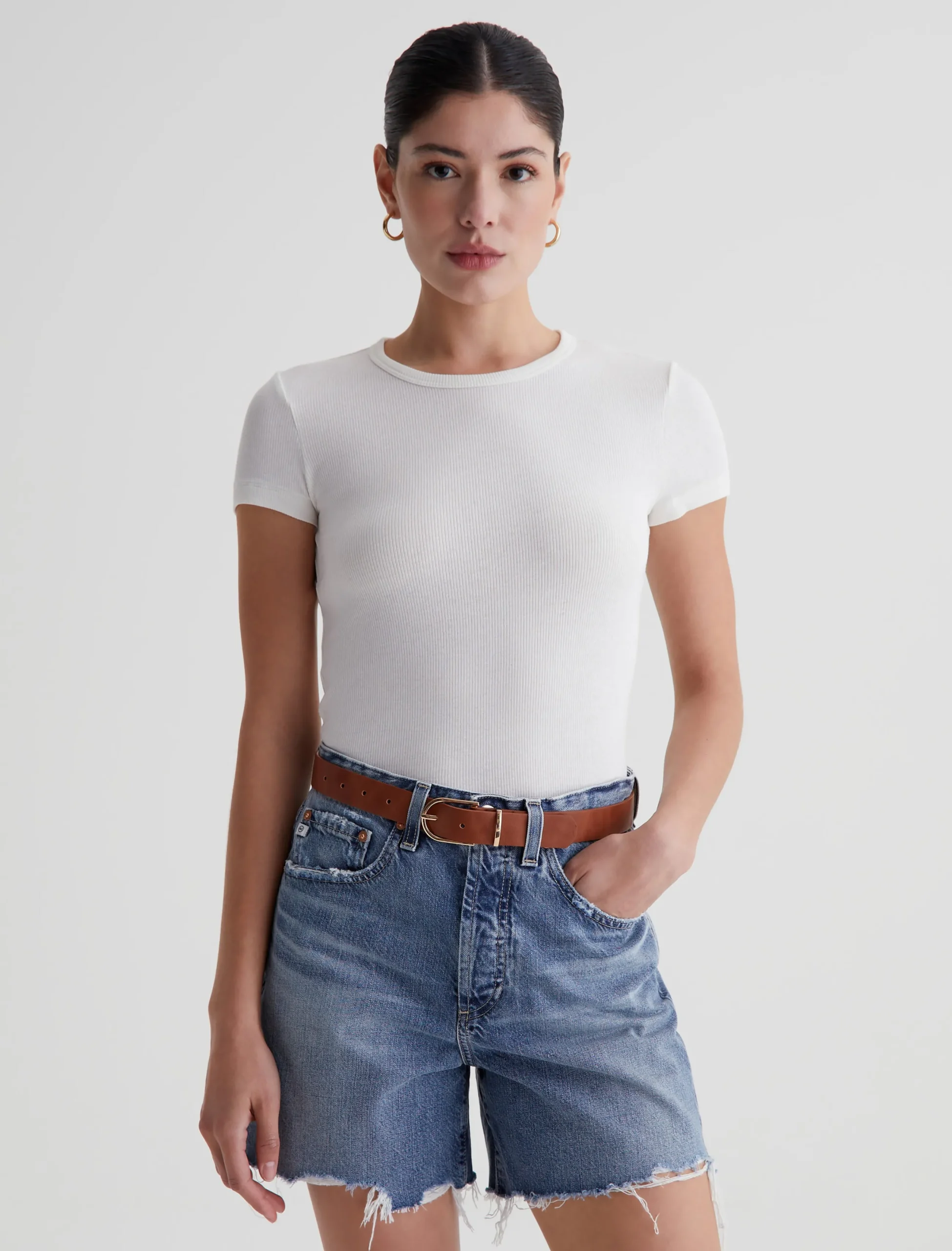 The Agnes Crew is a slim-fit tee made from a soft, breathable rib knit in white. The short-sleeve style sits close to the body and has a self-bound crew neckline for a clean finish.