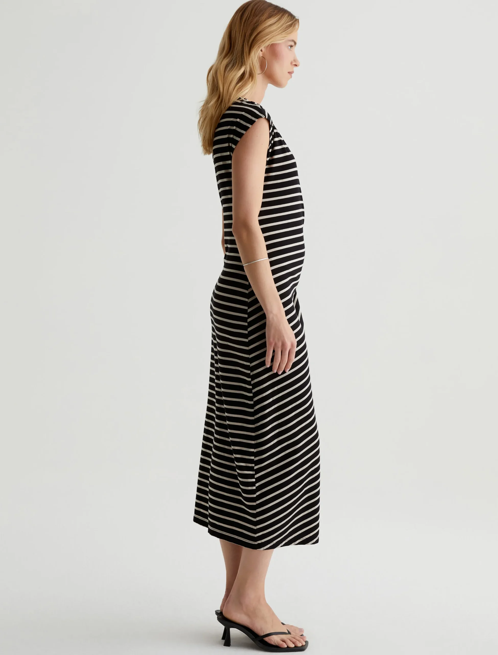 The Aja Dress wears effortlessly in stretch-blend cotton jersey with black and beige stripes. Soft and comfortable, this mid-length T-shirt dress has a feminine boat neck, short dolman sleeves, and pleat detailing at the side waist.
