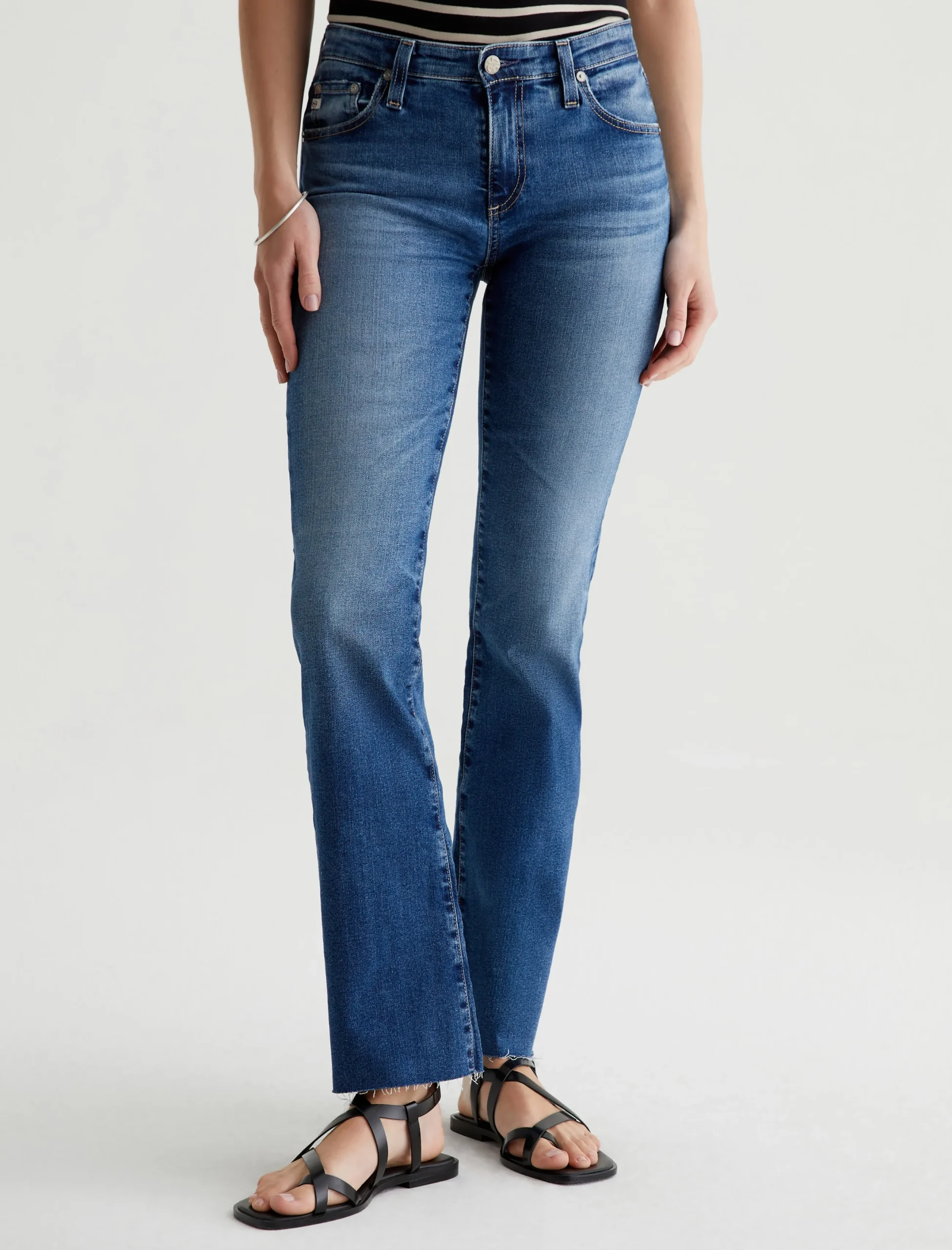 The Angel low-rise bootcut jeans have a subtly flared silhouette with raw hems. Cut from 10 oz. Empower Denim, this pair has shape-hugging stretch and premium recovery. It comes in a dark blue wash featuring a 14-year AG-ed™ fade complete with whiskering and worn edges. Contrast topstitching finishes the look.