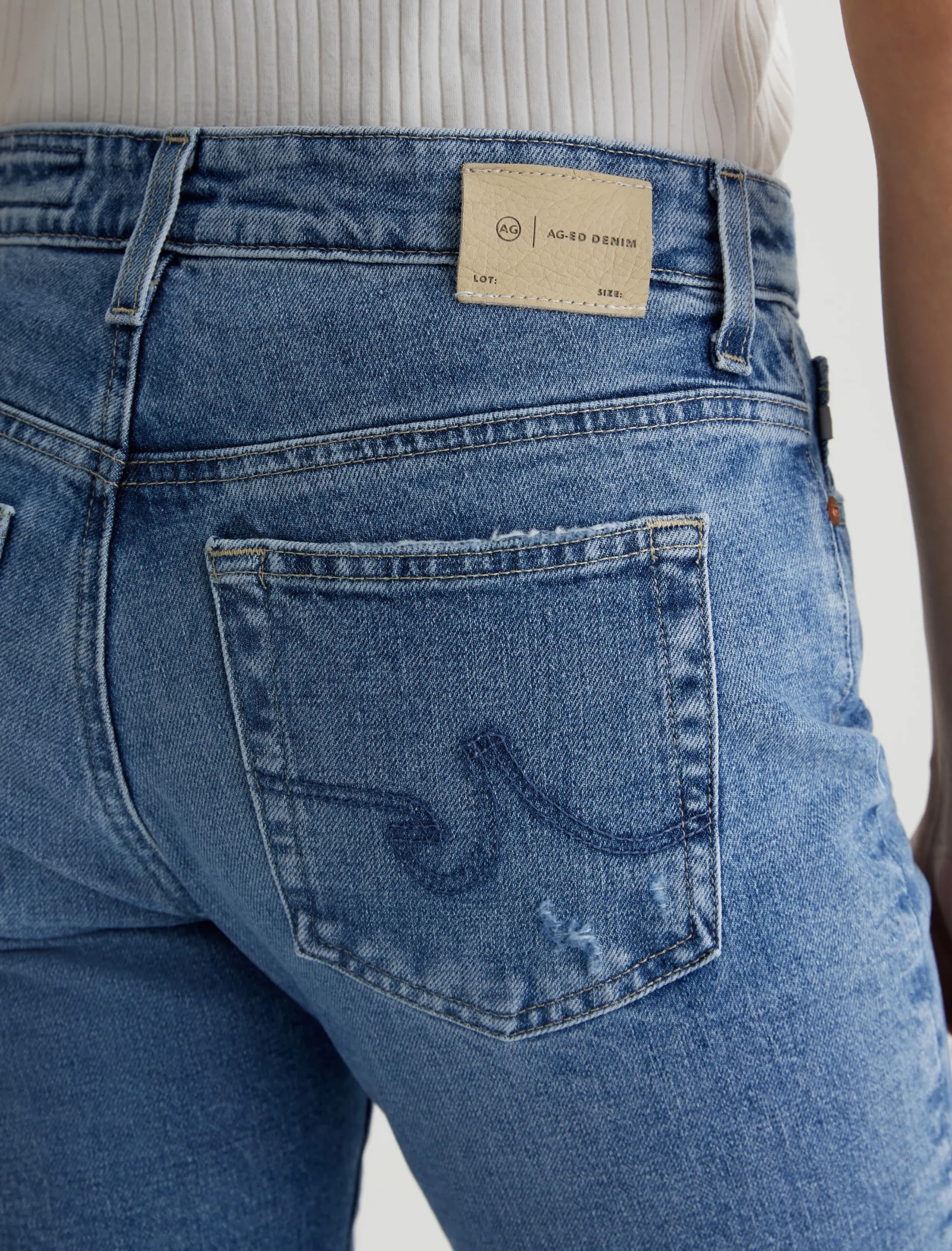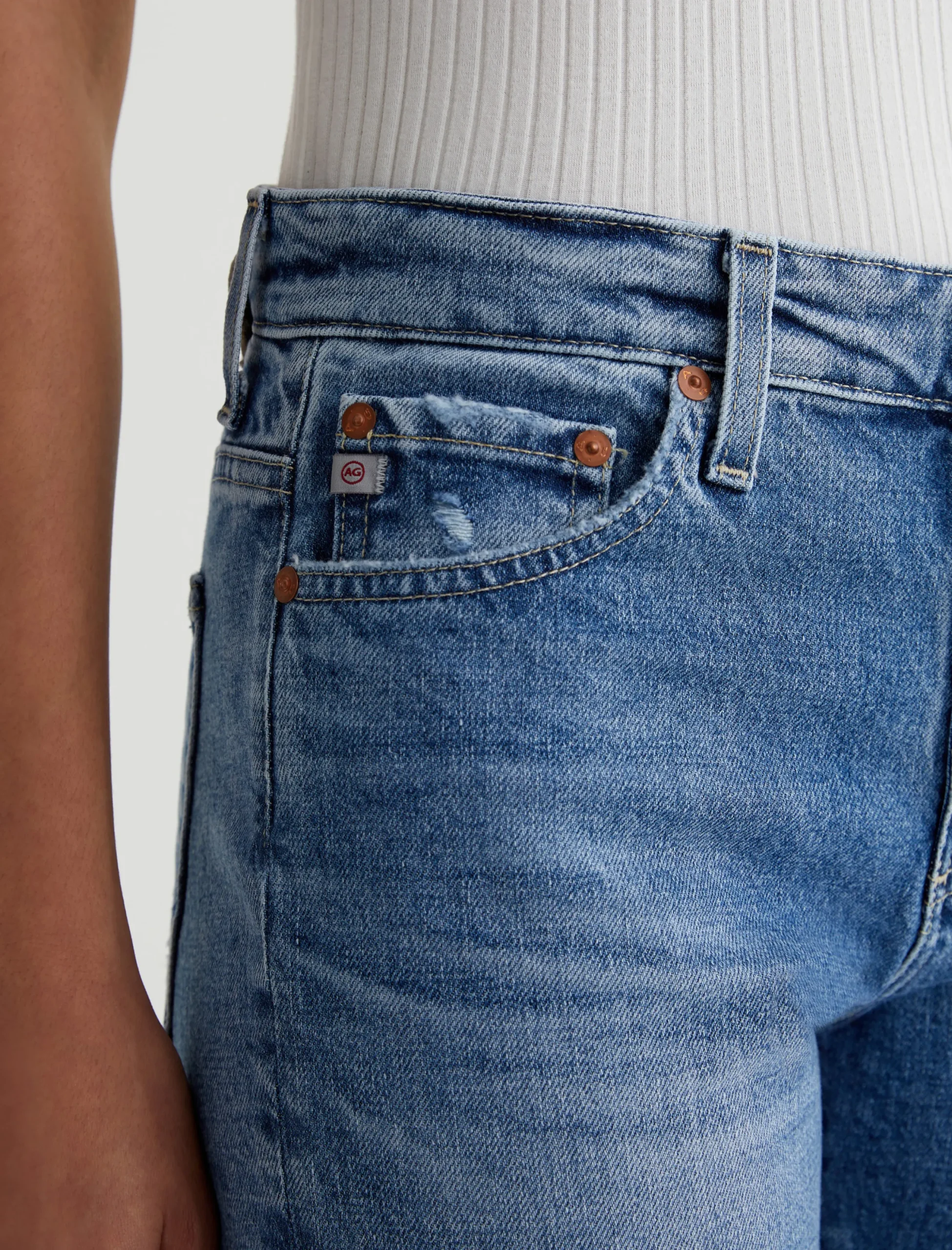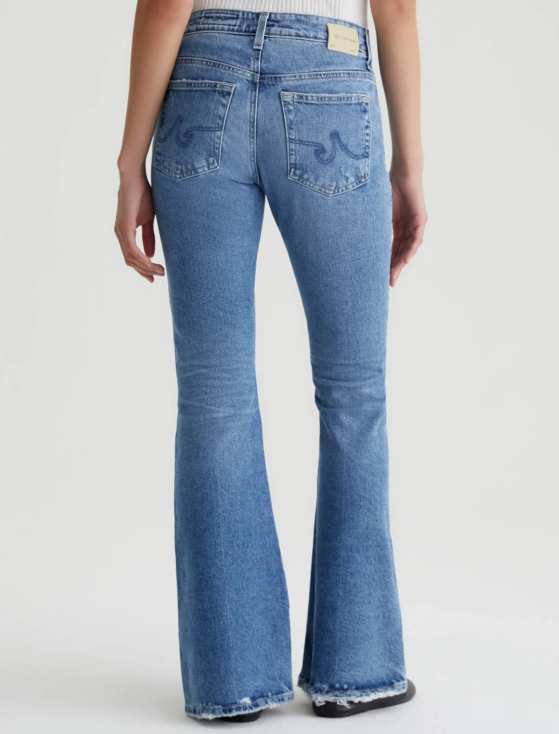 Angeline is a mid-rise jean with a dramatic flared silhouette. It’s featured here in a faded light blue wash featuring slightly frayed hems and subtle distressing at the pockets. These mid-rise flare jeans come in 11 oz. 360° Denim with vintage bi-stretch construction for a flattering, comfortable fit.