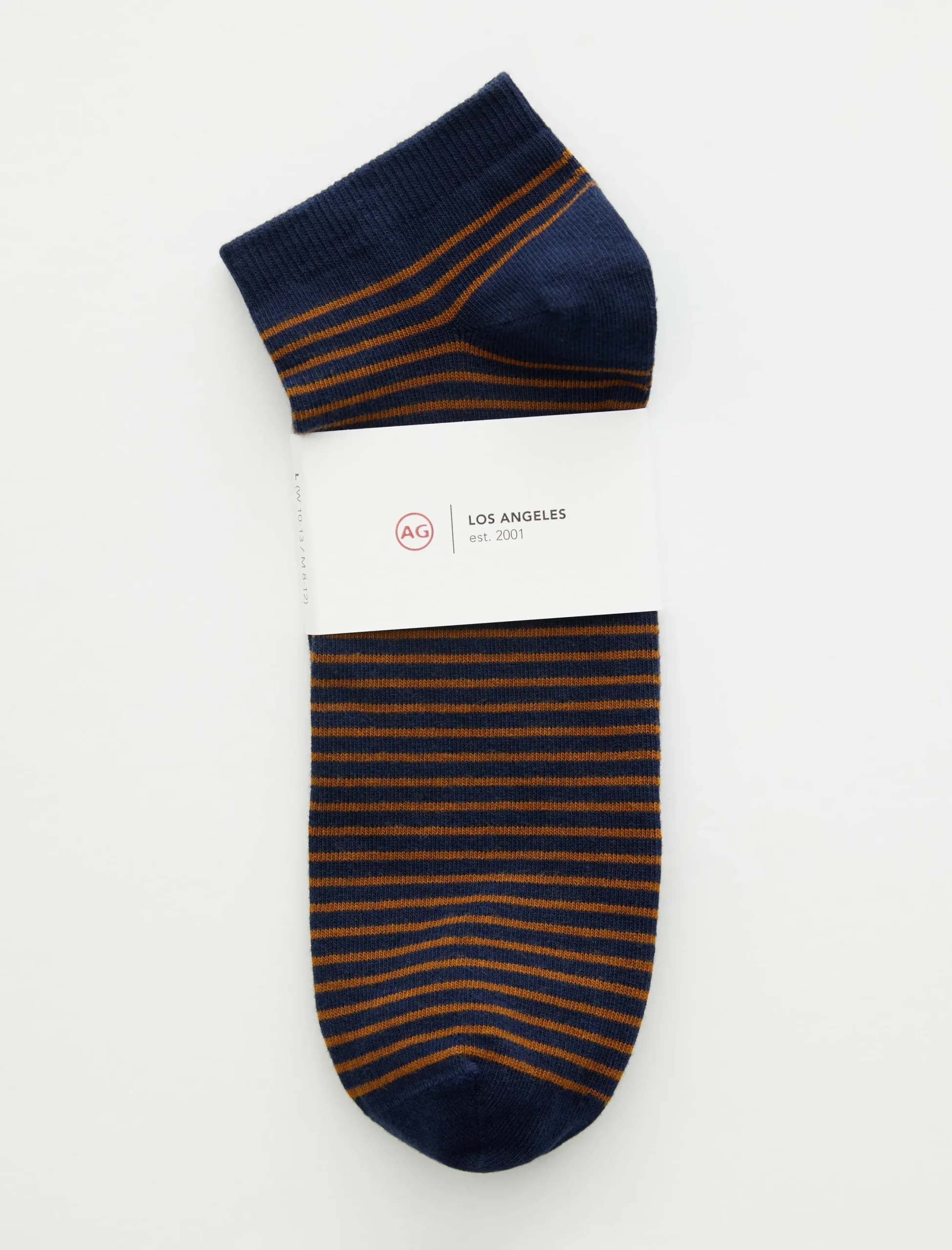 This sock is our classic ankle sock. Featuring a stripe pattern, this pair has been knitted from a comfortable cotton blend and ribbed through the ankles.
