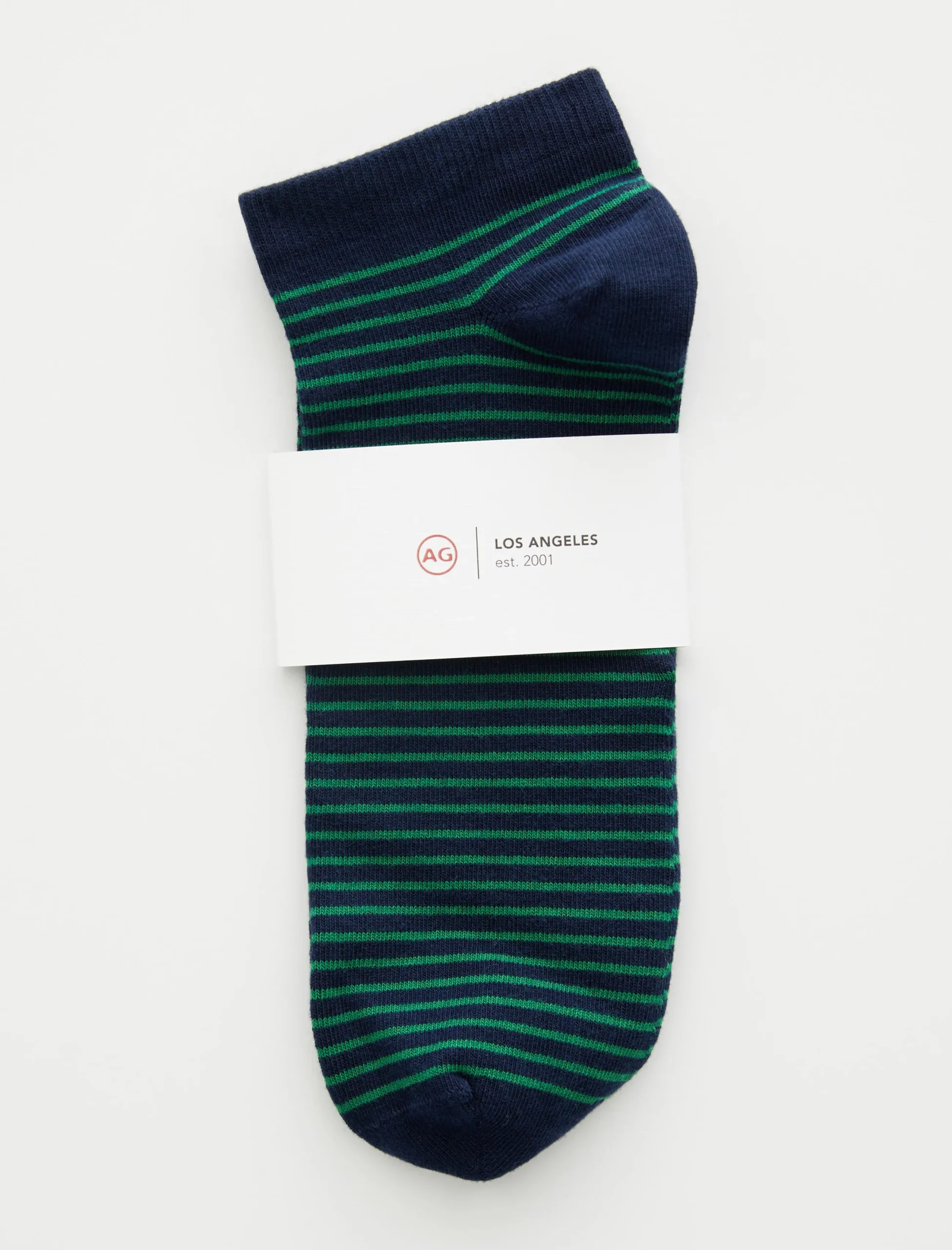 This sock is our classic ankle sock. Featuring a stripe pattern, this pair has been knitted from a comfortable cotton blend and ribbed through the ankles.
