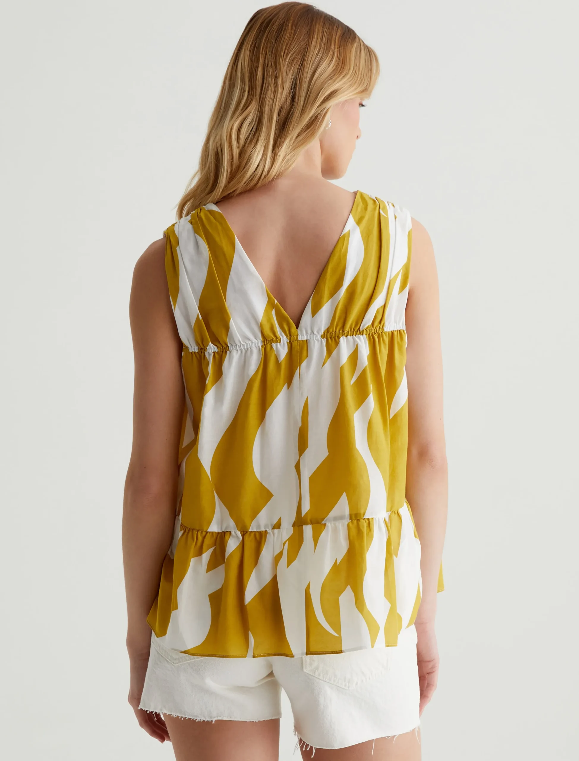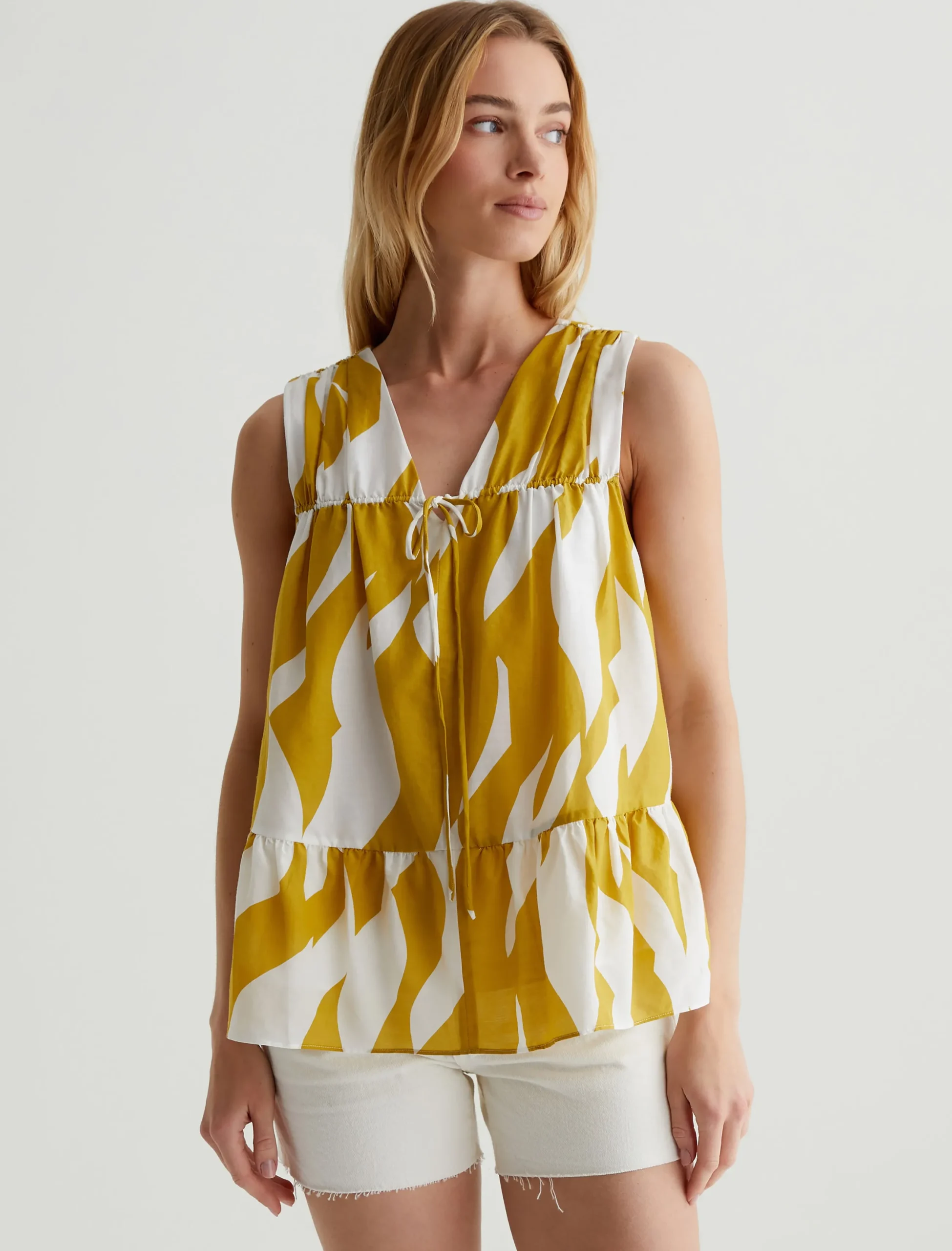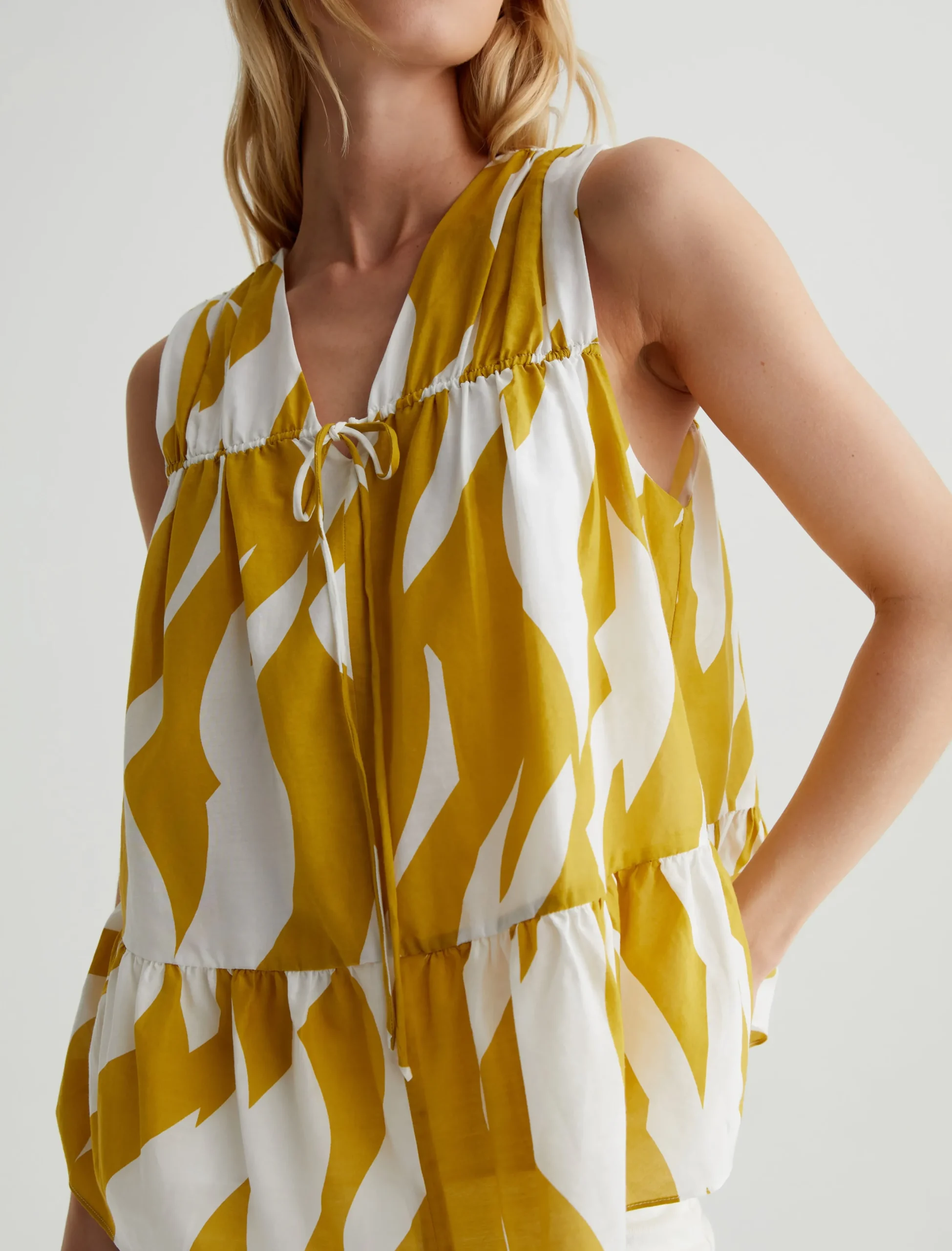 The Ariella sleeveless shirred blouse has a loose, airy silhouette in lightweight cotton silk voile. Printed with a statement-making wave motif, this breezy number moves beautifully. It’s got a V-shaped neckline and a delicate front tie to adjust the fit before it flows to a delicately ruffled hem.