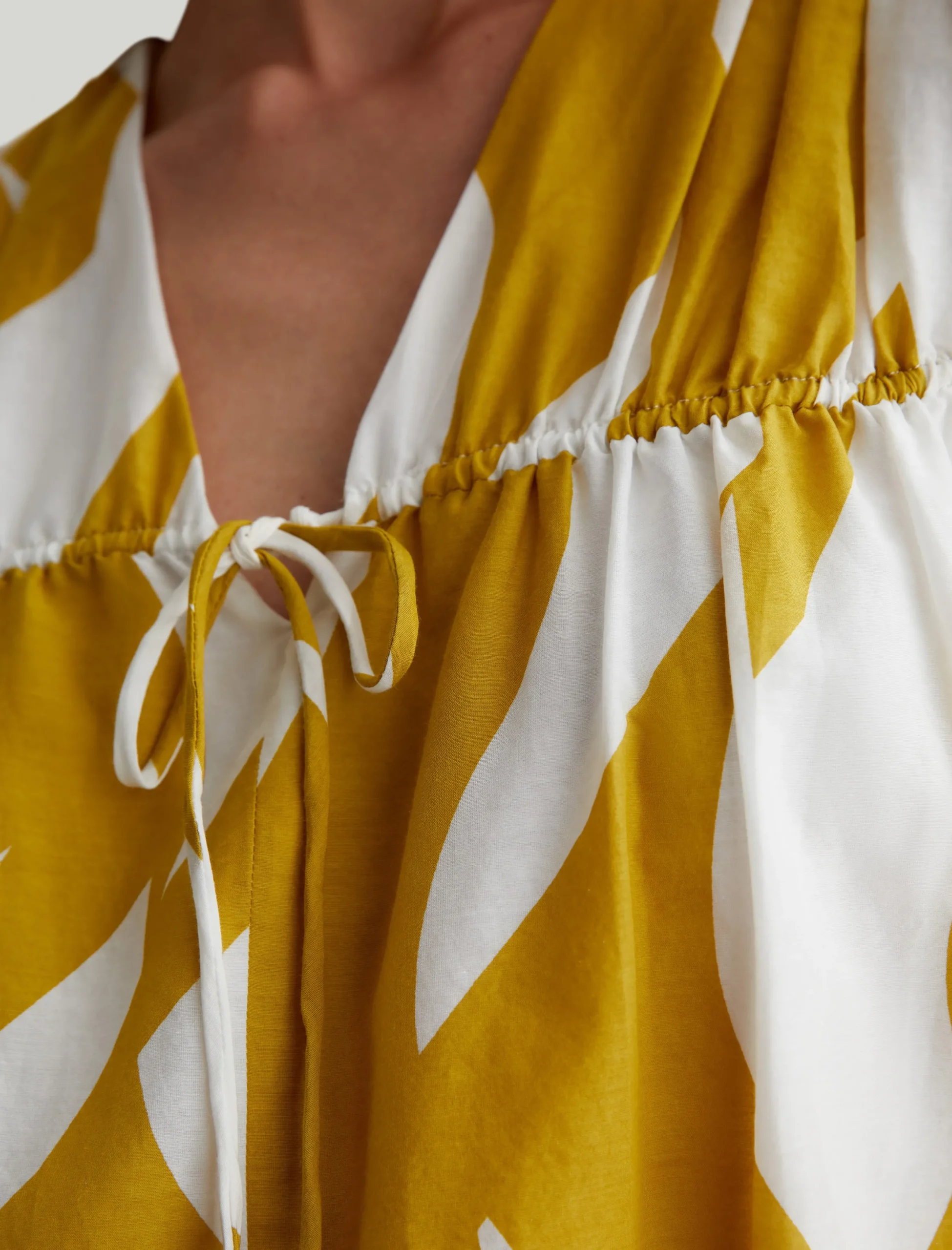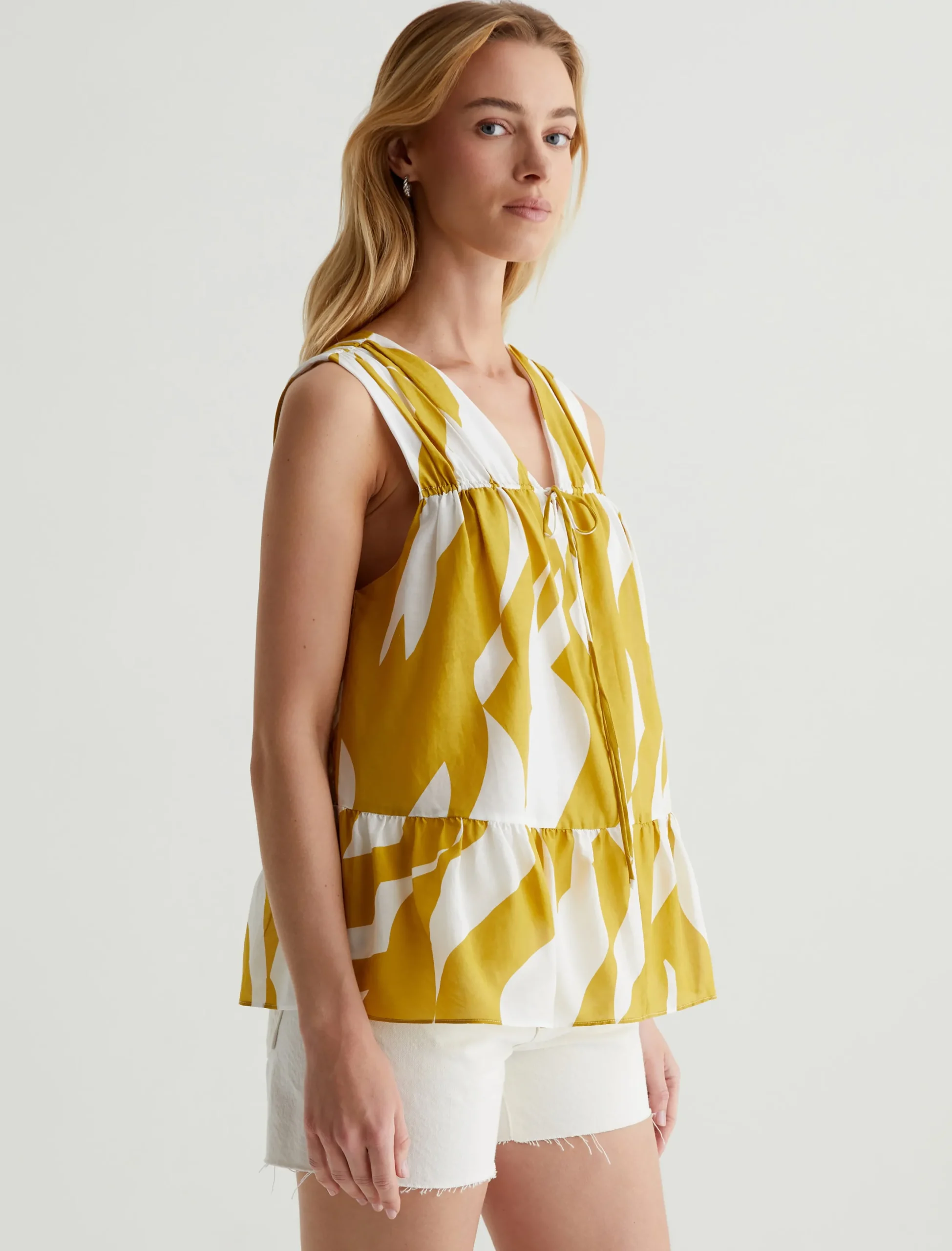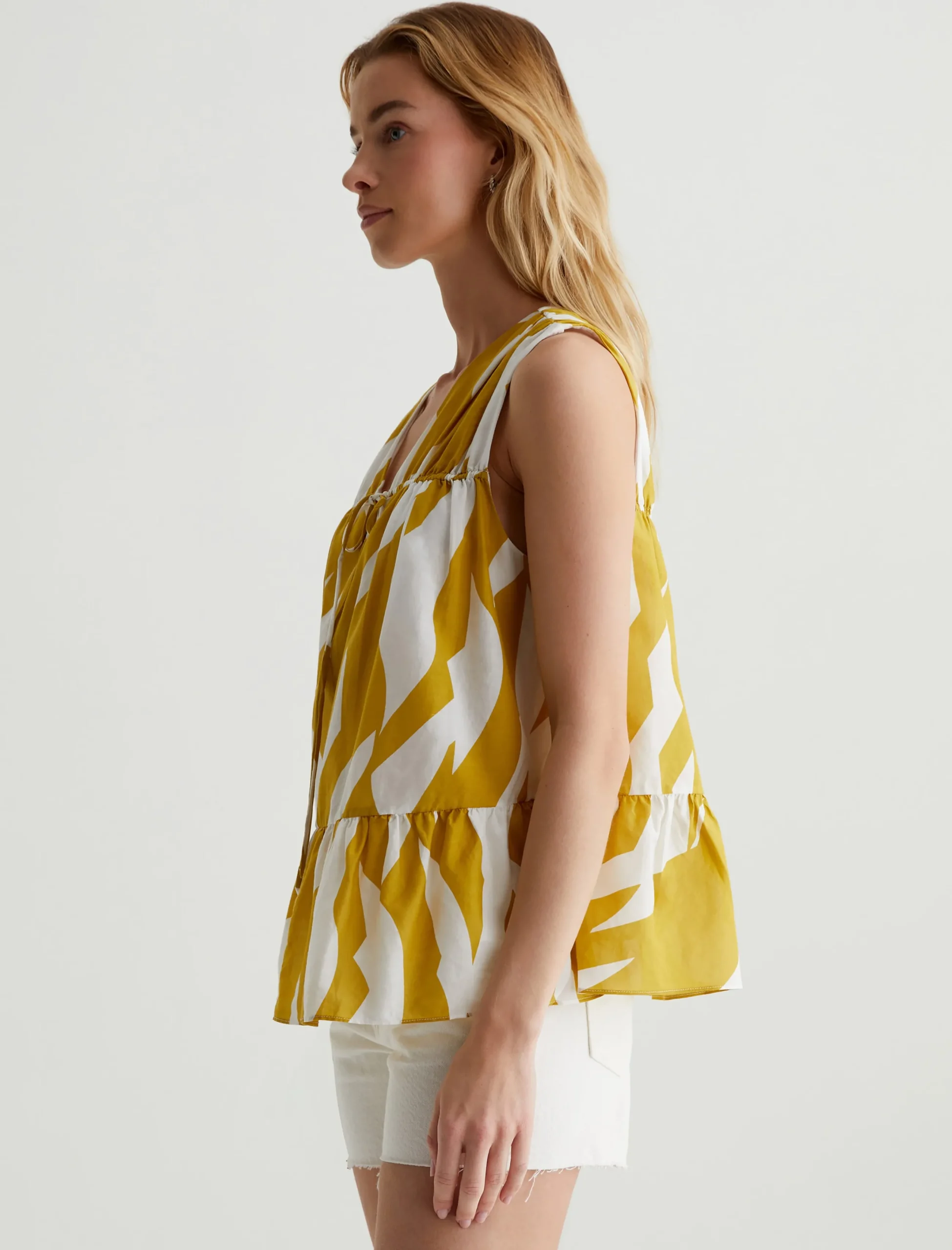 The Ariella sleeveless shirred blouse has a loose, airy silhouette in lightweight cotton silk voile. Printed with a statement-making wave motif, this breezy number moves beautifully. It’s got a V-shaped neckline and a delicate front tie to adjust the fit before it flows to a delicately ruffled hem.