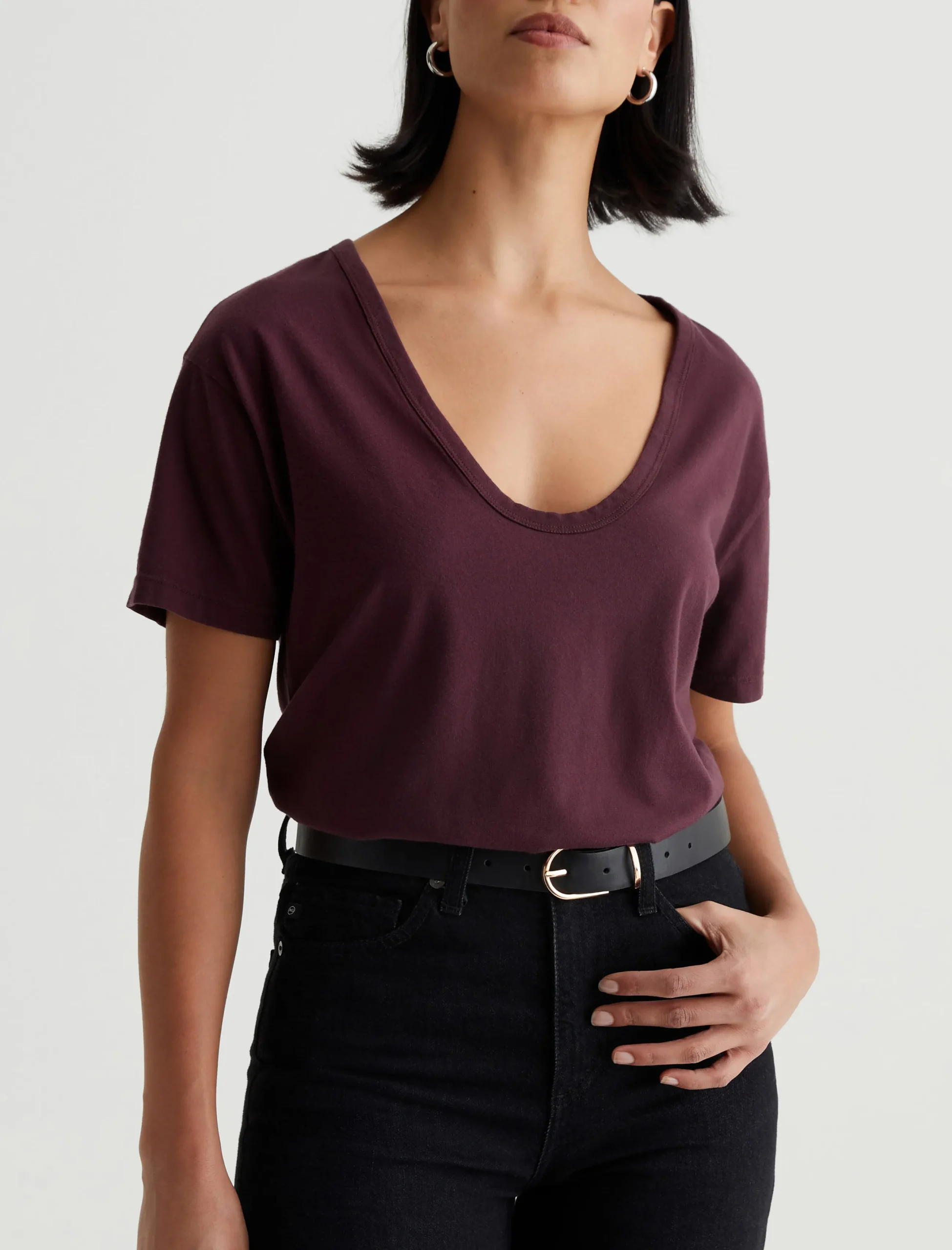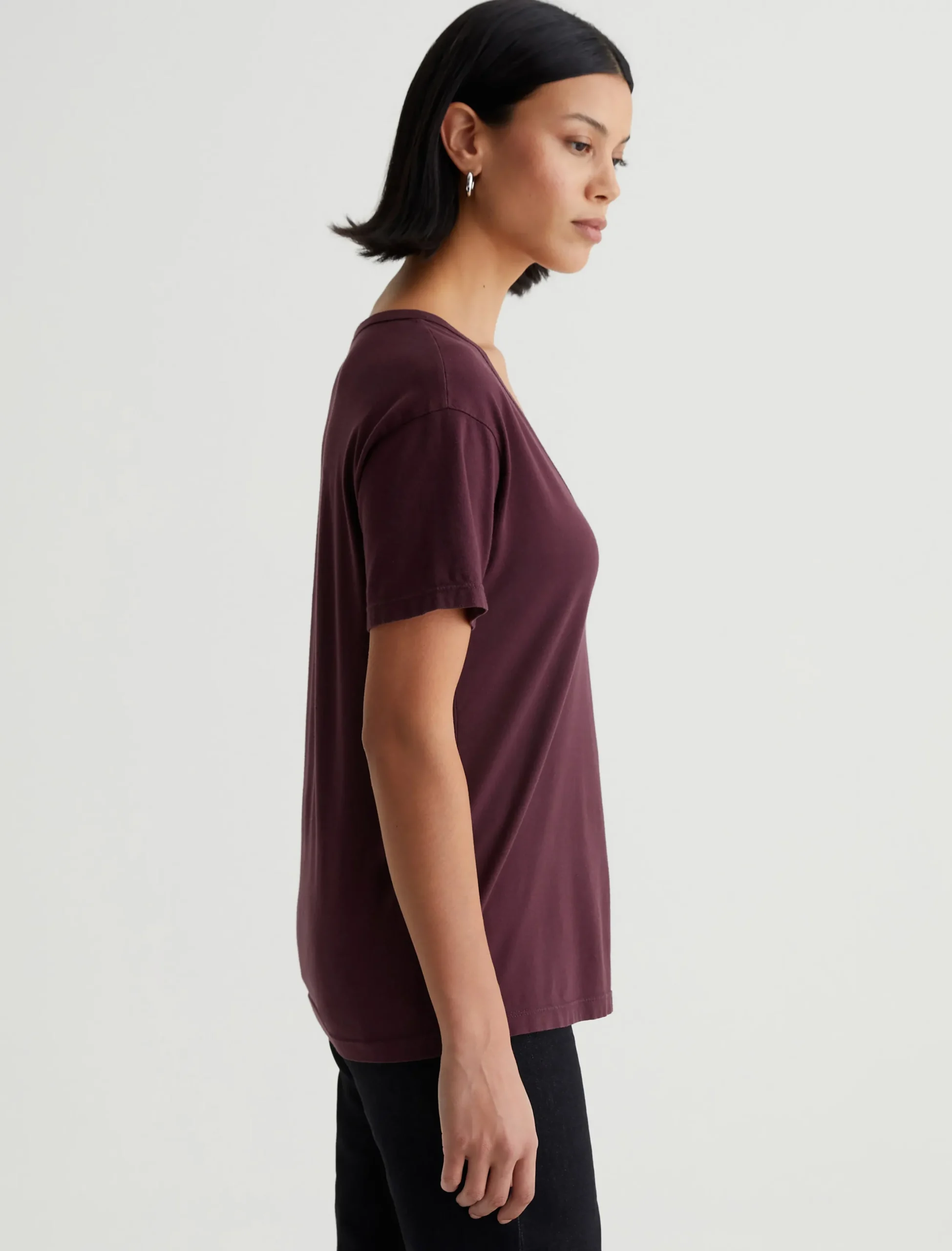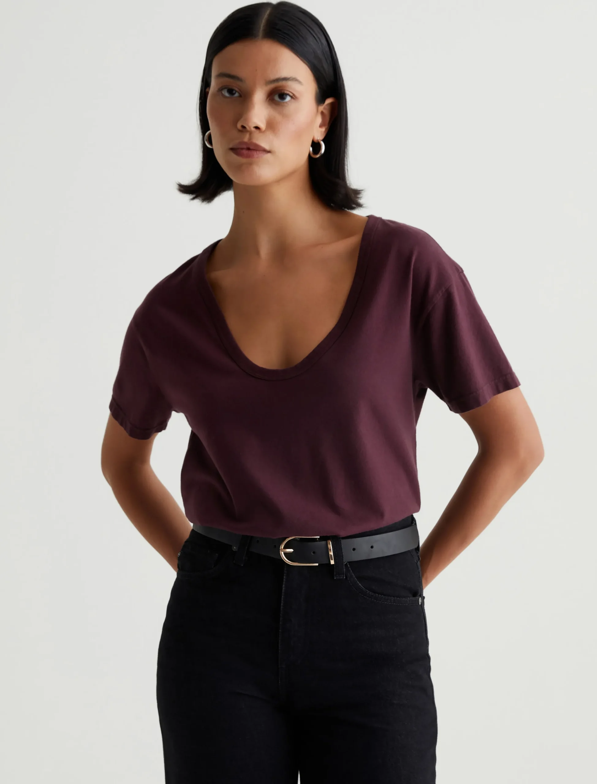 The Aspen tee has a relaxed fit with short sleeves and a flattering U-shaped neckline. Done in a dark purple shade, it’s made from 100% cotton Essential Light Jersey that combines S&Z twist yarns to prevent unnecessary twisting and torquing. The result is a softer, more durable fabric and a long-lasting shape.