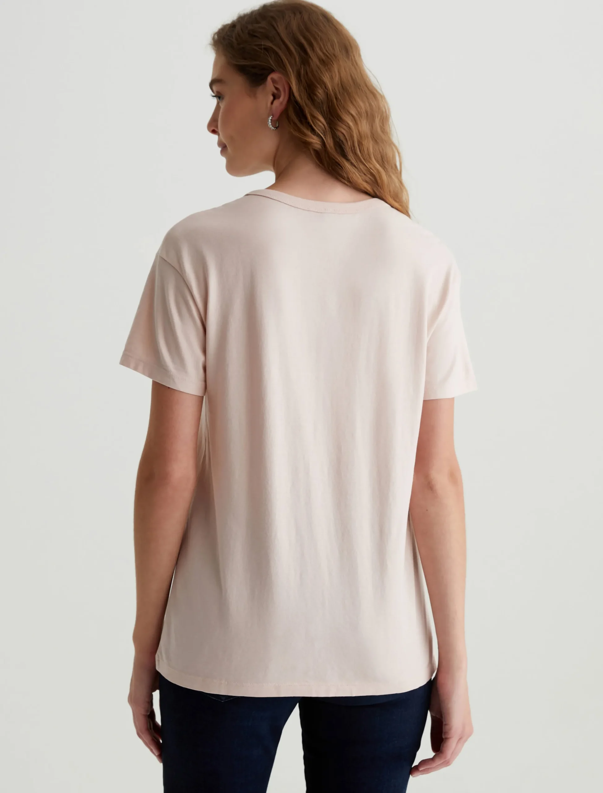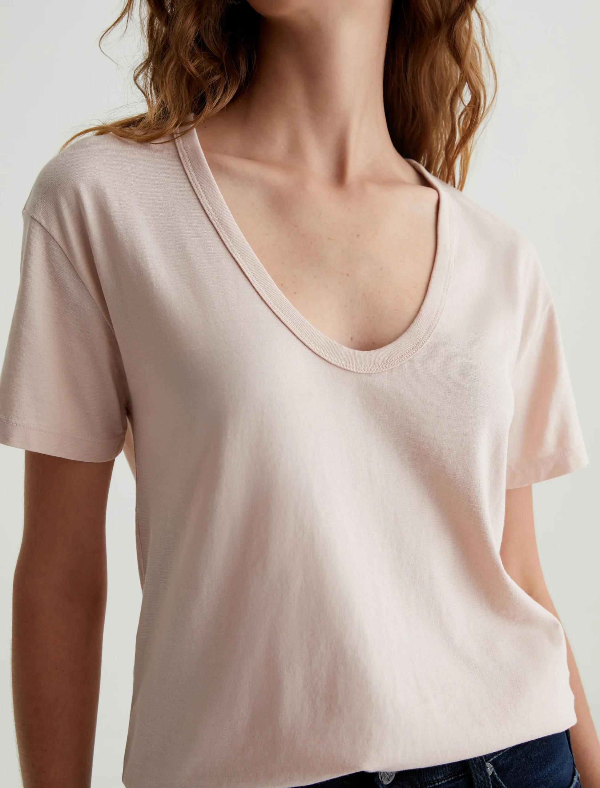 Aspen U-Neck is our classic U-neck tee that has a very easy neckline with a touch of femininity. The vintage pink tee offers a relaxed fit with a slightly dropped shoulder. An easy styling piece to dress up or down with a vintage style jean. Our Jersey Knit offers a luxurious comfort that is unrivaled—knitted with both S-twist and Z-twist yarn to sustain longevity and stability, preventing unnecessary twisting and torquing. During the production process, the S-twist yarn is spun counter-clockwise creating a right-handed twill. The Z-twist yarn works in opposition, spinning clockwise for a left-handed twill. This opposition—when working together—yields a softer, more durable fabrication and gives strength to the yarn making it more difficult to pull apart. Designed in 100% Cotton.