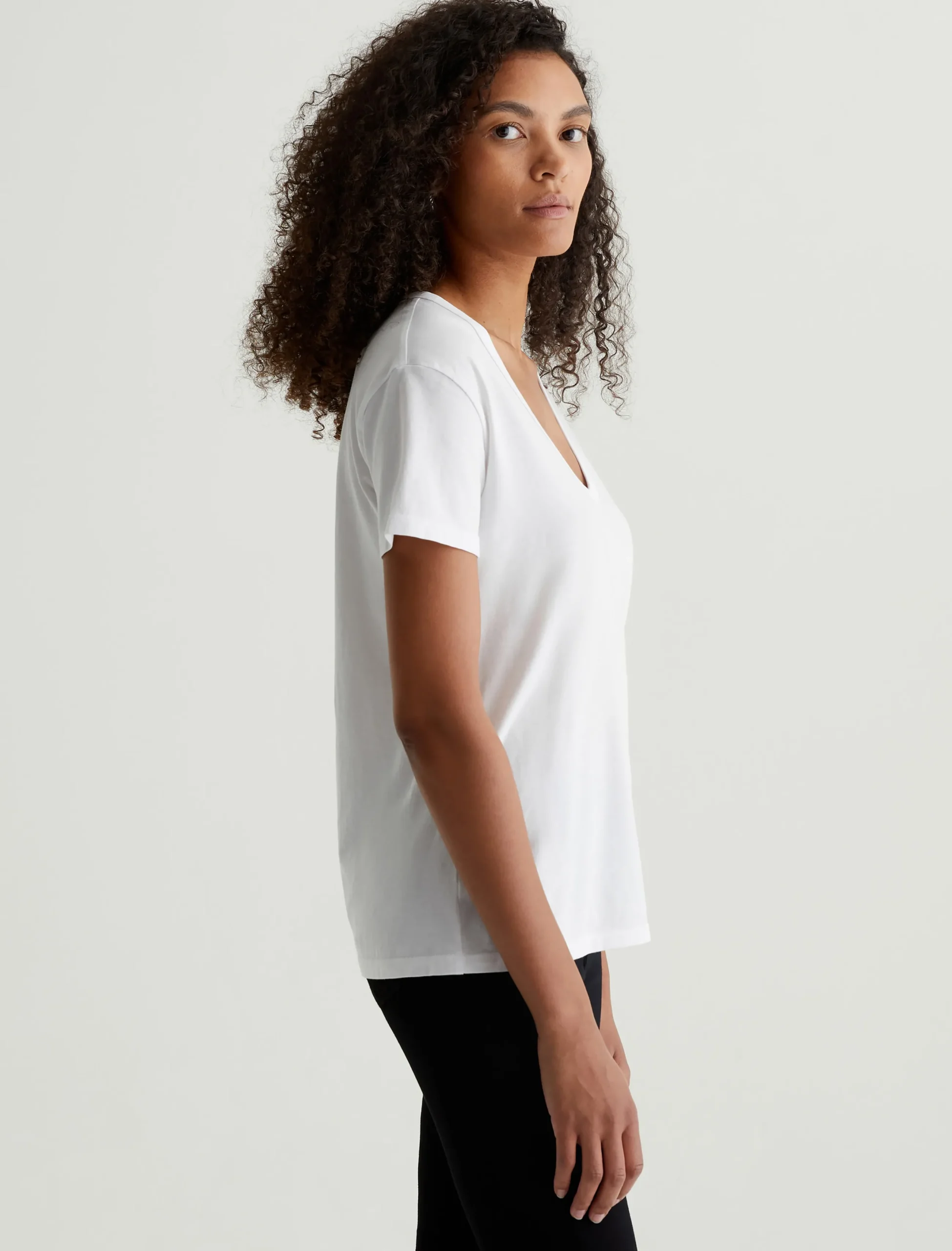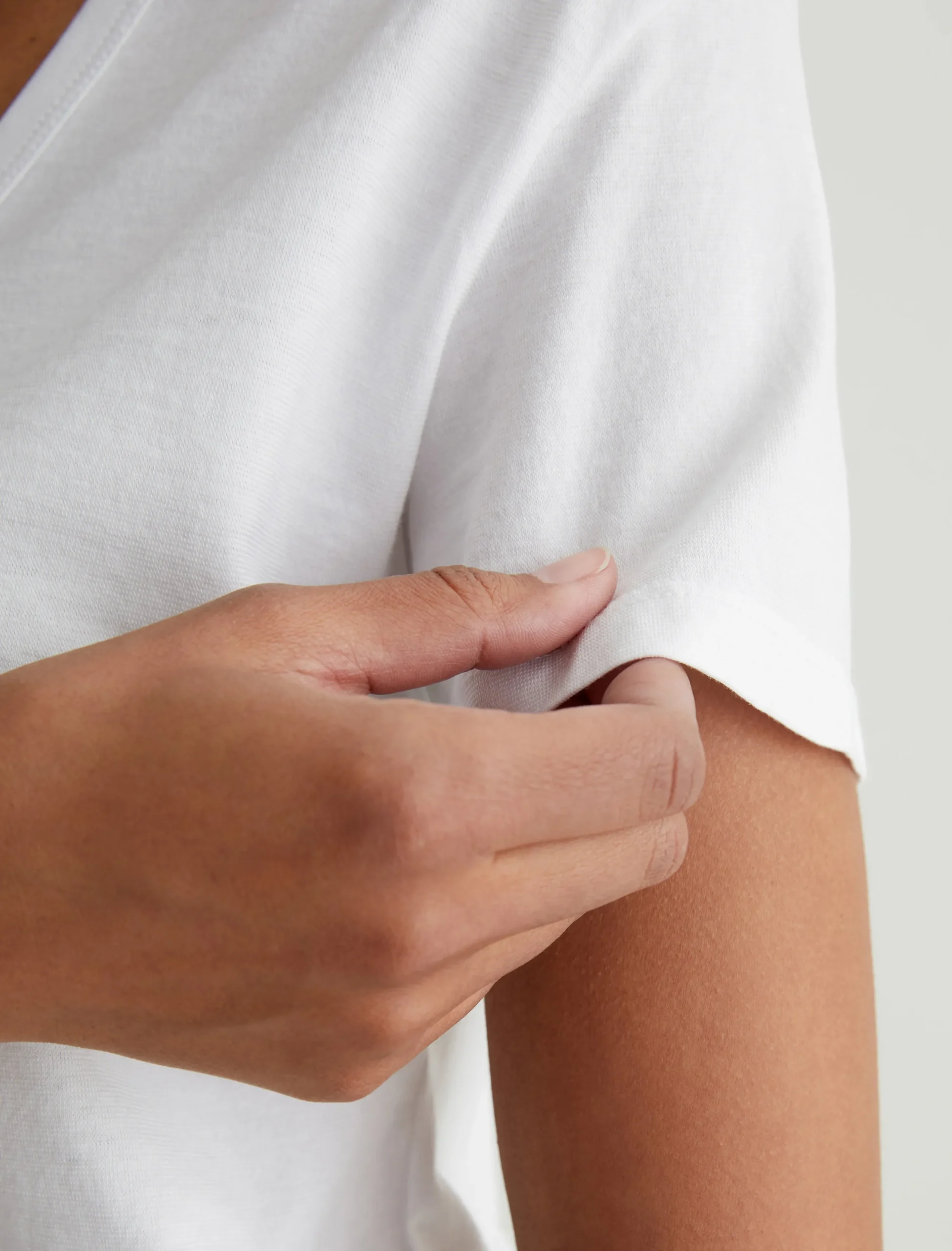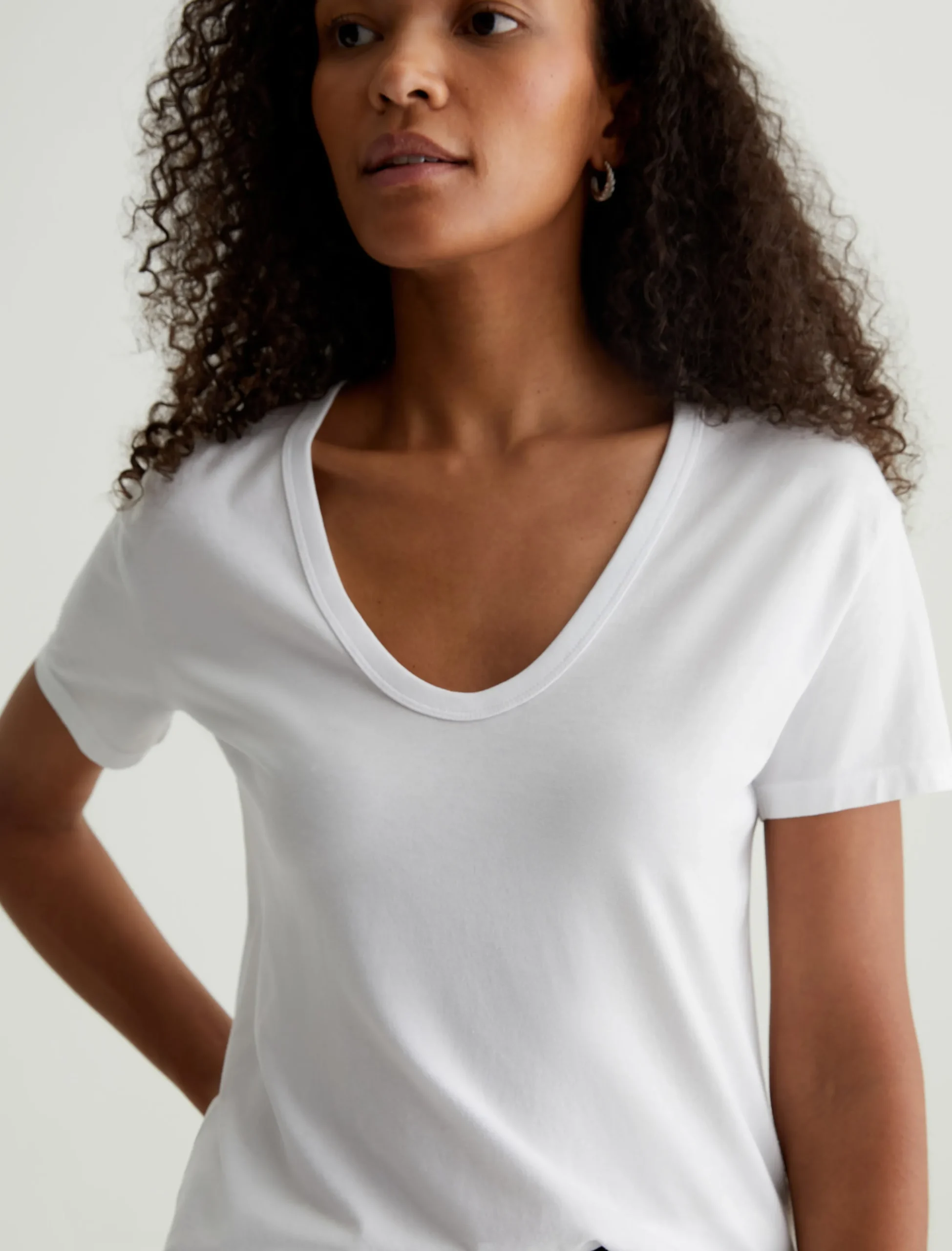Aspen U-Neck is our classic U-neck tee that has a very easy neckline with a touch of femininity. The white tee offers a relaxed fit with a slightly dropped shoulder. An easy styling piece to dress up or down with a vintage style jean. Our Jersey Knit offers a luxurious comfort that is unrivaled—knitted with both S-twist and Z-twist yarn to sustain longevity and stability, preventing unnecessary twisting and torquing. During the production process, the S-twist yarn is spun counter-clockwise creating a right-handed twill. The Z-twist yarn works in opposition, spinning clockwise for a left-handed twill. This opposition—when working together—yields a softer, more durable fabrication and gives strength to the yarn making it more difficult to pull apart. Designed in 100% Cotton.