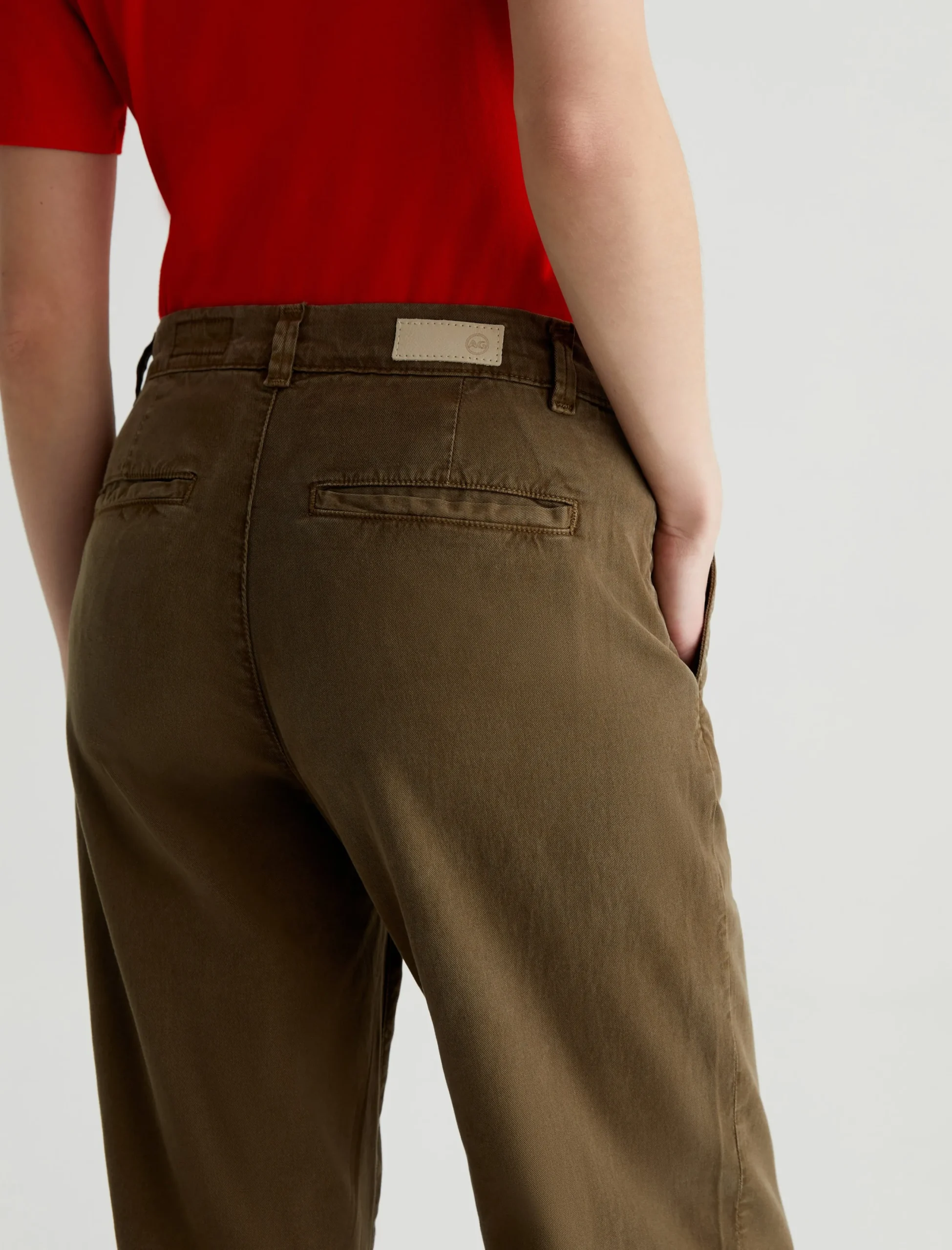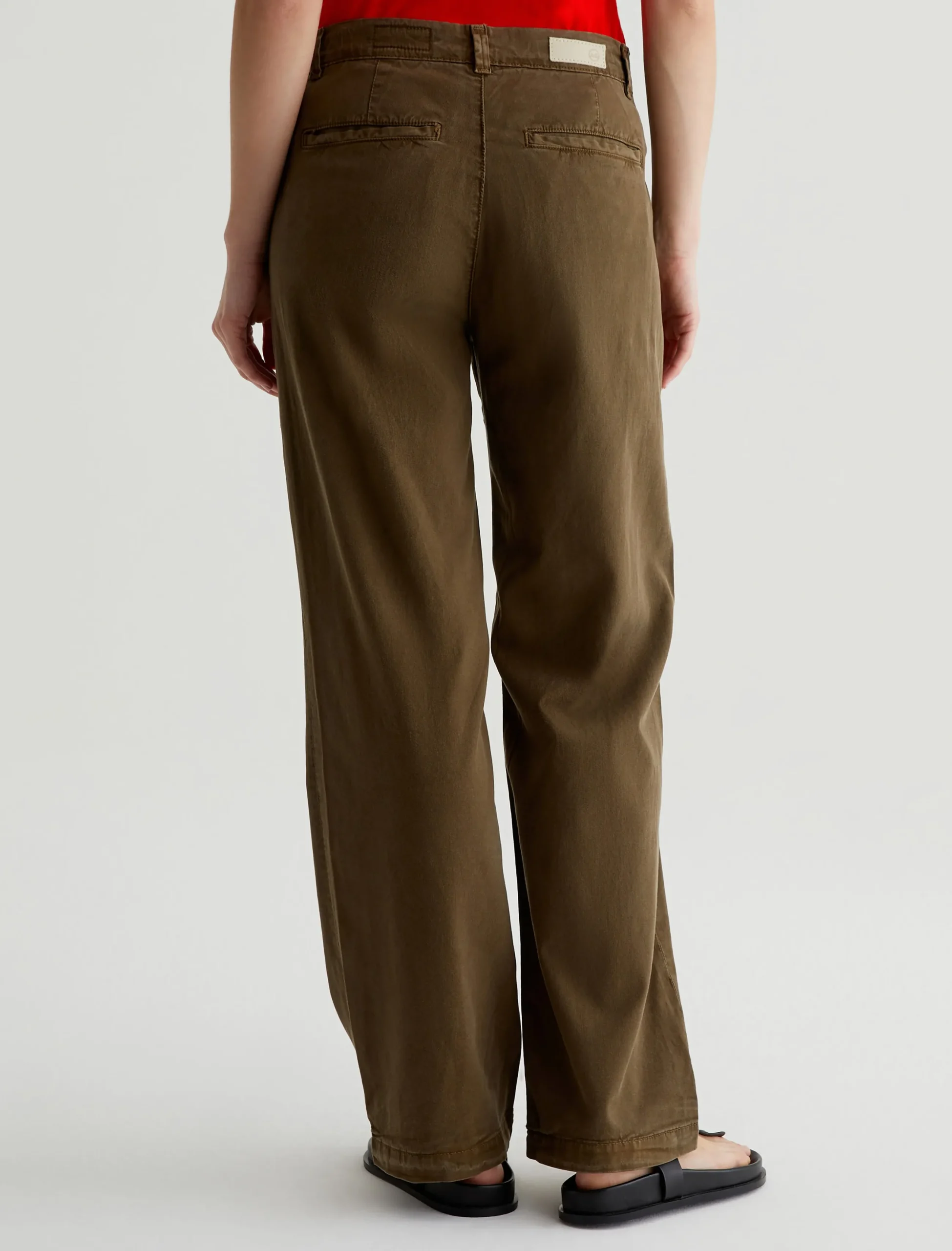 Our best-selling Caden trouser, updated in an easygoing straight-leg silhouette. Cut for a relaxed fit at the hips, these women’s tailored pants are made from soft, lightweight Stretch Cotton Tencel Twill featuring a sulfur-dyed army green. The pair has slant front pockets and welt pockets at the back.