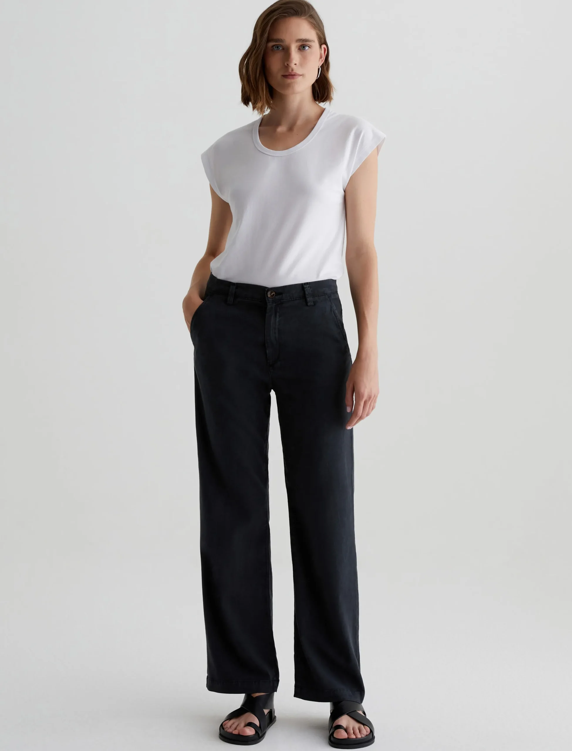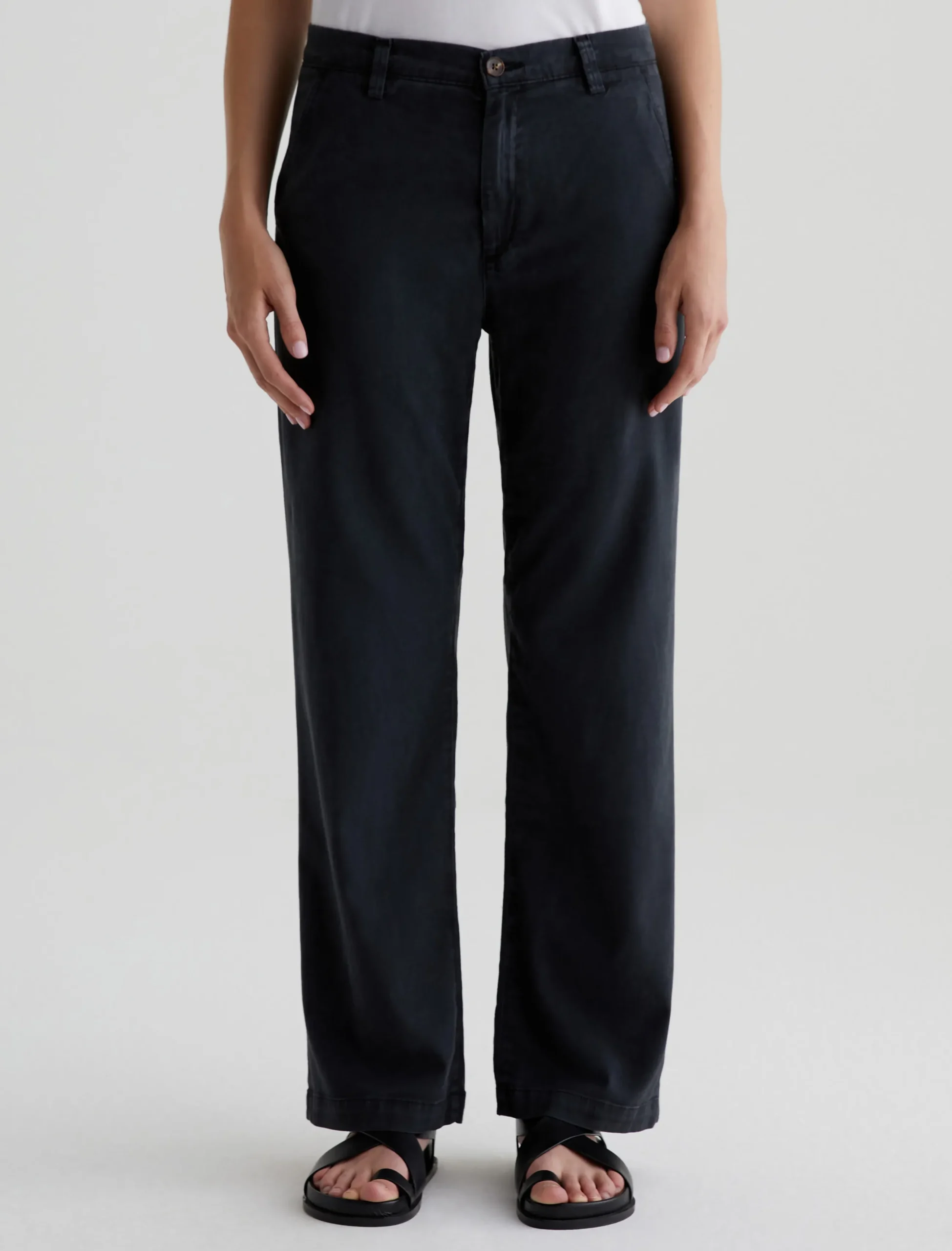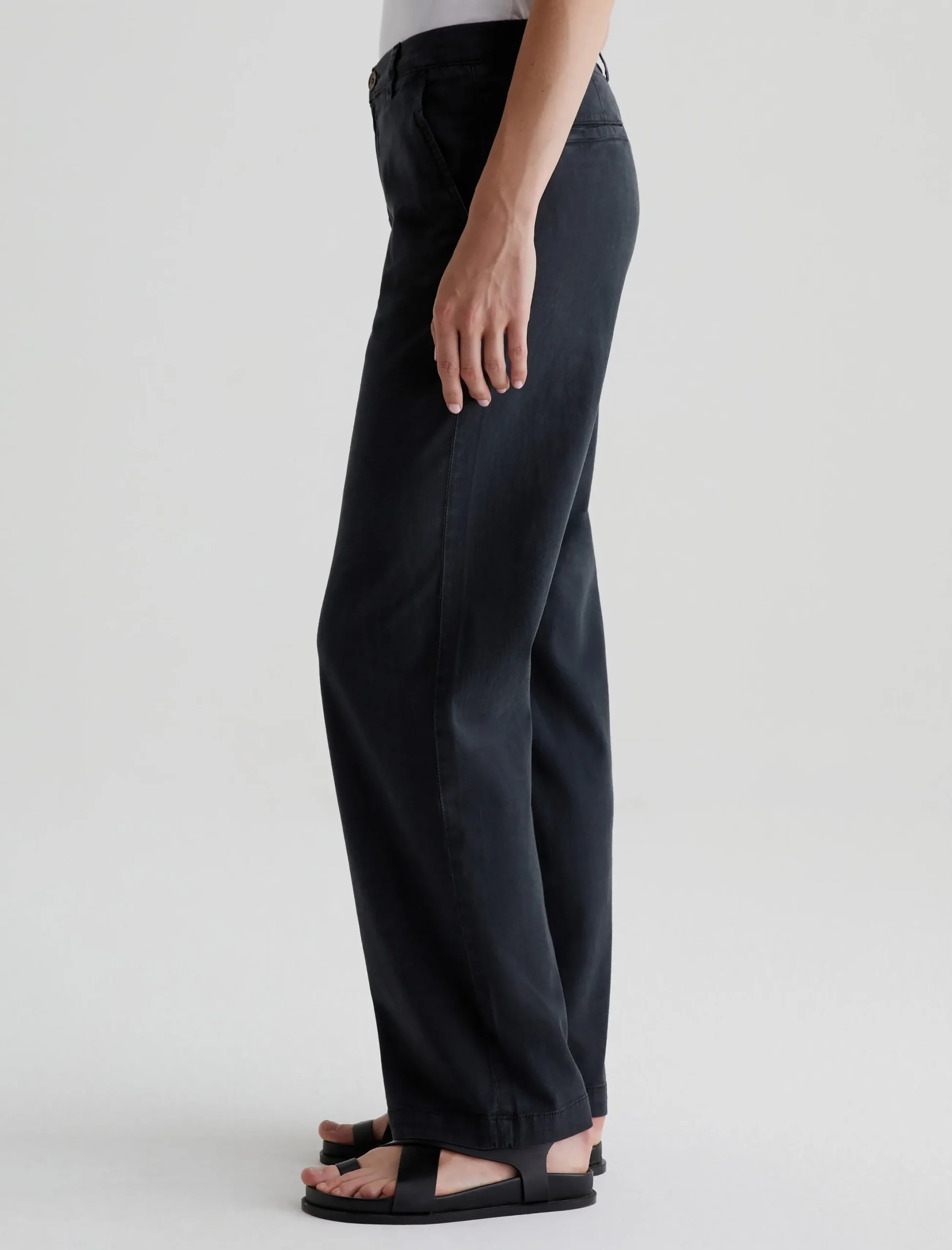 Our best-selling Caden trouser, updated in an easygoing straight-leg silhouette. Cut for a relaxed fit at the hips, these women’s tailored pants are made from soft, lightweight Stretch Cotton Tencel Twill featuring a sulfur-dyed black shade. The pair has slant front pockets and welt pockets at the back.