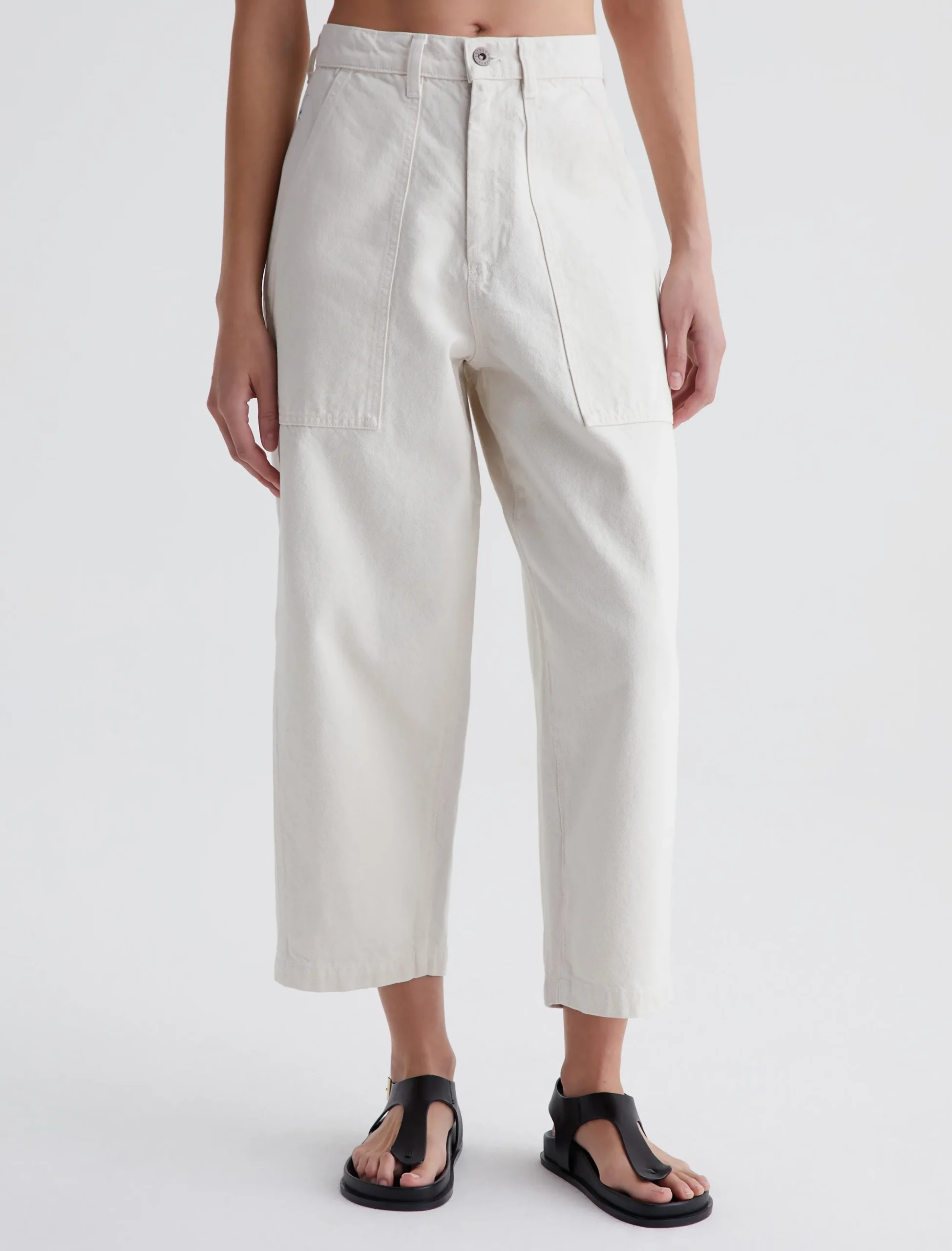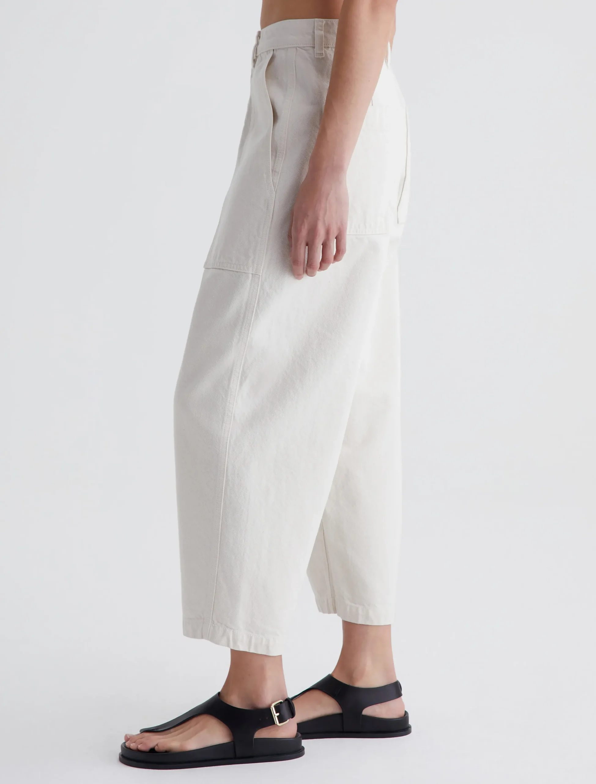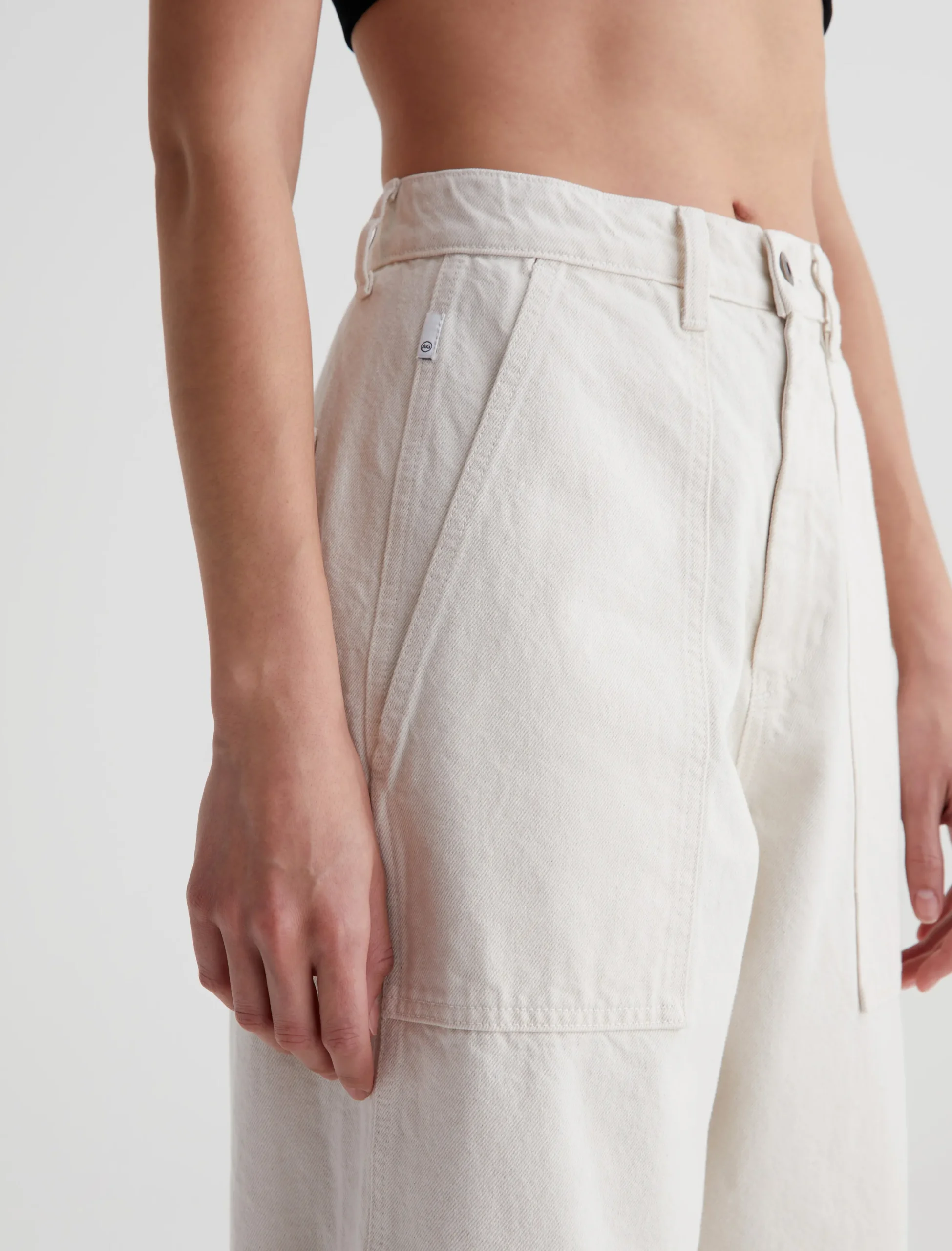 The Camille utility pant features a barrel-leg silhouette with an ultra-high waist. Made from 100% cotton Natural Bull Denim in soft white, this style has workwear-inspired front pockets and a loose, cropped fit through the legs. Complete with roomy patch pockets at the back.