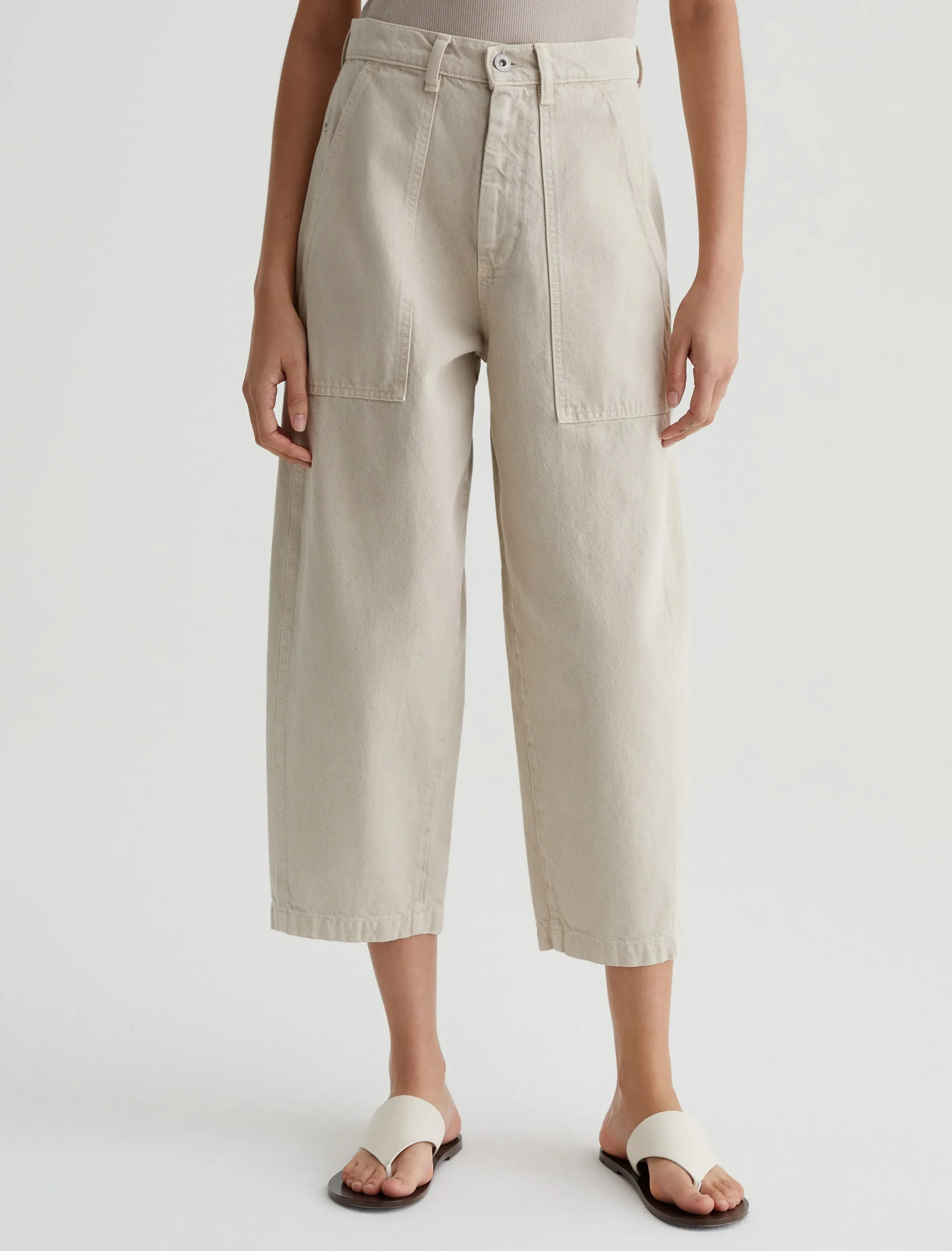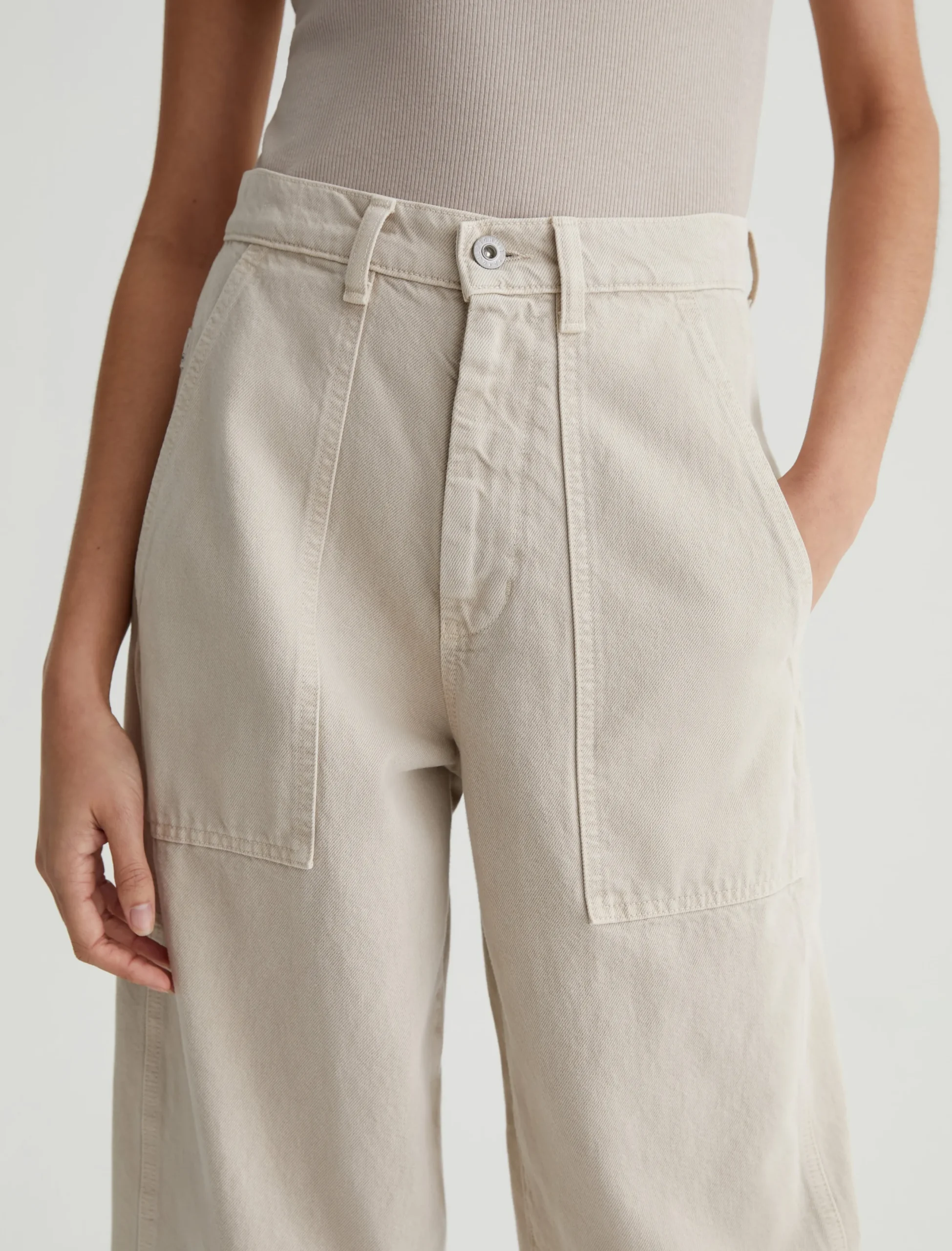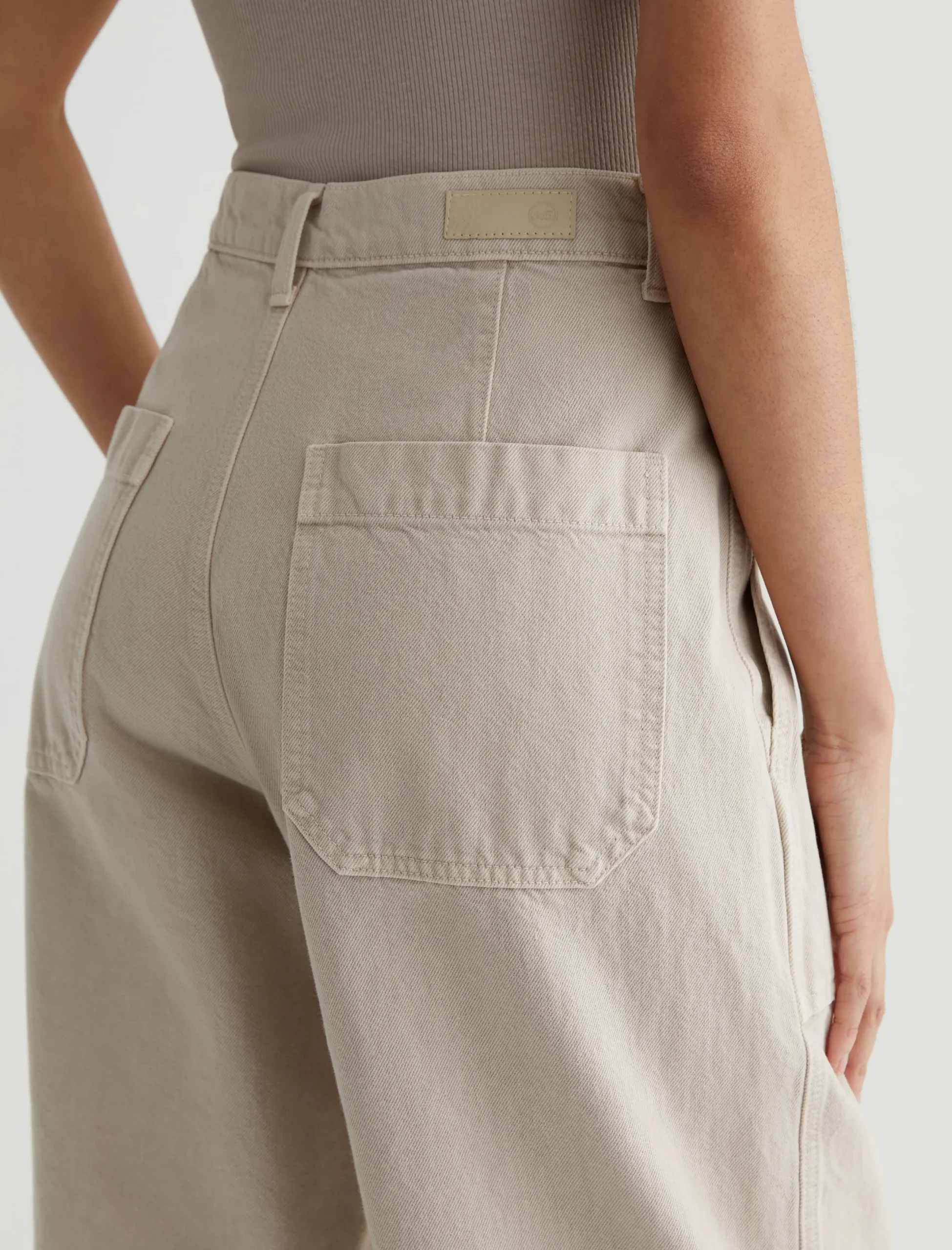 The Camille utility pant features a barrel-leg silhouette with an ultra-high waist. Made from 100% cotton Natural Bull Denim in a sulfur-dyed pale beige shade, this style has workwear-inspired front pockets and a loose, cropped fit through the legs. Complete with roomy patch pockets at the back.