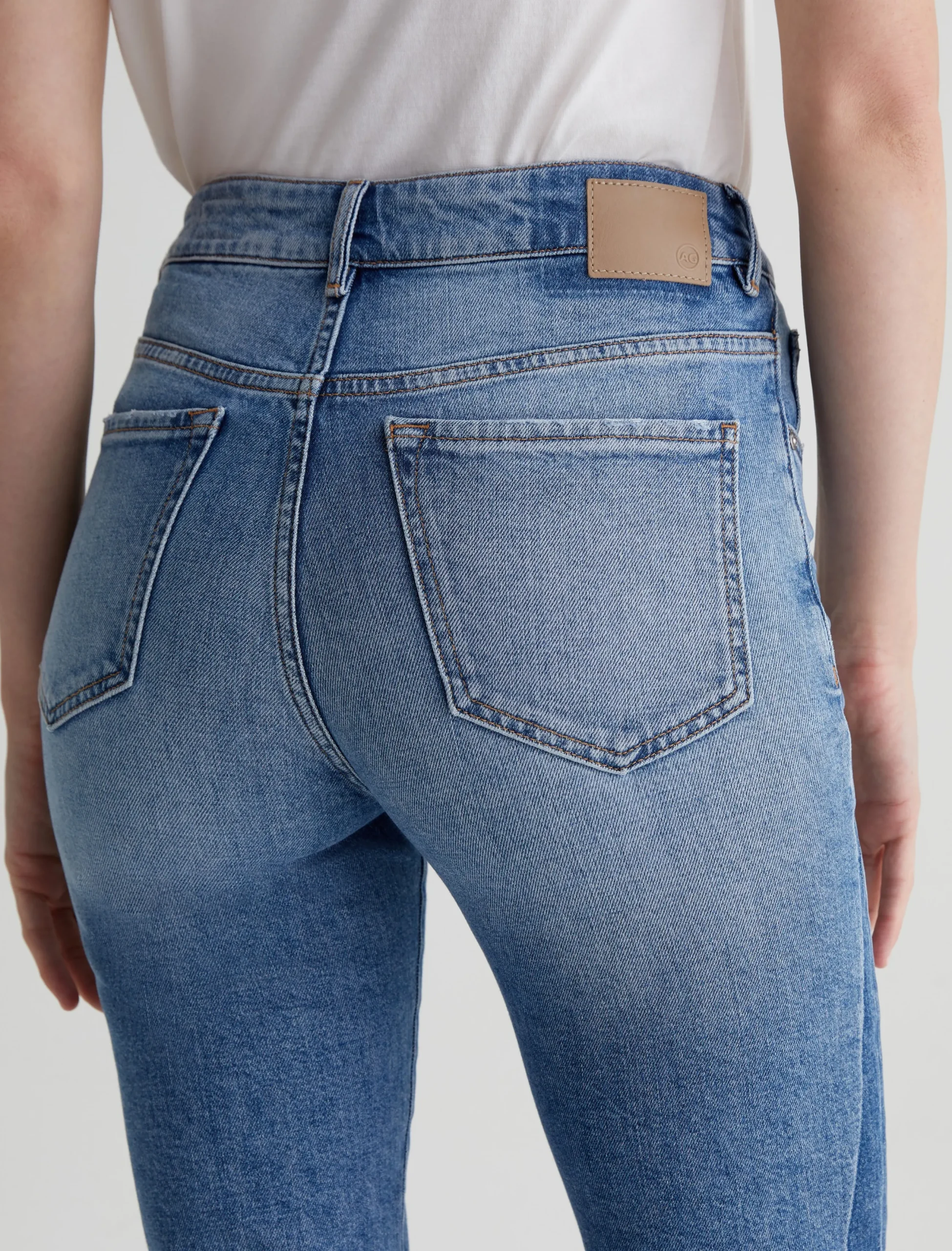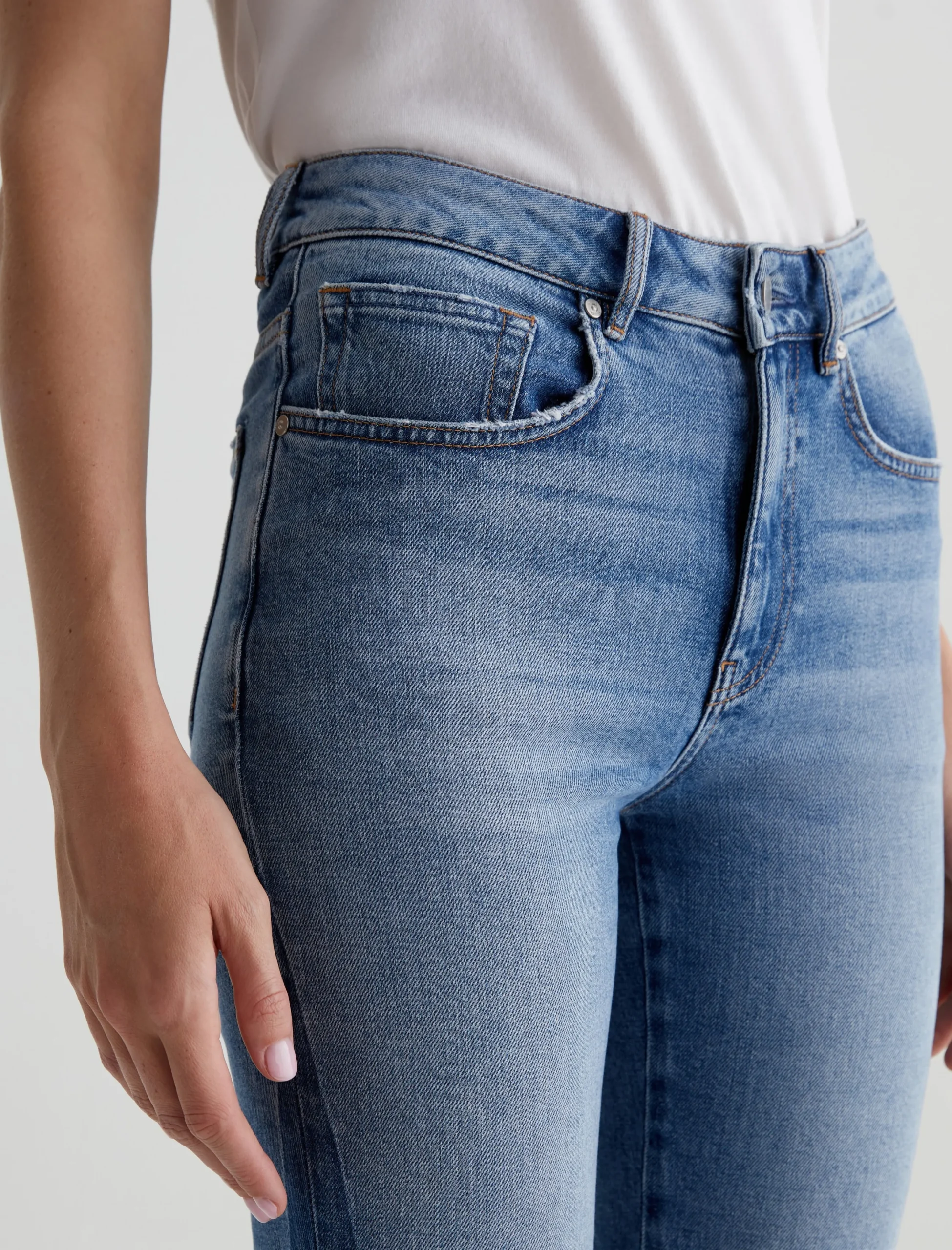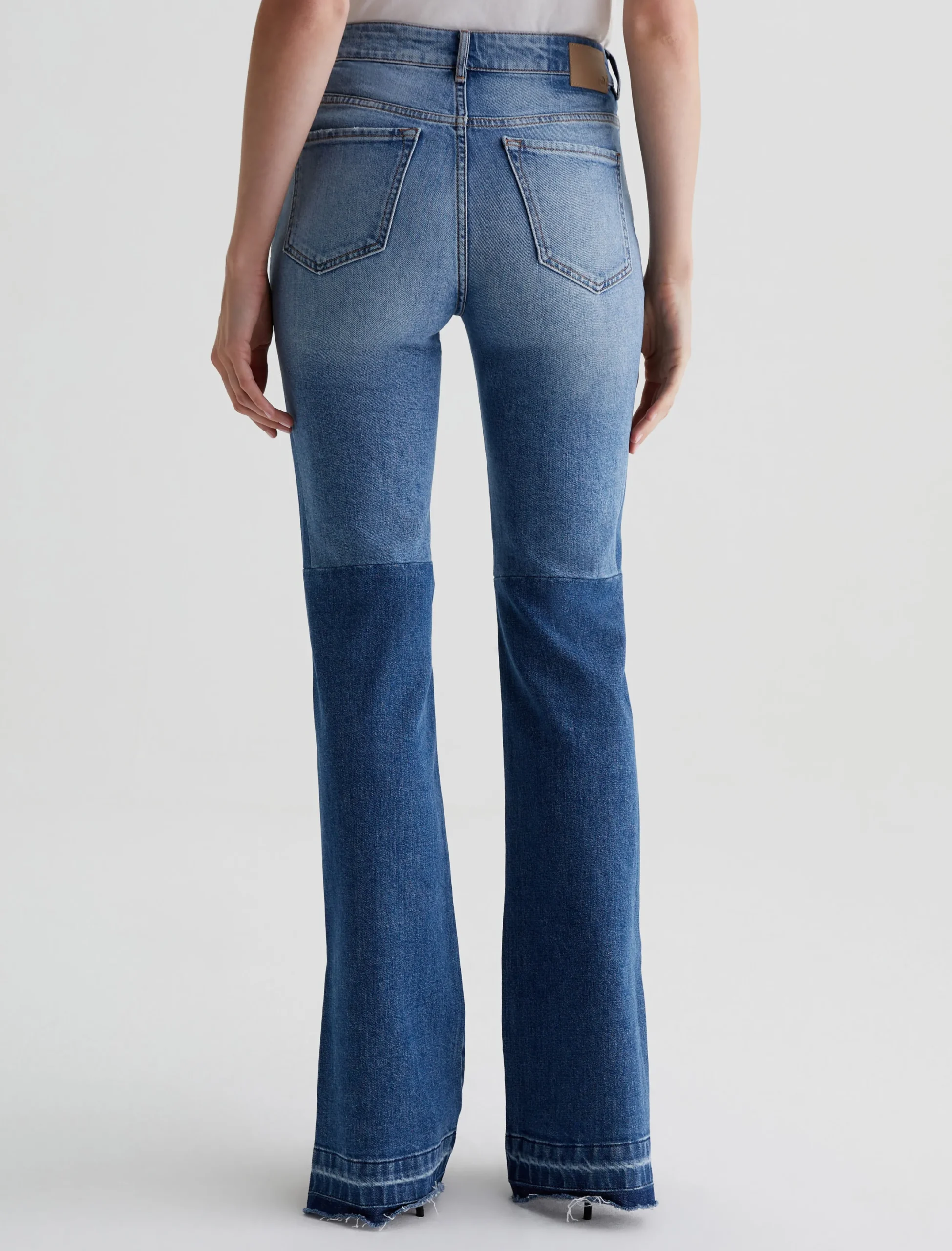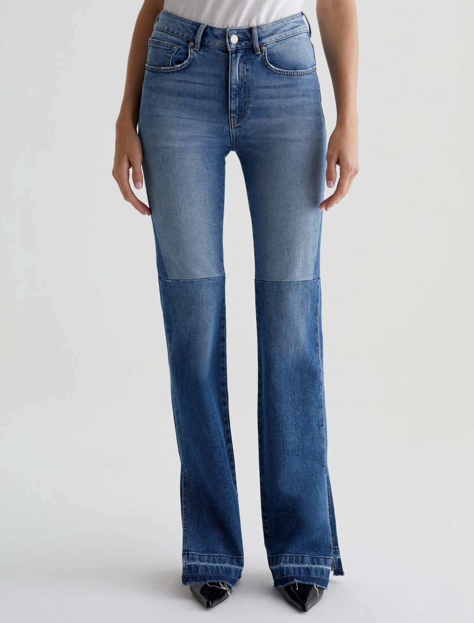 The Cannes jean is a ’70s-inspired bootcut silhouette with faded two-tone denim paneling at the legs. The pair fits close through the knee before kicking into flared let-down hems with split sides. Whiskering and worn pocket edges add a weathered finish.