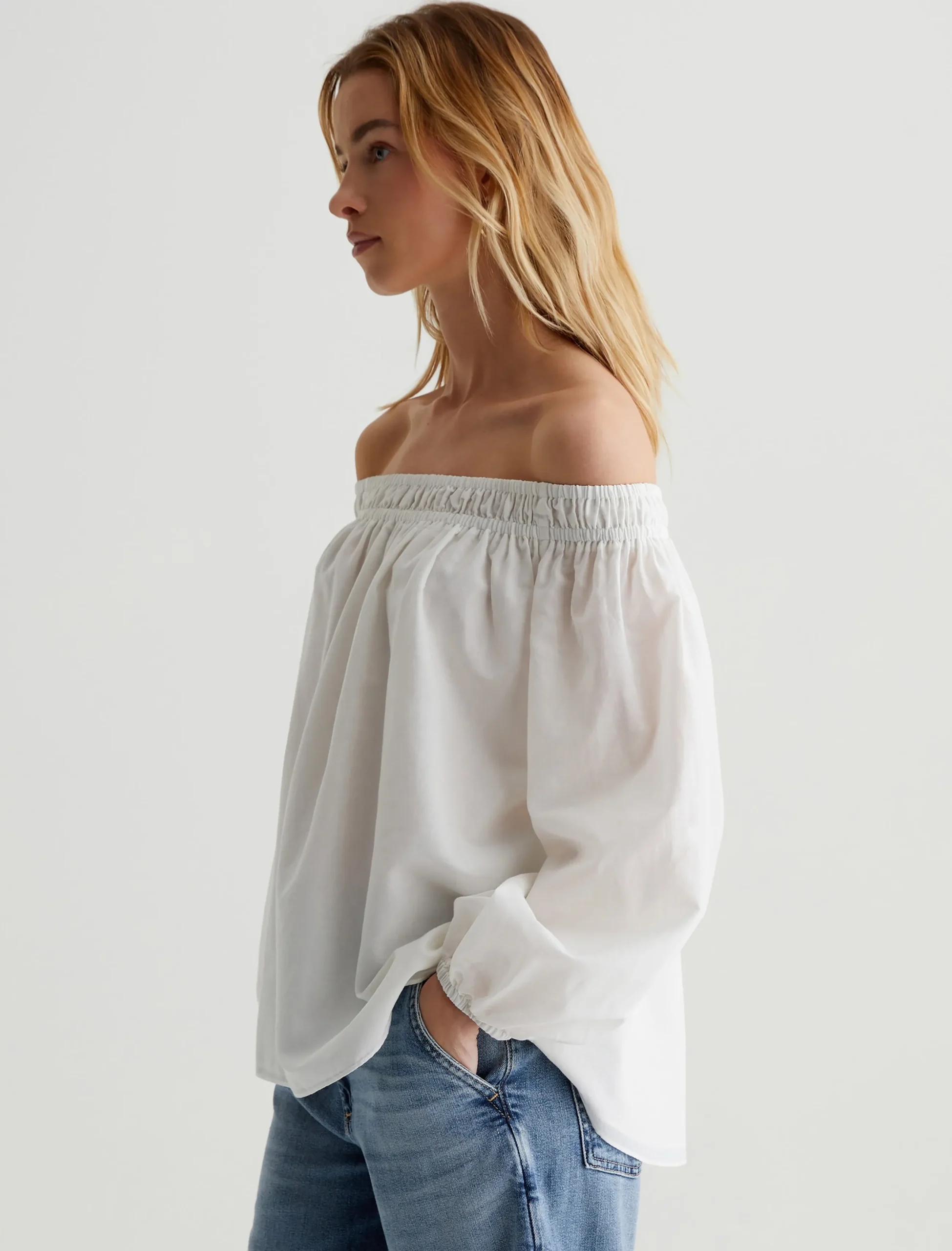 The Carroline Top has an off-the-shoulder silhouette in airy cotton silk voile. Defined by a stretch-enhanced shirred neckline, this white peasant blouse is relaxed and billowy with voluminous long sleeves.