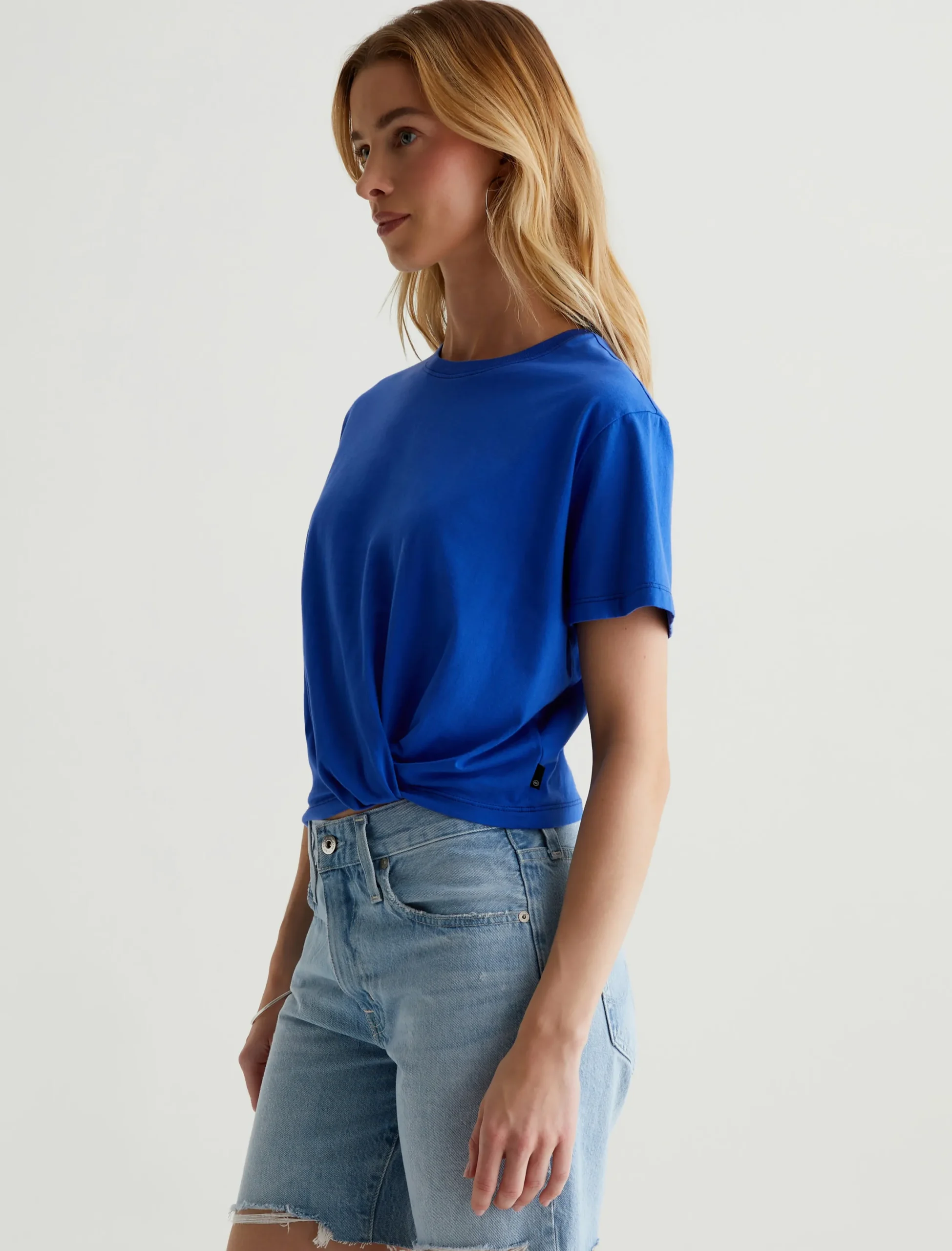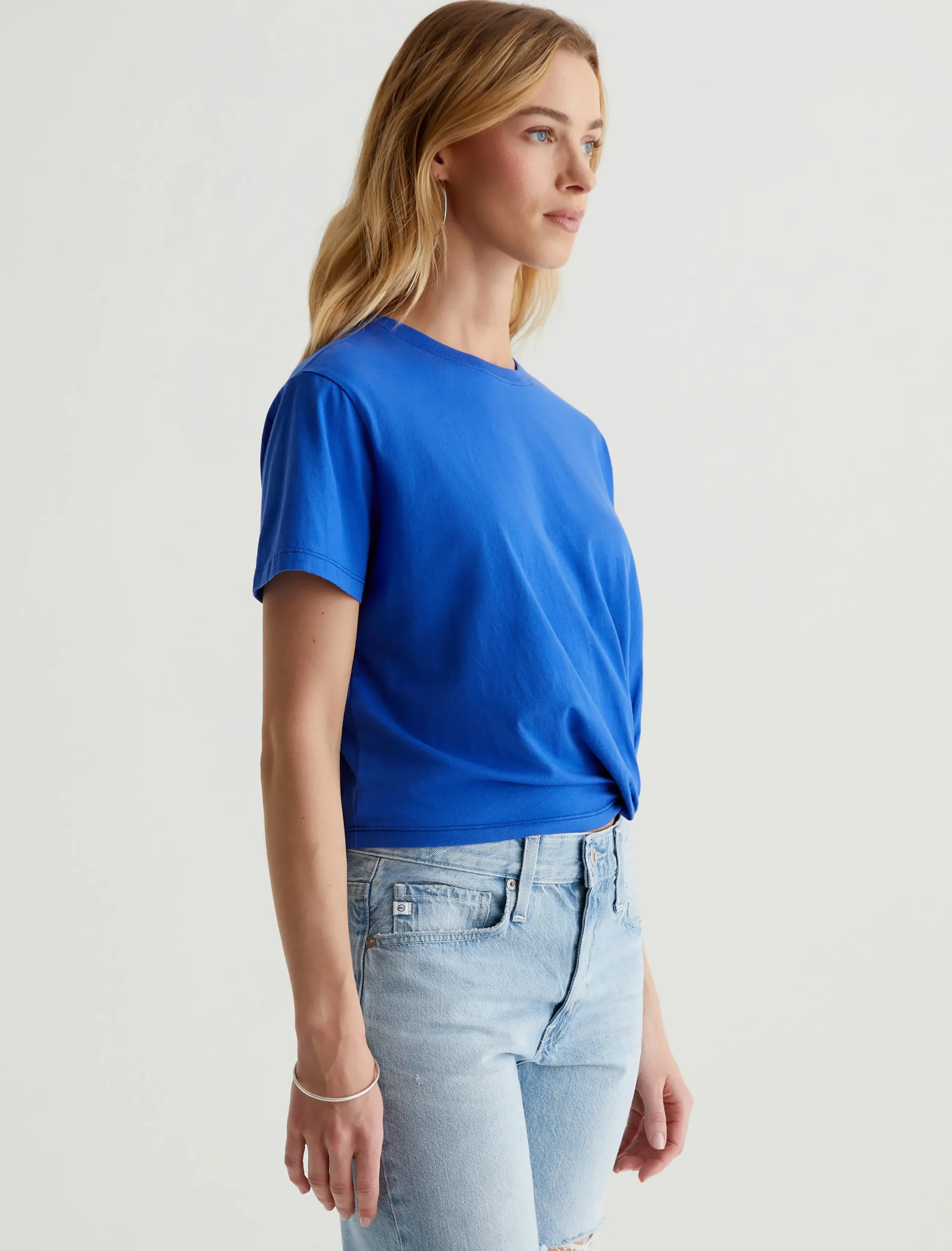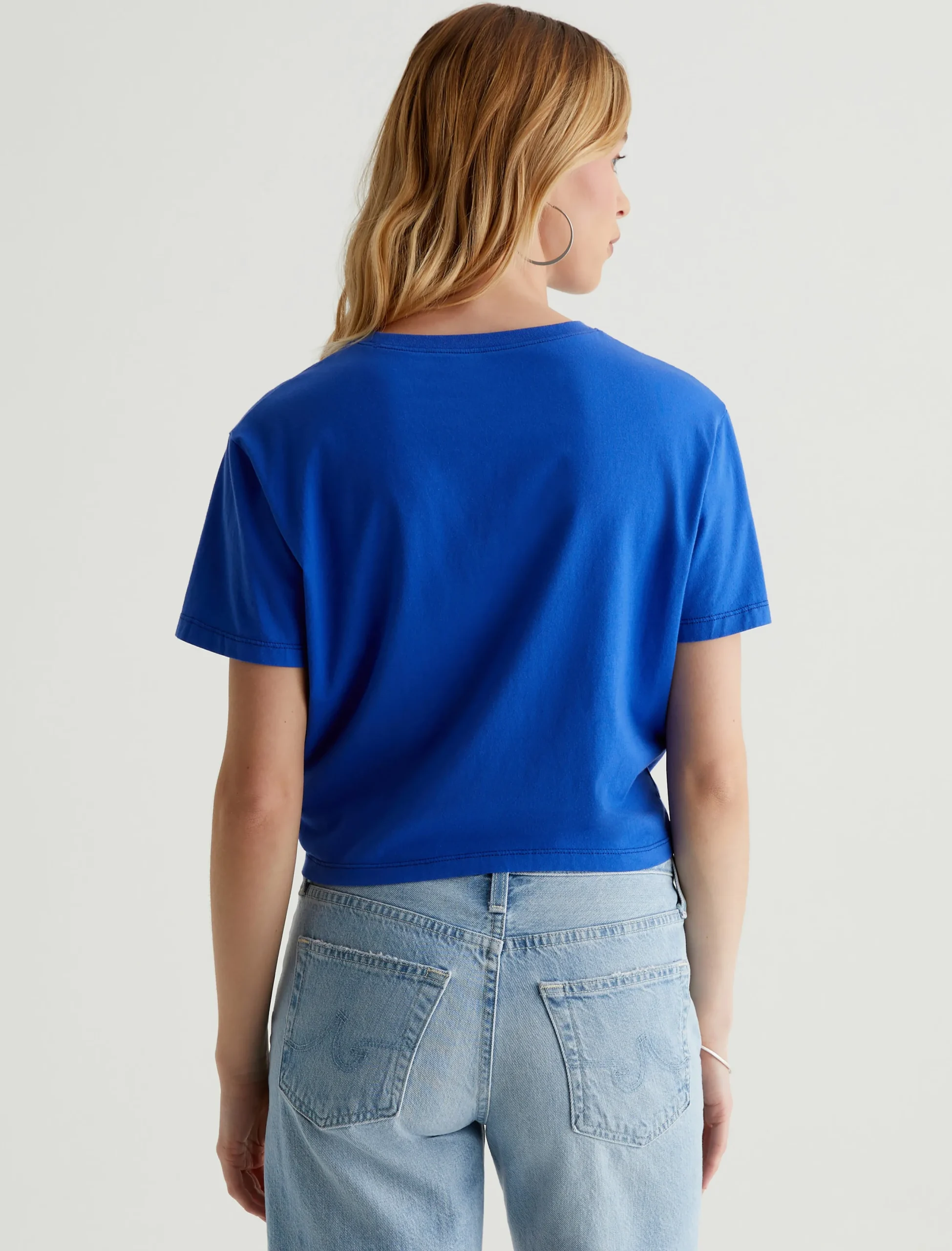 The Ciara Tee has the appearance of a tucked boyfriend T-shirt with a clean, coordinated fold at the hem. Crafted from a soft cotton blend in a bold blue shade, this short-sleeve style features a cropped silhouette that’s boxy at the shoulders and narrower at the waist.