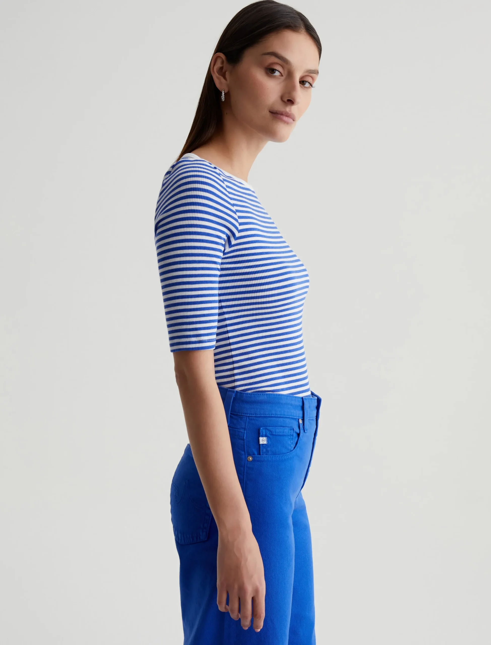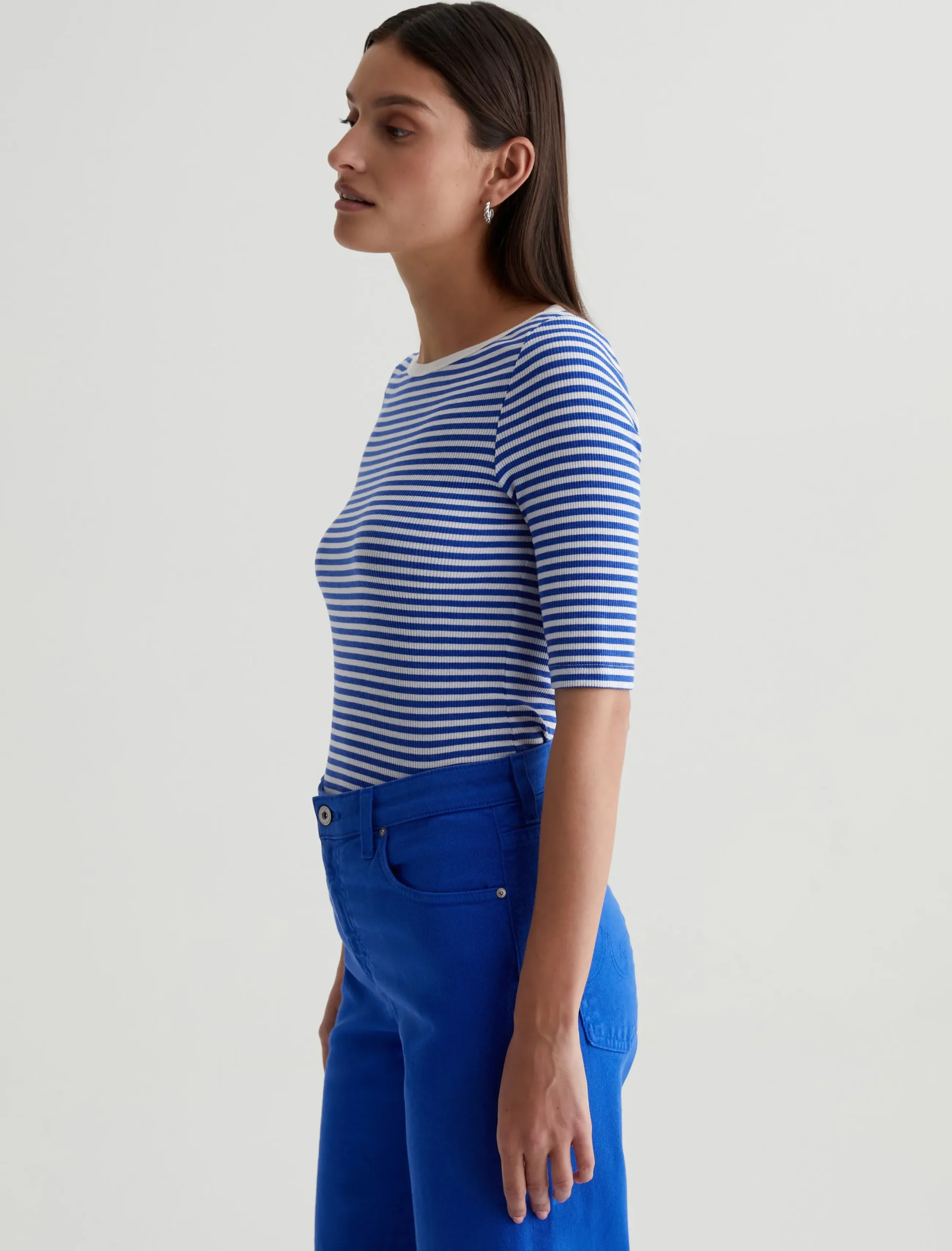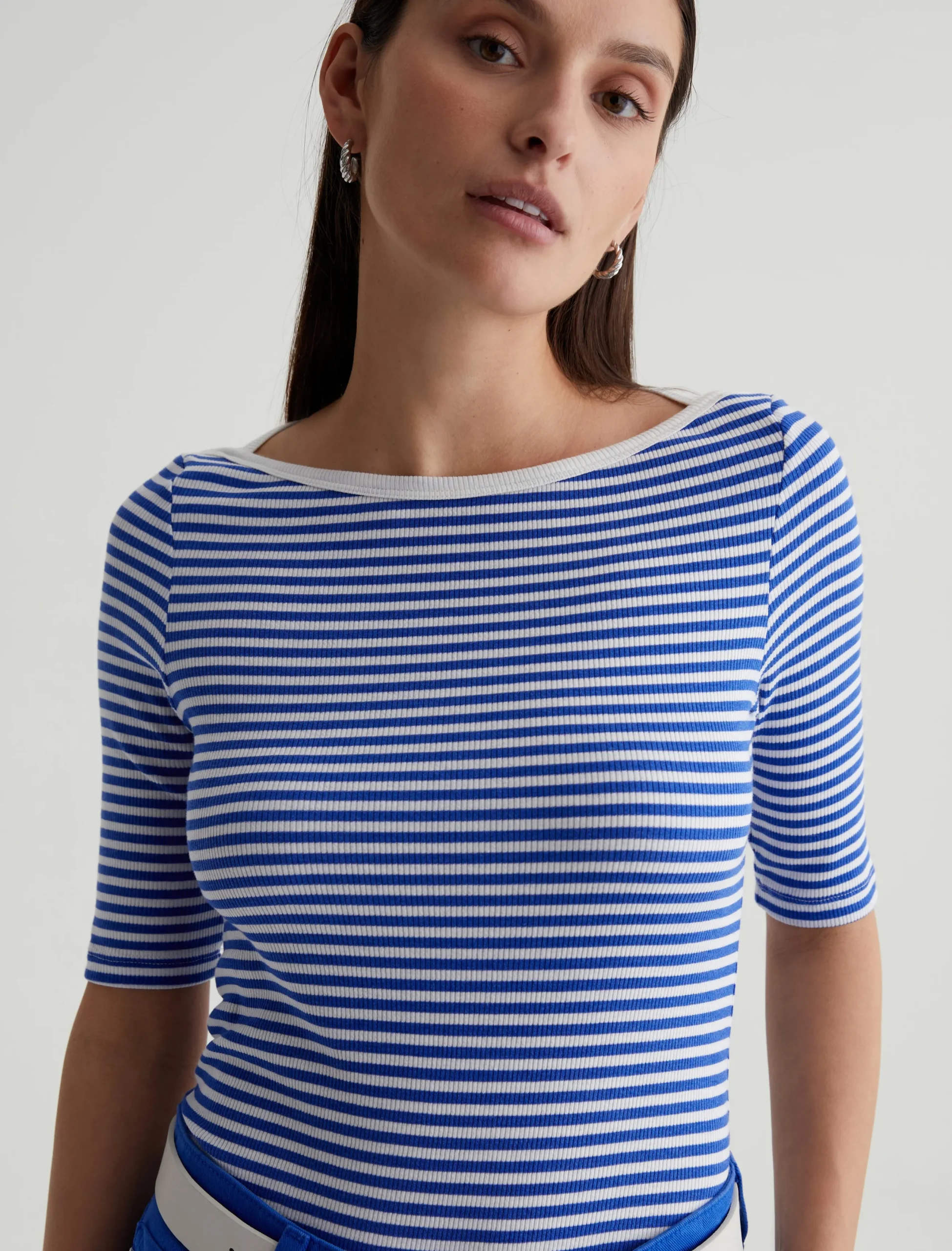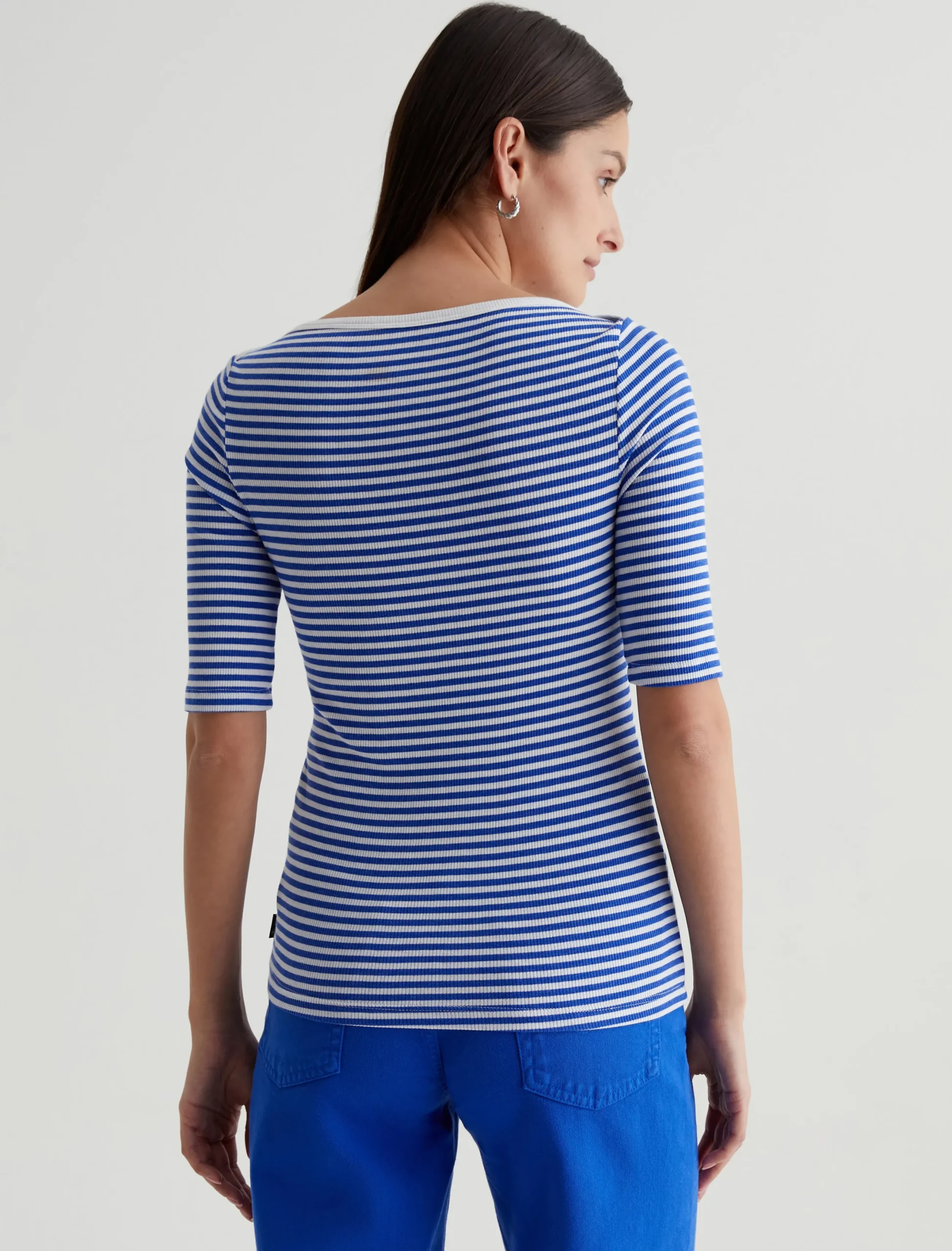 A nod to classic French styling, the Connie Top has a slim fit with an elegant boat neck and sleeves that land just above the elbow. It’s soft and comfortable in a striped cotton-blend rib knit accented by white binding at the neckline.