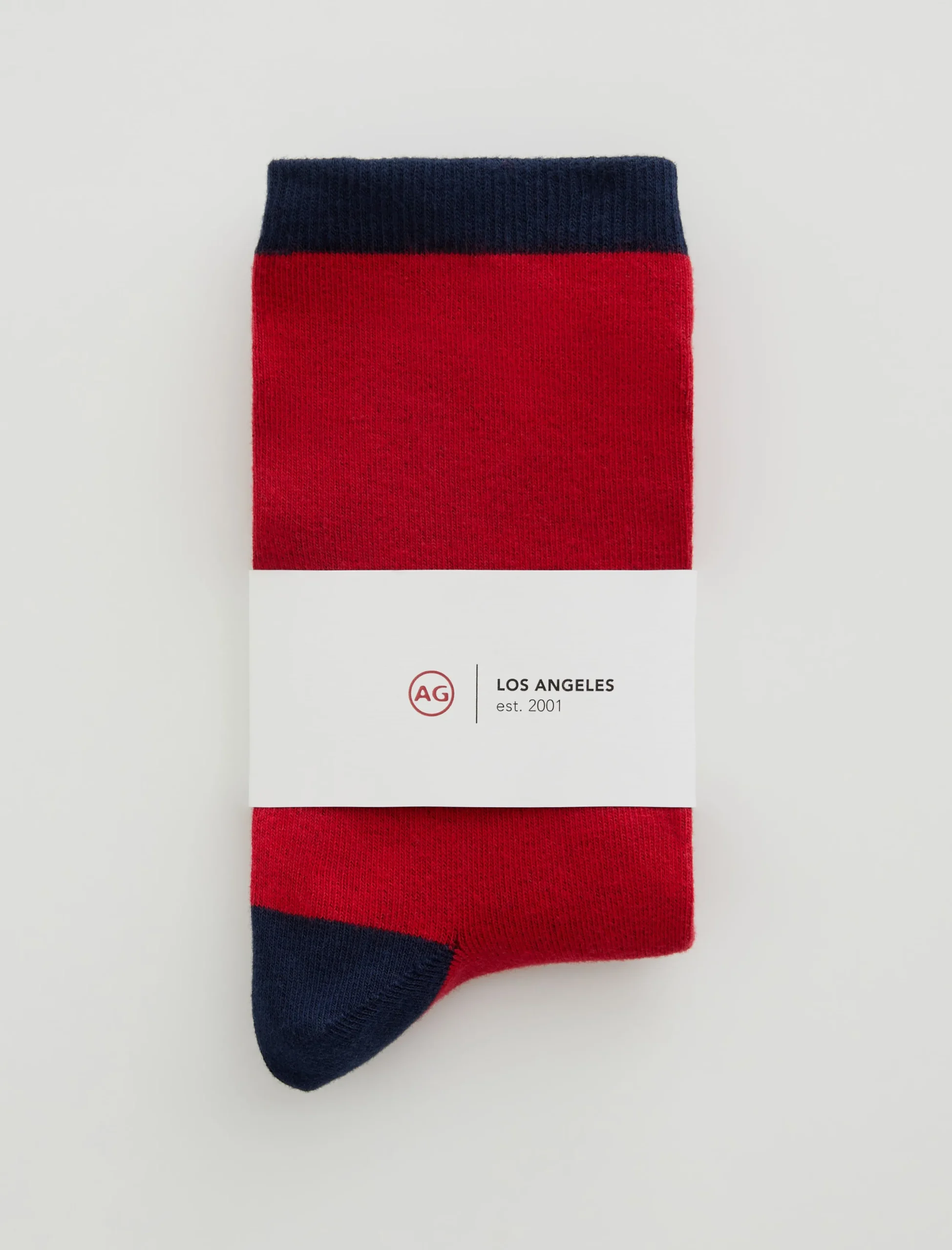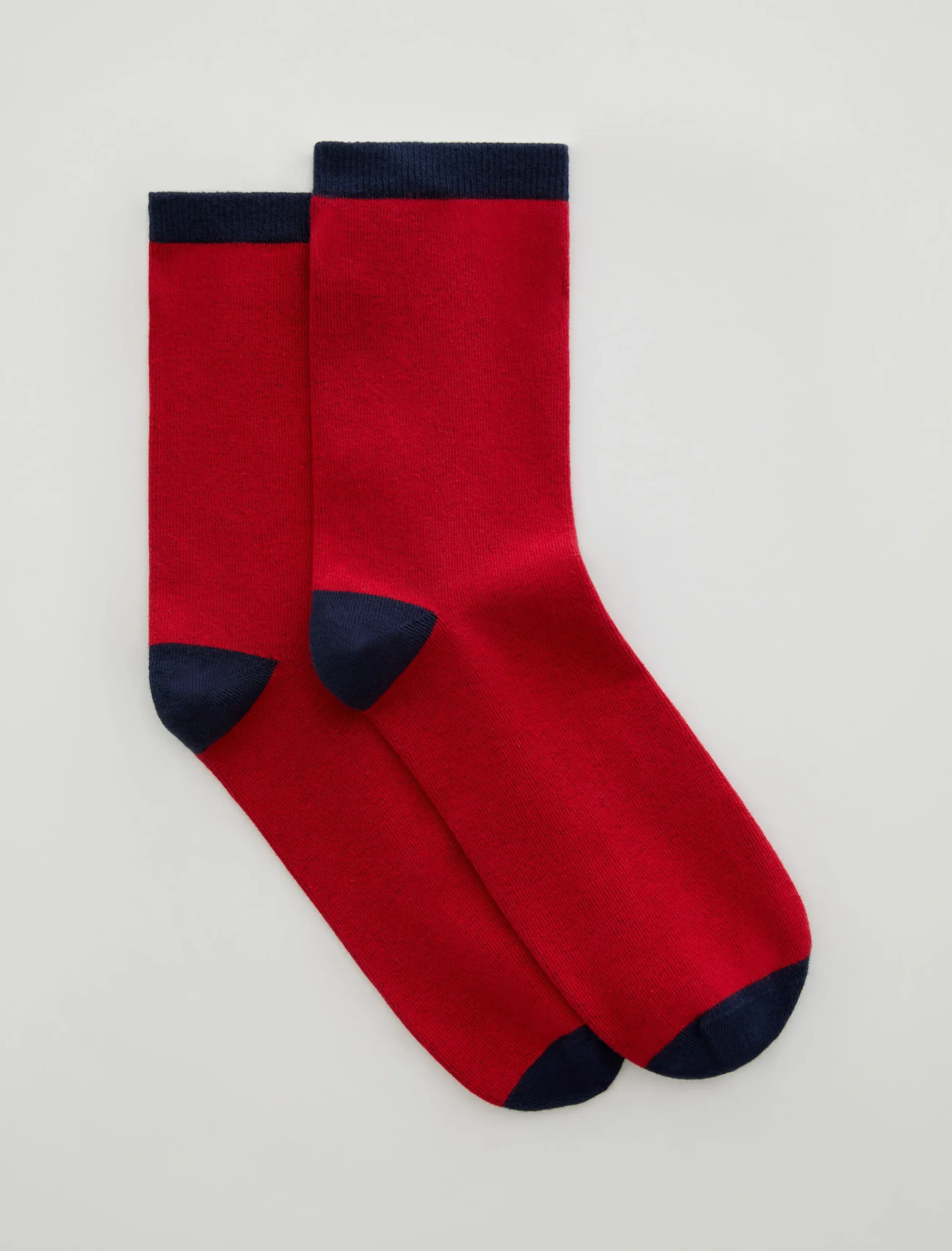 This sock is our classic crew sock. Featuring a red and navy color block, this pair has been knitted from a comfortable cotton blend and ribbed through the ankles.